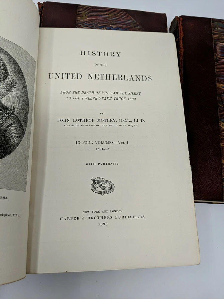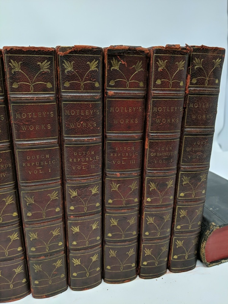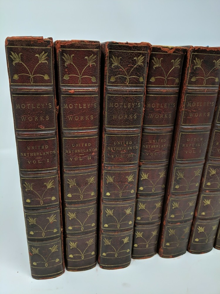1898 Motley's Works - Dutch Republic, Netherlands, Barneveld - Leather. Illustrated. Dutch Republic Vol 1 - good Dutch Republic Vol 2 - Good Dutch Republic Vol 3 - front cover hanging on by thread; otherwise good John Barneveld Vol 1 - good John Barneveld Vol 2 - front cover hanging on by thread; otherwise good United Netherlands Vol 1 - front cover hanging on by thread; otherwise good United Netherlands Vol 2 - good United Netherlands Vol 3 - front cover hanging on by thread; otherwise good United Netherlands Vol 4 - good Shipped with USPS Media Mail.