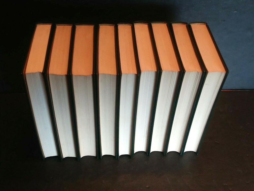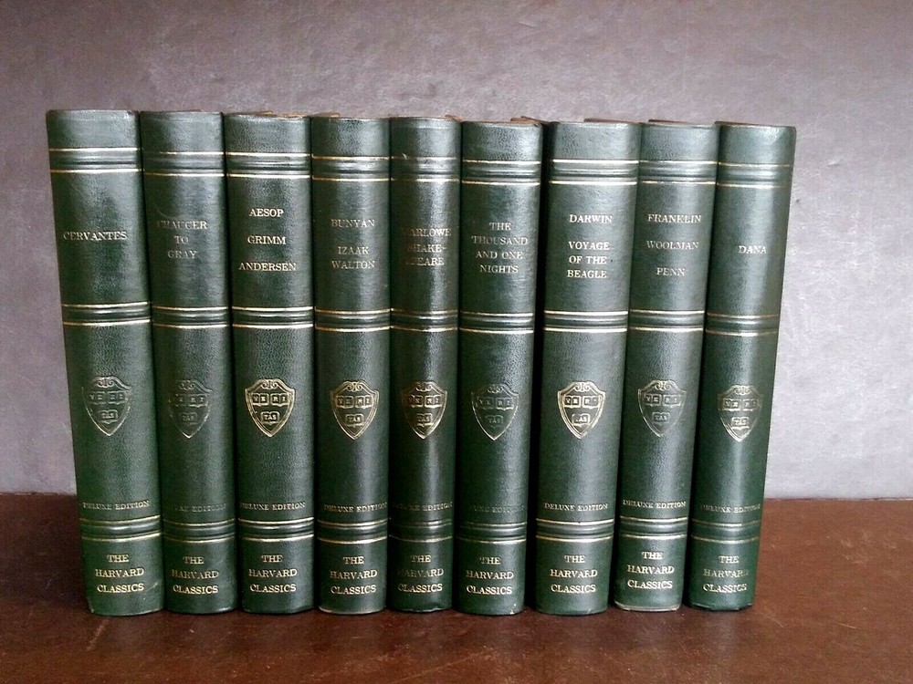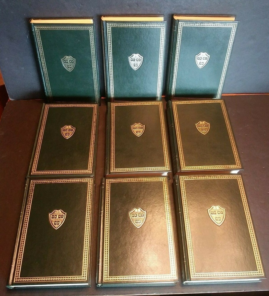 This is a set of 19 hardcover books, Harvard Classics; Deluxe Registered Edition; Green Leather (at least I believe they are made of leather but I am not positive); dated 1937 and 1938. Condition: These vintage books are in used condition. The outside covers have some shelf wear and one book in particular has a lot of fading to the gold. The interiors of the books are in very good condition. I do not see any handwriting or highlighting. Some of the books are in extremely good condition on the inside. Please note - I cleaned the outside of these books with a leather cleaner - and on some of them I used a "paste" type of leather cleaner/conditioner. So, some of the books feel like they have a waxy residue on them. The white exterior page area may be dusty or have some dirt marks. Please see photos for a better idea of the condition. Shipping: I ship 5 days per week and sometimes on Saturdays so that you receive your item quickly.