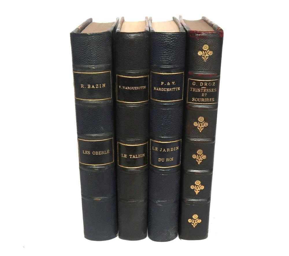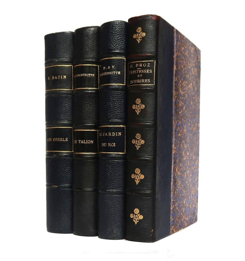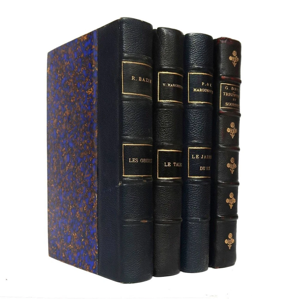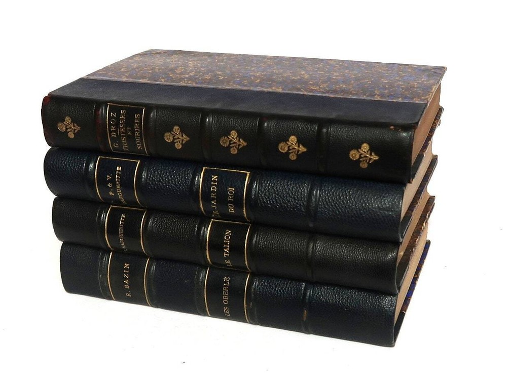 A beautiful collection of four (4) French antique books in dark blue tones. A great looking set to display on a table or shelf. 18.5 x 13 cm., aprox. French language. 1) "René Bazin: Les Oberlé". Circa 1900. Period half leather over marbled boards, raised bands, gilt to spine, marbled endpapers. Very good condition. 2) "Victor Margueritte: Le Talion". 1909. Period half leather over marbled boards, raised bands, gilt to spine, marbled endpapers. Very good condition. 3) "Paul et Victor Margueritte: Le Jardin du Roi". Circa 1900. Period half leather over marbled boards, raised bands, gilt to spine, marbled endpapers. Very good condition. 4) "Gustave Droz: Tristesse et Sourires". 1901. Period half leather over marbled boards, raised bands, gilt to spine, marbled endpapers. Very good condition.