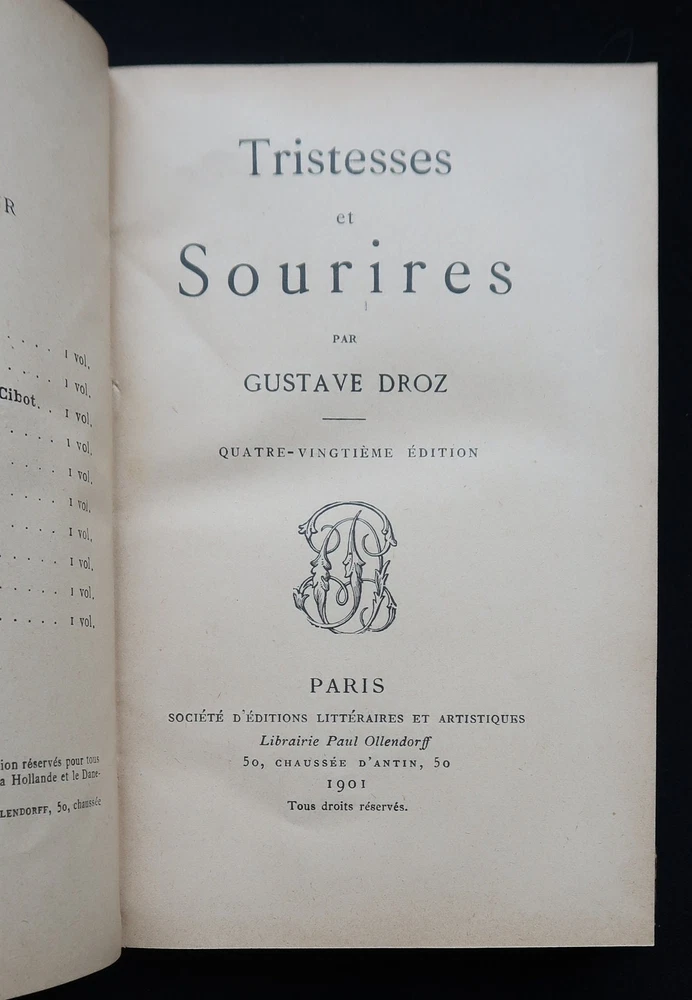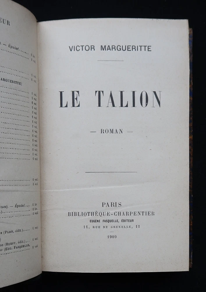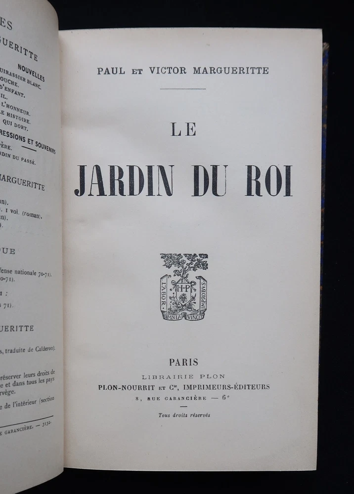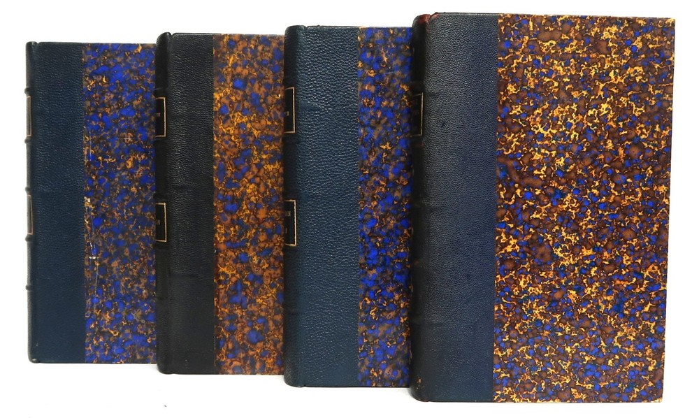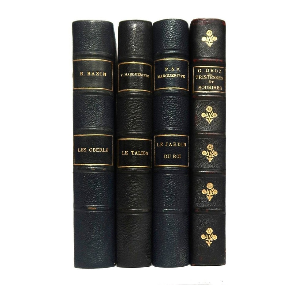 A beautiful collection of four (4) French antique books in dark blue tones. A great looking set to display on a table or shelf. 18.5 x 13 cm., aprox. French language. 1) "René Bazin: Les Oberlé". Circa 1900. Period half leather over marbled boards, raised bands, gilt to spine, marbled endpapers. Very good condition. 2) "Victor Margueritte: Le Talion". 1909. Period half leather over marbled boards, raised bands, gilt to spine, marbled endpapers. Very good condition. 3) "Paul et Victor Margueritte: Le Jardin du Roi". Circa 1900. Period half leather over marbled boards, raised bands, gilt to spine, marbled endpapers. Very good condition. 4) "Gustave Droz: Tristesse et Sourires". 1901. Period half leather over marbled boards, raised bands, gilt to spine, marbled endpapers. Very good condition.