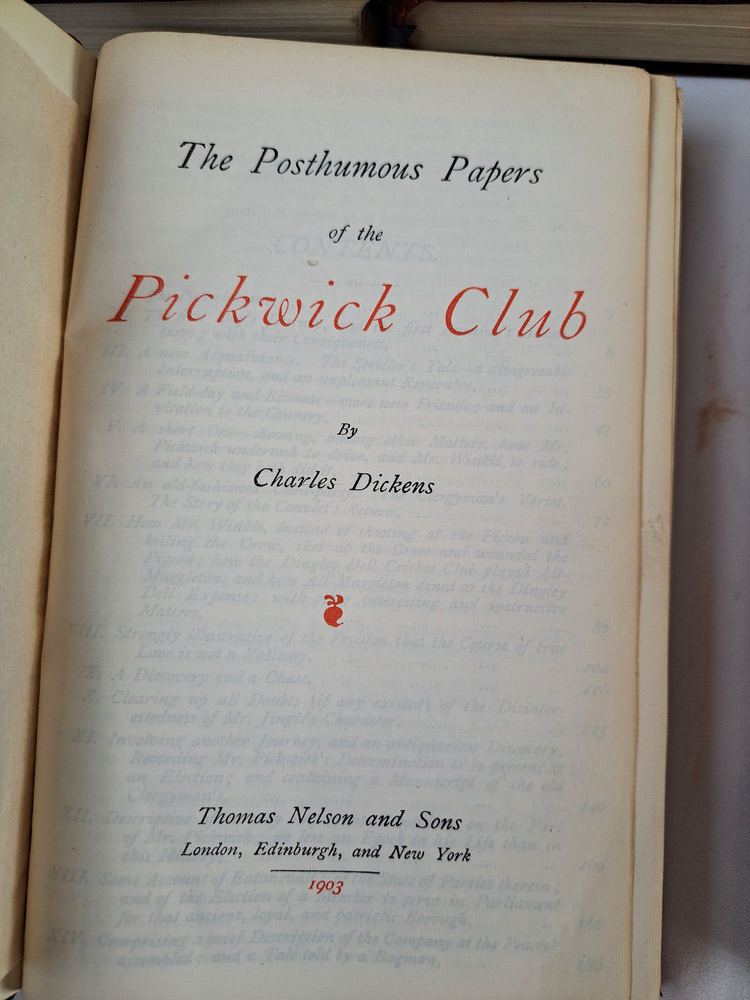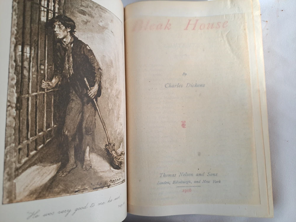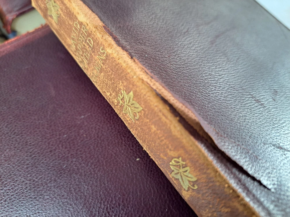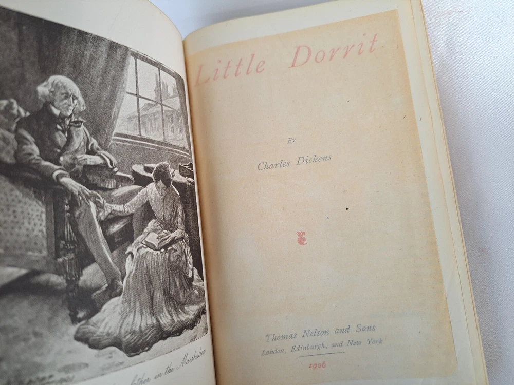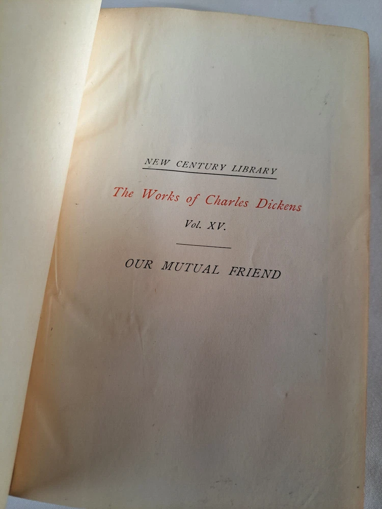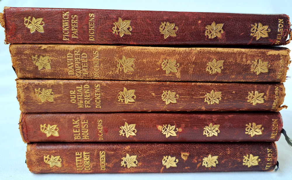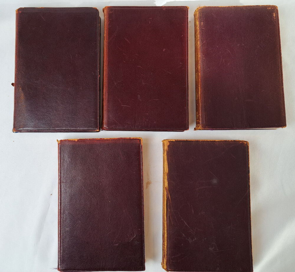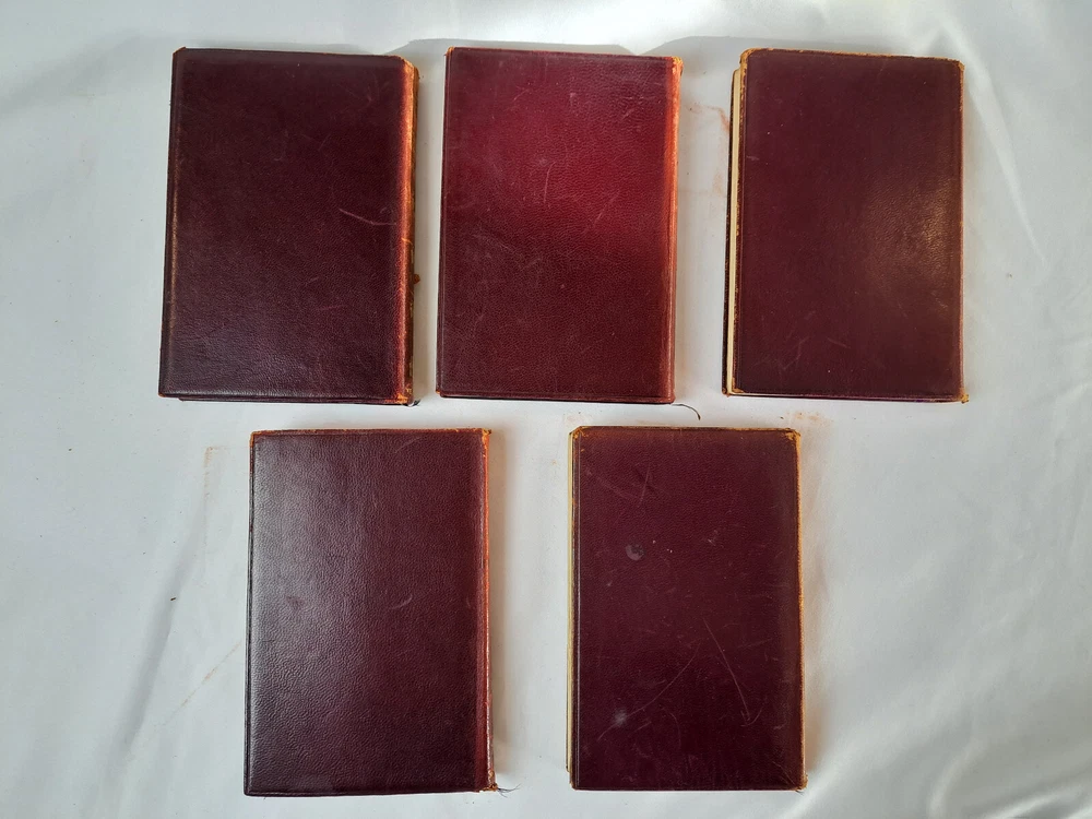 Five volumes of Charles Dickens in diminutive leather bindings. Matching bindings from a partial New Century Library set. Printed 1904-1906. 4" x 6 1/4". Titles: David Copperfield Bleak House Our Natural Friend Pickwick Papers Little Dorrit Condition: Very Good, but with some red rot to leather edges, some chipping to surface of leather along edge of spine on David Copperfield. Solid bindings, clean inside. Attractive grouping for a shelf. Shipping: US shipping. USPS Media Mail. Priority available. Ships within two business days of cleared payment. I combine shipping as much as possible. I will do everything I can to make sure you are satisfied with your purchase and would love to have your 5 star feedback! If you are not happy, please let me know and I will do my best to make it right! Returns accepted, buyer to pay return shipping.