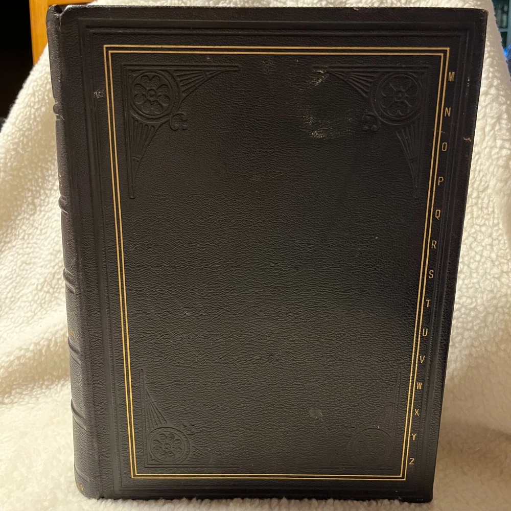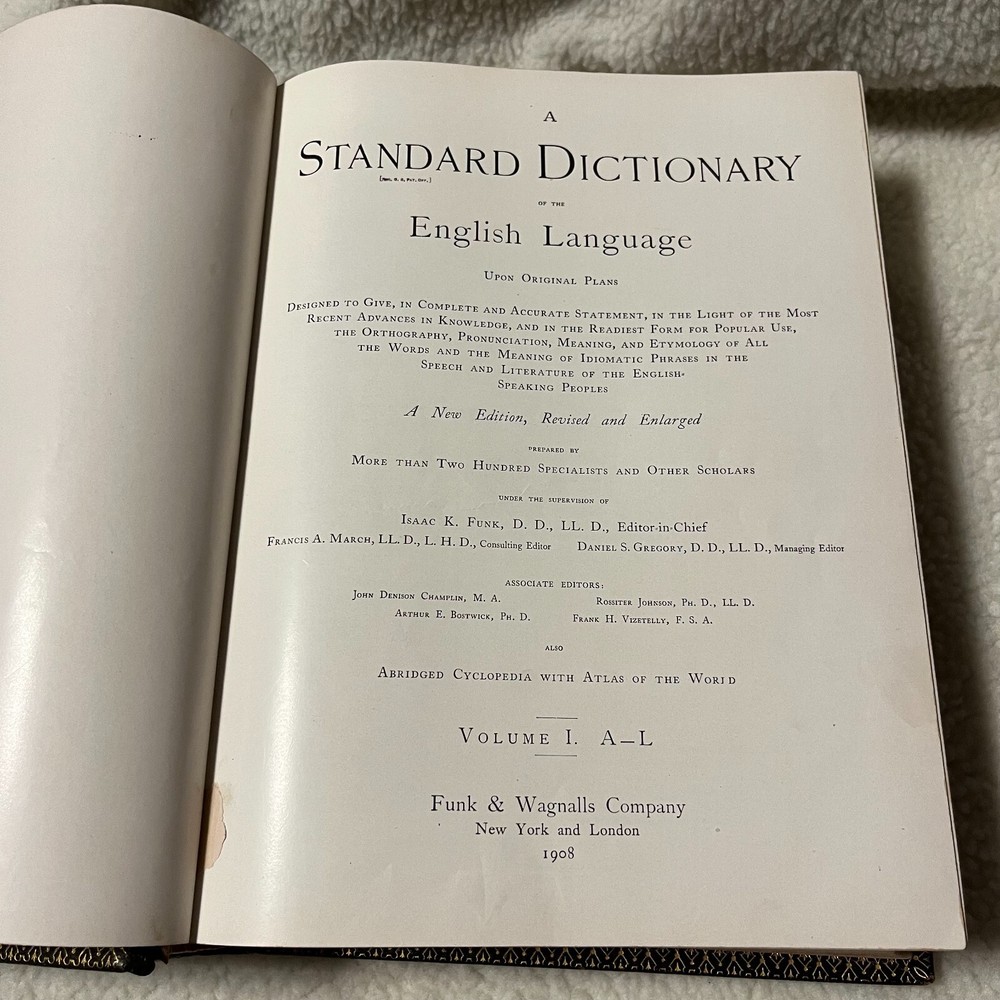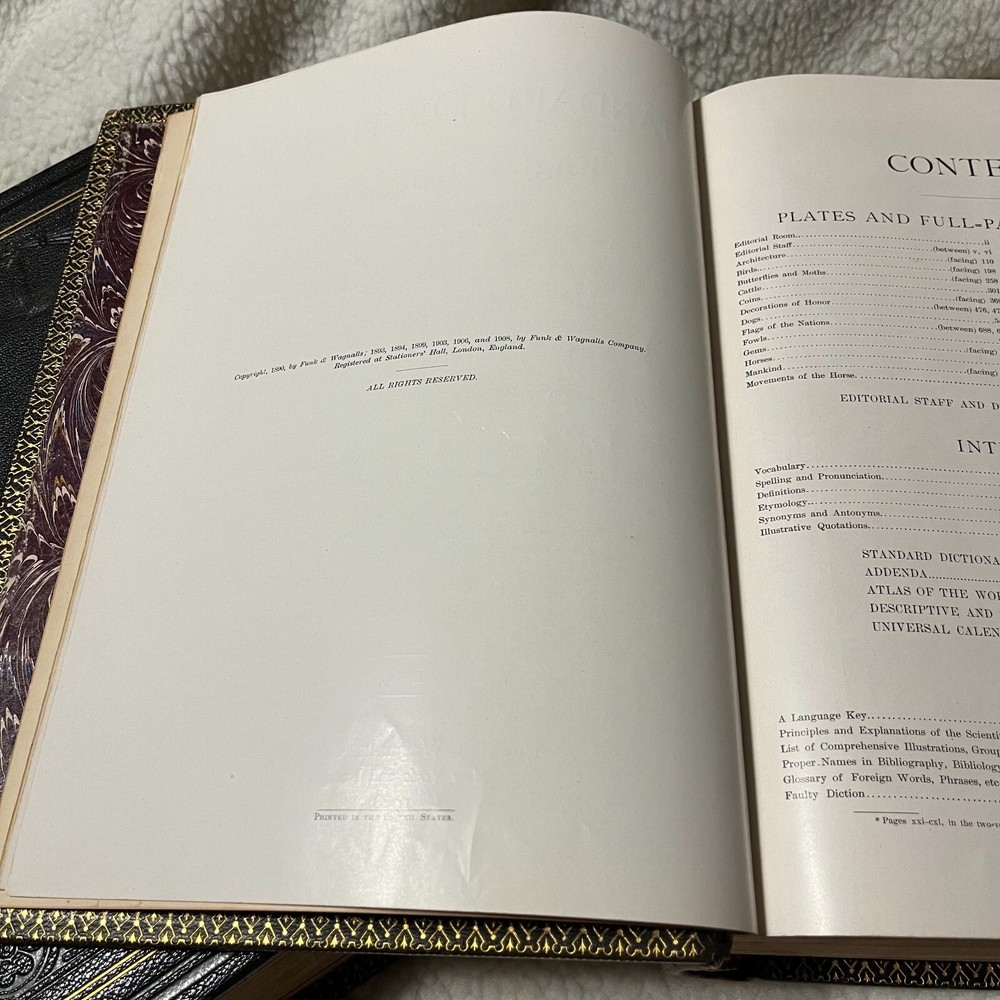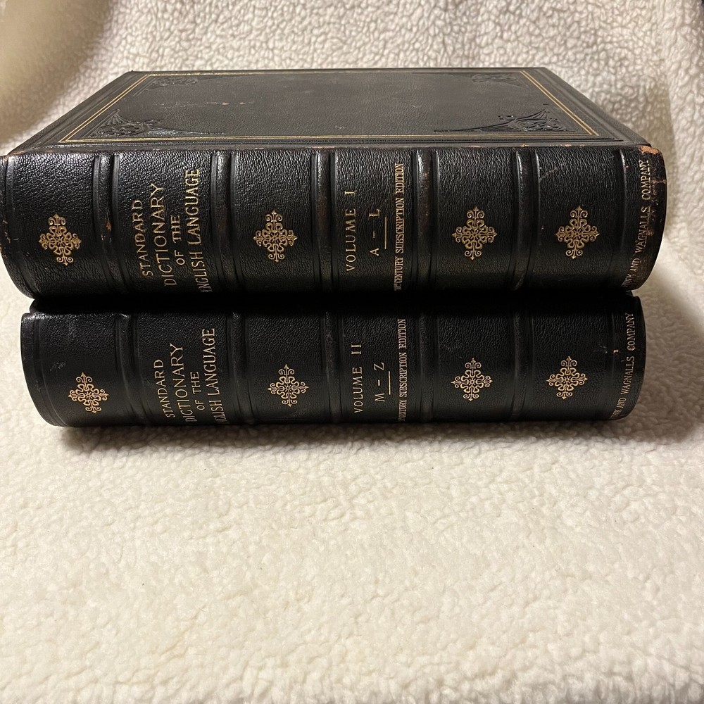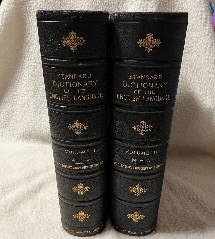 1908 FUNK WAGNALL 2 VOL STANDARD DICTIONARY ENGLISH LANGUAGE 20TH CENT SUB ED Beautiful Antique and Collectible 2 volume set of Funk & Wagnall Standard Dictionary of the English Language. Published in 1908 (117 years ago!) this is a special 20th Century Subscription Edition. It is leather bound, black, with embossed floral designs on both front and back covers. Gold toned detailing accents on front and back covers. The spines feature more beautiful gold toned design and lettering. Burgandy and cream colored end papers. Both fronts and backs have gold toned alphabetized tabbing for look-up ease. There is also alphabetized tab indexing directly notched into the book pages, which alternately state, " Improved Index", CH Denison's Pat", Pat Oct 7, 1884". Books are large and each measure approx: 12.5" high X 10" wide X 2.5" thick. Total weight of both books is approx 18.2 lbs. The two volume set features eight pages of the more than two hundred specialists and other scholars who, under the the supervision of Editor-In-Chief Isaac K. Funk, prepared this complete two-volume set which provides an informative dictionary of the English Language as it was at the turn of the century. Volume I comprised word definitons for letters A-L. Volume II comprises word definitions for letters M-Z. This complete set of two volumes is a New Edition Revised and Enlarged, and includes: Abridged Cyclopedia, Atlas Of The World with color illustrations, Universal Calendar, Appendix, Language Key, Glossary Of Foreign Words, Disputed Spellings and Pronunciations, Abbreviations And Contractions, Symbolic Signifigance of Flowers And Gems, and much more. The two volume set is beautifully illustrated throughout, with parchment overlays of color plates. This is, indeed a comprehensive and amazing reference work. There is a Numbered Book Plate which reads, "No. 151312 Property of" with lines to print name. Also included is blue colored paper insertion which details, "How to Find a Word". This 1908 two volume set is truly antique and collectible. A wonderful source of reference and a beautiful addition to any library. It would be a wonderful gift for graduates, writers, and all. Please read conditon notes and see photos. Please see my other items. I have a variety of great listings!