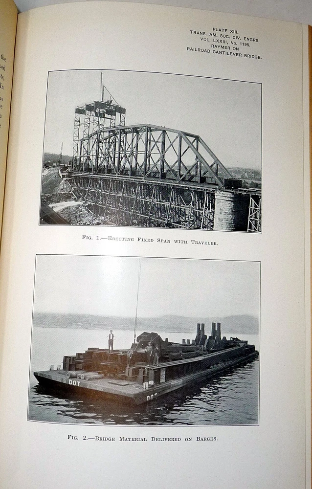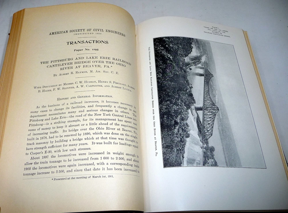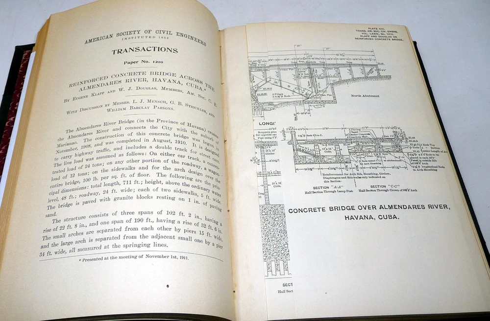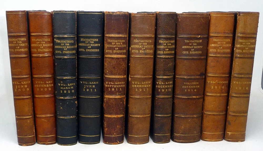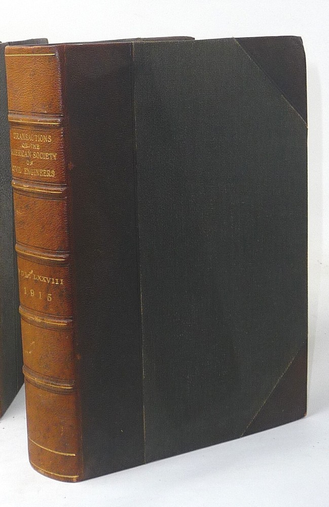 Transactions of the American Society of Civil Engineers, Set of 10, 1909-1915 Transactions of the American Society of Civil Engineers. New York: American Society of Civil Engineers. Ten Volumes: Vol LXV Dec 1909; Vol LXIII June 1909; Vol LXVI March 1910; Vol LXXIII Sept. 1911; Vol LXXIV Dec 1911; Vol LXXII June 1911; Vol LXXV Dec 1912; Vol LXXVII Dec 1914, Vol LXXVII 1915; Vol LXXIX 1915. Bound in half leather, with gilt titles and dates on the spines, marbled paper endpapers. Narrative, photographic illustrations, folding charts and maps and more. Narrative describes the work of society members all over the world. Some of the articles include railways in South America, Klondike pipeline, dams in Mexico, Istanbul arch dam, sewage, submerged pipe work at Portland, Or, storm water run-off, docks, concrete viaducts at Fort Worth TX, hydro electric power in Canada, a viaduct in Kansas City, impurities in sand for concrete, fire-resistant construction, Walnut Lane Bridge in Philadelphia, and much, much more. Good condition, internal repair to spine in Vol Dec 1909, front cover loose (but not detached) on Vol LXXIX 1915. Stamp of former owner on endpaper of each volume. Heavy set, weighs 24 pounds.
