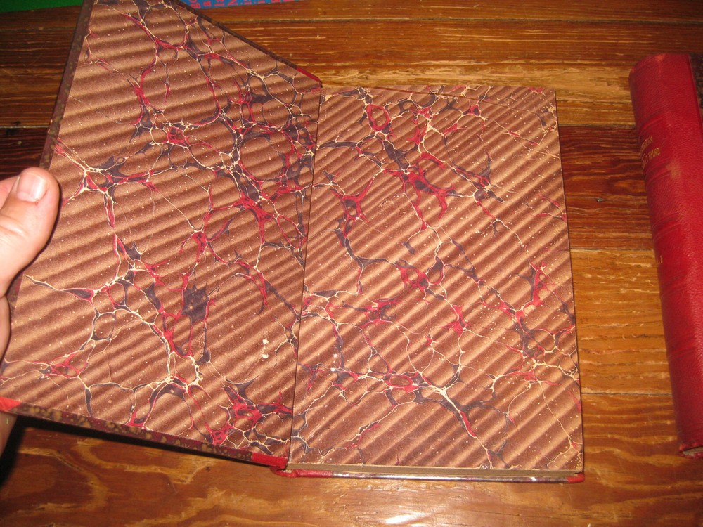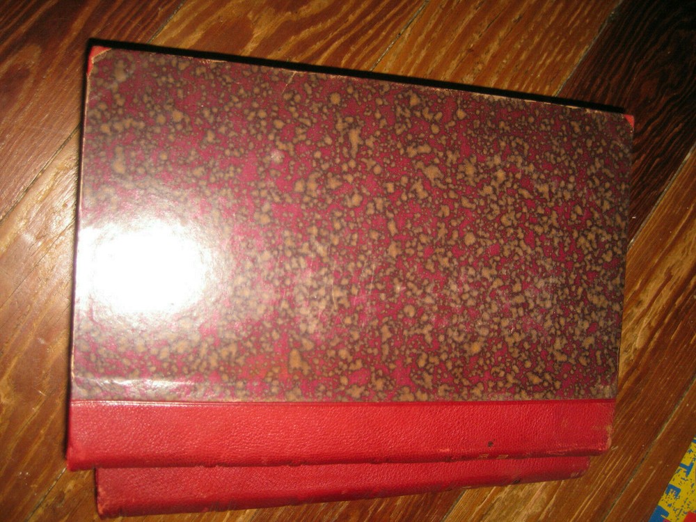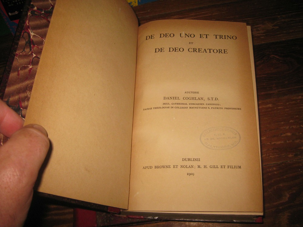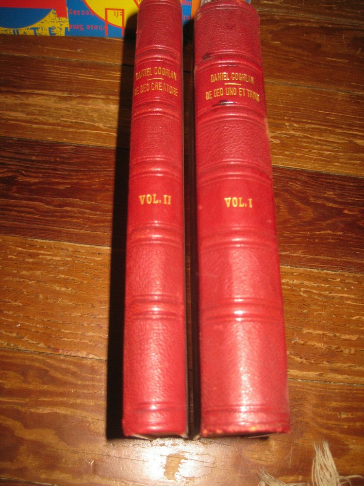 1909 2 volume red leather bound set Latin Catholic Theologocial hardcover God & creation.. in latin language, titled "De Deo Uno Et Trino Et De Deo Creatore"..by Daniel Coghlan.. both volumes are in good condition, marbled boards and cover pages, shows light wear and mild discoloration...