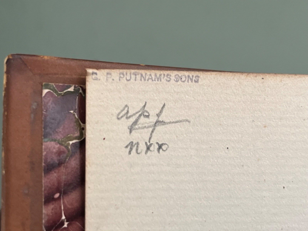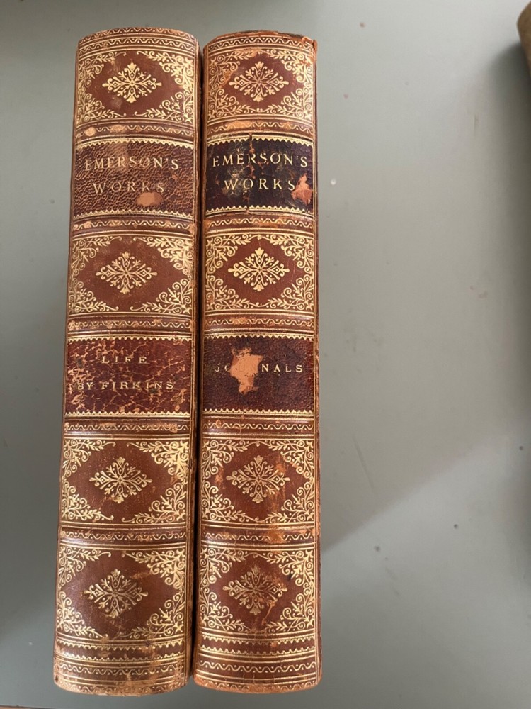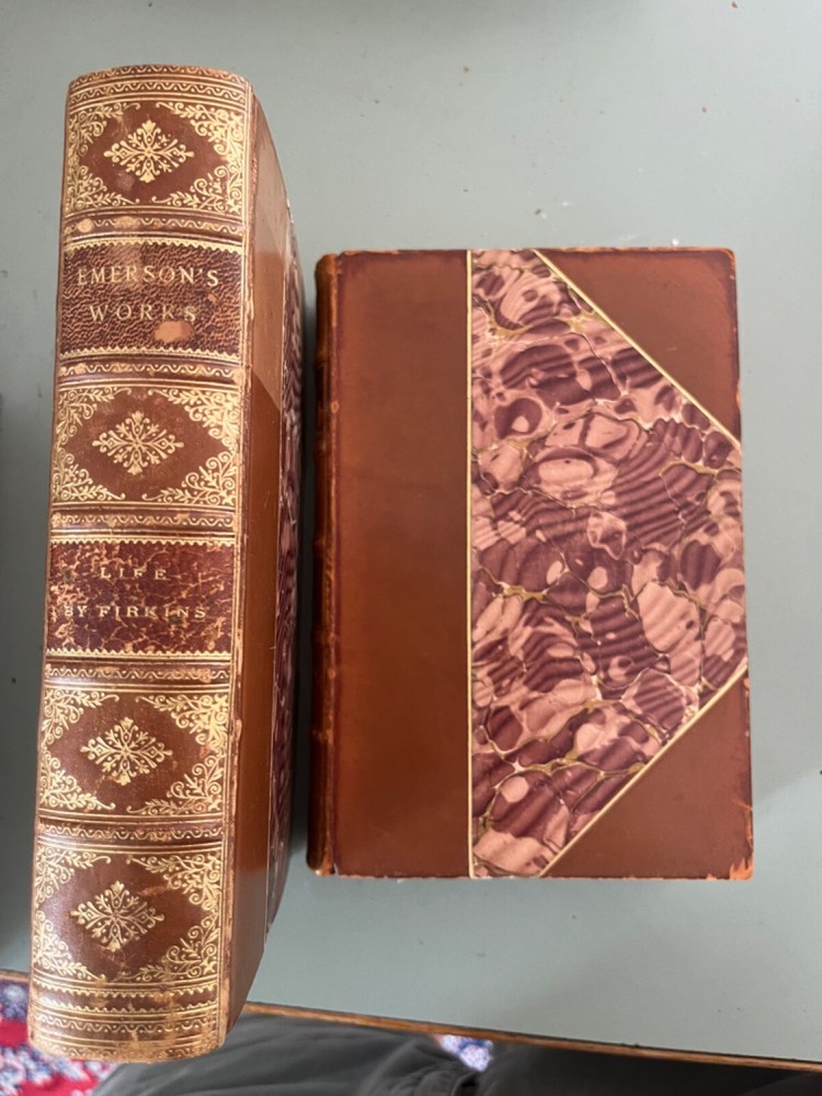 Two fine leather binding books concerning Ralph Waldo emerson. Each 8 x 5.5” book features leather and marbled covers. One was published in 1909, the other 1915. Includes a biography of emerson and his journals. Buyer to pay $9.95 insured shipping in US or 4 pounds priority international.