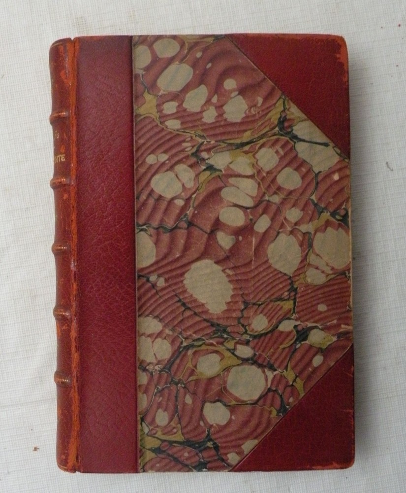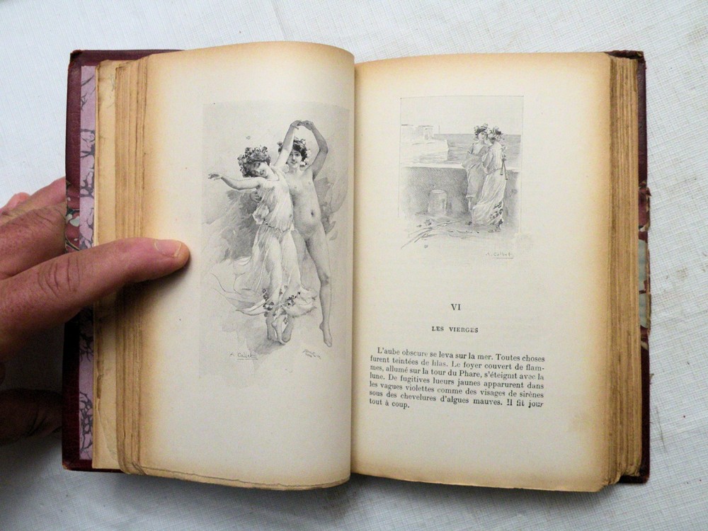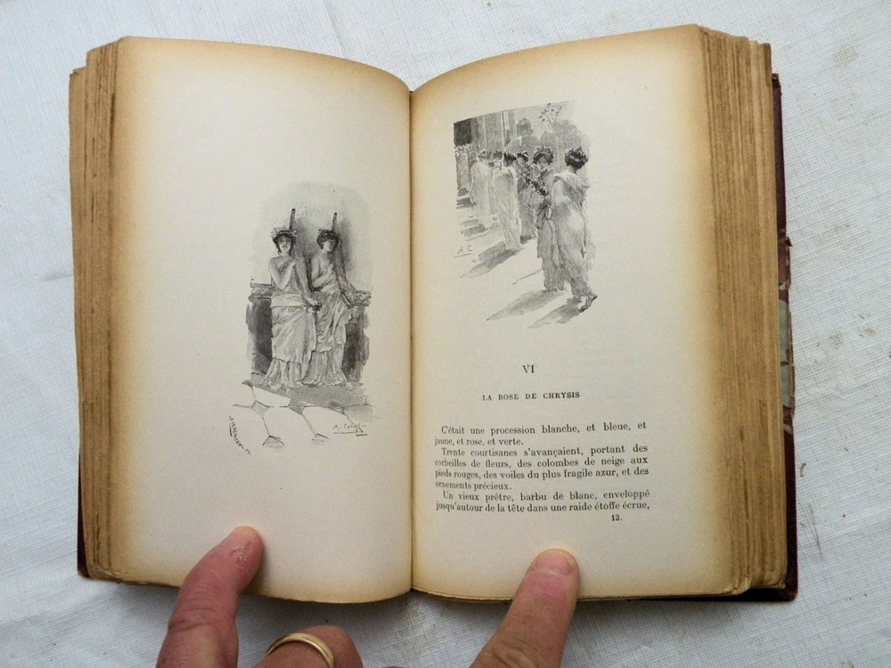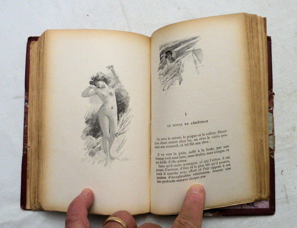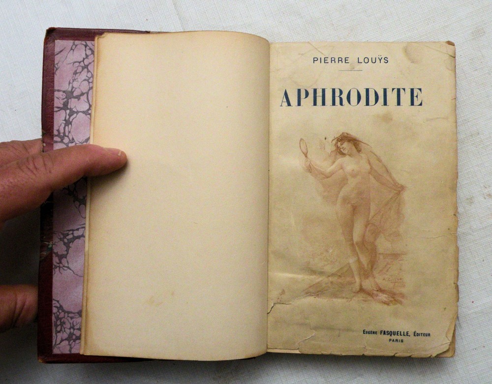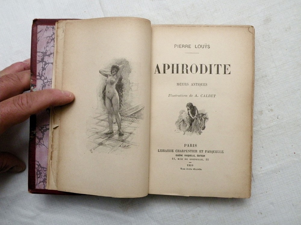 The title translates to, Aphrodite Ancient Morals. Published by Librairie Charpentier et Fasquelle in 1910. BEAUTIFULLY ILLUSTRATED BY A. CALBET. Fully in French. Black and white illustrations throughout, with larger illustrations beginning the chapters and smaller illustrations within the text. Leather and marble boards, There is wear where the boards meet the spine, mostly where back board meets the spine. Boards nonetheless remain solidly attached. Boards have light to moderate corner and edge wear. The title page is frayed around the edges and may have been detached at one point based on this evidence; if so, it is now solidly glued back into binding. There is also a tape repair behind title page. 338 clean and solidly bound pages. From Wikipedia: "Aphrodite: mœurs antiques ("Aphrodite: ancient morals") is an 1896 French-language novel by Pierre Louÿs...Set in Alexandria, the novel tells the story of Chrysis, a courtesan, and the sculptor Démétrios. A Galilaean with long golden hair (source of her Greek nickname), Chrysis is proud of her beauty and her skill at winning the devotion and servility of men. Démétrios, for his part, is worshipped by the women of the town, but has grown tired of their devotion. He has come to prefer his statue of the goddess Aphrodite even to his lover, Queen Bérénice, who posed for it. Chrysis is the only woman who does not care for him. Piqued into desire by her resistance, Démétrios is spurred to commit theft and murder for her, to win the three objects she demands in return for her charms: a rival courtesan's silver mirror, the ivory comb of an Egyptian priestess, and the pearl necklace that adorns the cult image in the temple of Aphrodite. After carrying out these errands, Démétrios dreams of the night of love that Chrysis has offered him and while she falls in love with the man who was moved to crime for her, Démétrios rejects the real Chrysis, sufficed by his dream. She presses her desire, so he makes her swear, as he had, to do his bidding, before revealing what it is: to wear the stolen items in public. She does so, appearing on the Lighthouse of Alexandria in the role of Aphrodite, nude and with the items worn as the attributes of the goddess. Imprisoned and condemned, Chrysis drinks hemlock in the indifferent presence of Démétrios. He then uses her nude body as a model, posing it in the violent attitude in which he had seen her in his dream, to create the statue of Immortal Life." B118