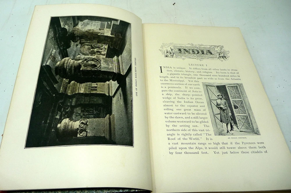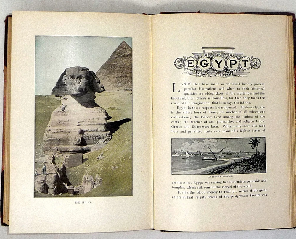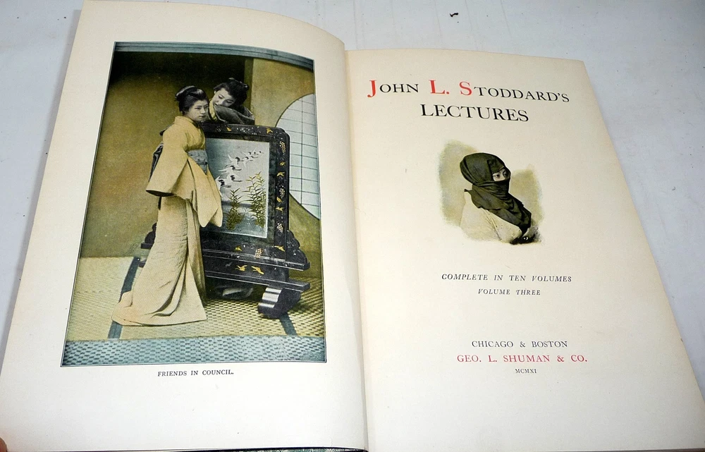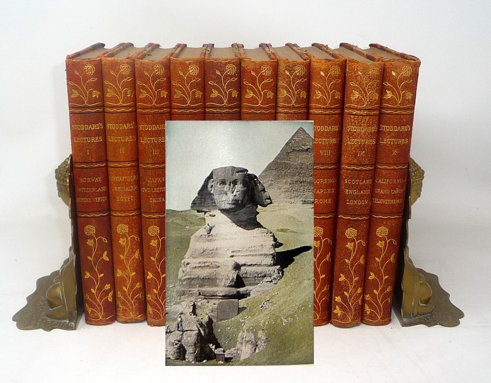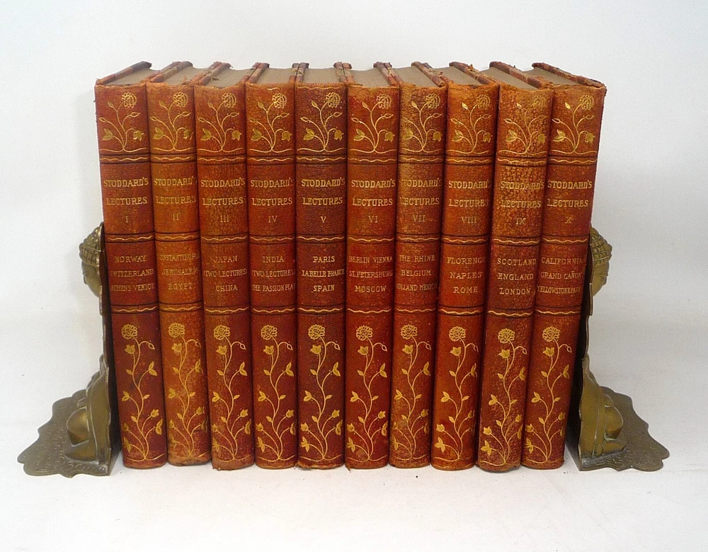John Stoddard's Lectures -- World Travel -- 1910, Set of 10 John L. Stoddard's Lectures. Stoddard, John L. Chicago: Geo. L. Shuman & Co., 1910. Set of 10. Later edition. Vol 1 - Norway, Switzerland, Athens, Venice; Vol 2 - Constantinople, Jerusalem, Egypt; Vol 3 - Japan and China; Vol 4 - India, the Passion Play; Vol 5 - Paris, La Belle France, Spain; Vol 6 - Berlin, Vienna, St Petersburg, Moscow; Vol 7 - The Rhine, Belgium, Holland, Mexico; Vol 8 - Florence, Naples, Rome; Vol 9 - Scotland, England, London; Vol 10 - California, Grand Canyon, Yellowstone. Hardcovers, bound in half leather and marbled boards. Three raised bands, gilt decorations and titles on the spines. All volumes profusely illustrated with a full page color photographic illustration at the beginning of each area's narrative and many black and white photographic illustrations. Firmly bound, edge wear to covers and some scrapes to the leather. Weights 25 pounds.