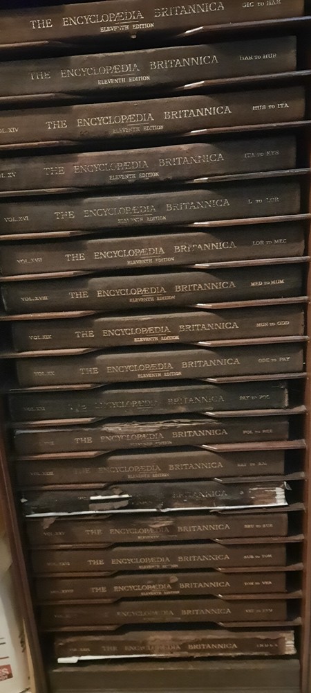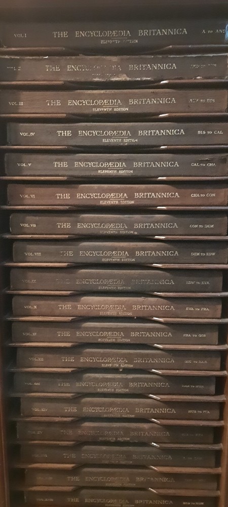 full set of this landmark edition of the encyclopedia Britannica.. in overall remarkable condition for a delicate set that is over 110 years old.. many volumes appear to have never been opened .. this set does NOT include the bookcase in which it is housed.. we are keeping it for another set which we are wishing to retain. This set is bound in soft suede, which is particularly susceptible to damage.. there are a few of the spines which you can see from the images that have suffered some damage.. These set in this condition are becoming increasingly hard to find.. and it is in our opinion a cornerstone of a classical library, This was printed at the end ot the age of Enlightenment with leading contributors from all walks of life. The last edition before the encyclopedia changed forever. PLEASE NOTE THIS ITEM SHIPS FROM CANADA SHIPPING TO BE DETERMINED AT TIME OF SALE.