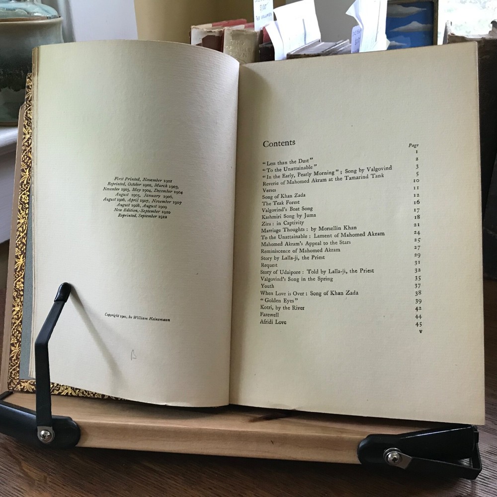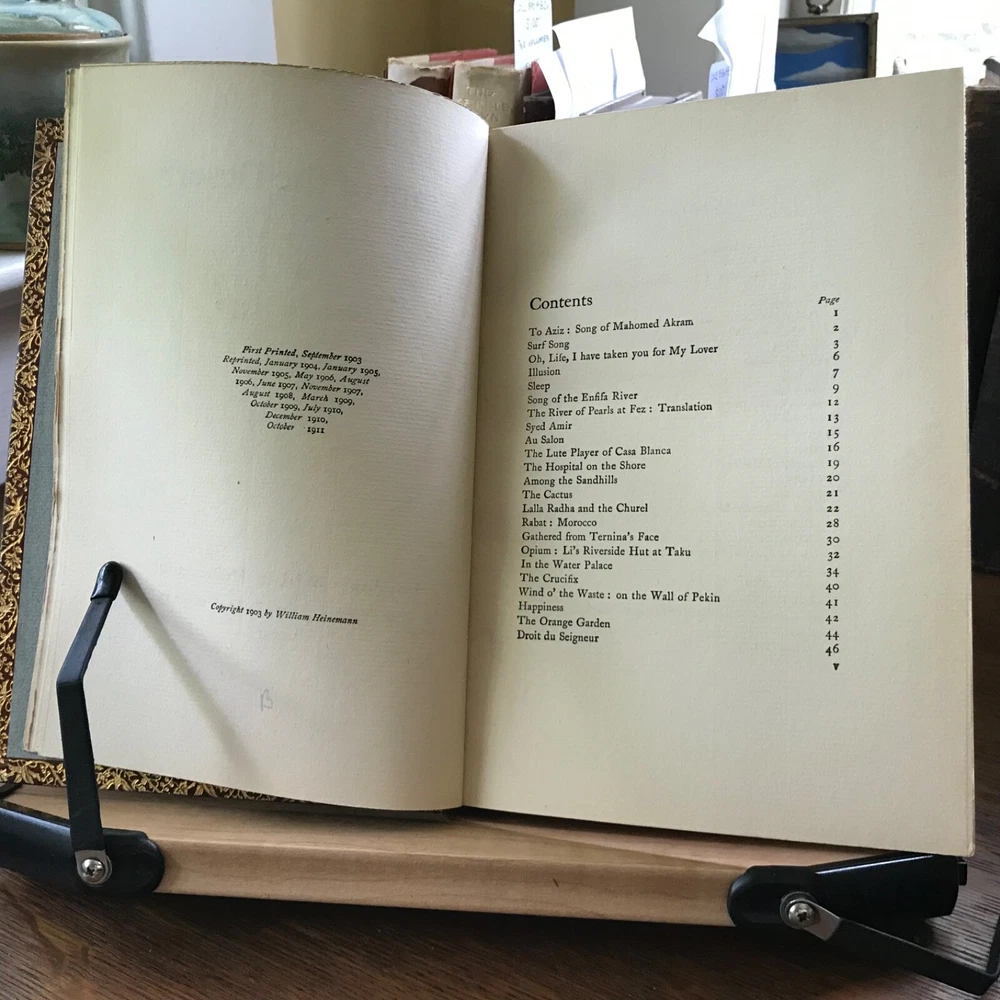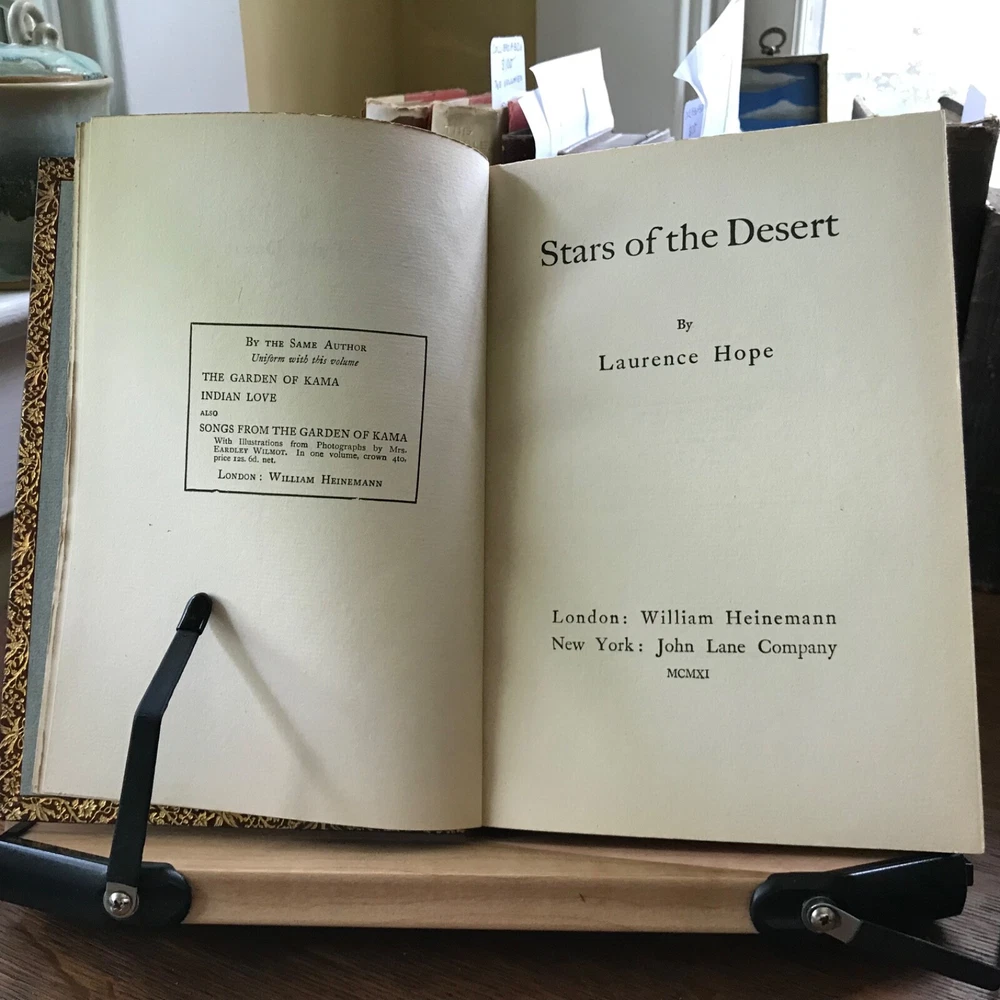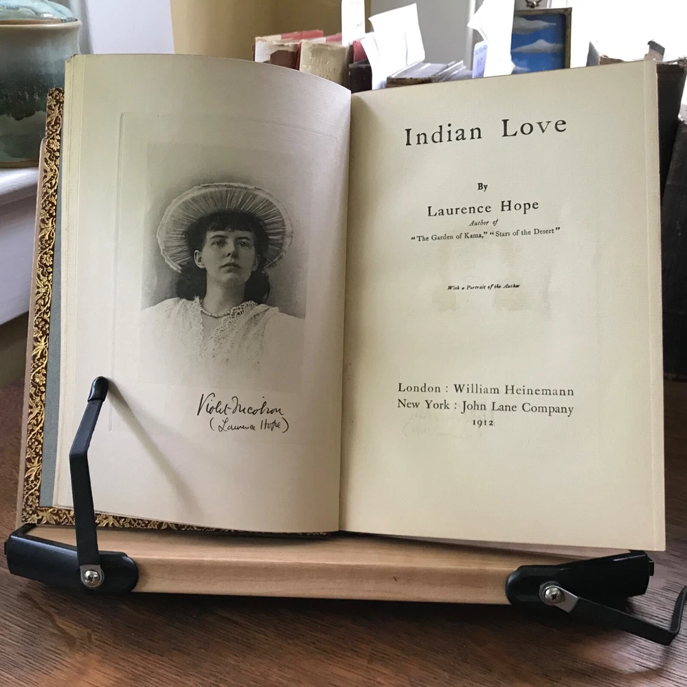 Three Volume Set of Violet Nicholson’s Poetry: Stars of the Desert, Laurence Hope, William Heinemann, London, 1911, 152 pp. Indian Love, Laurence Hope, William Heinemann, London, 1912, 92 pp, frontis portrait. The Garden of Kama And other Love Lyrics from India, Laurence Hope, William Heinemann, London, 1912, 174 pp. Full leather, signed bindings of Bretano’s, New York, 8.25 x 6”, 8vo. All in good condition. Lovely signed Bretano’s bindings with delicate gilt tooling and dentelles. Leather remains soft and clean. A few nicks to the surface of leather with minor scuffing to tips and end bands. Top edges gilt. Inner gilt dentelles have toned the edges of the front fly leaves. Light toning to interiors with minimal foxing, if any. Brown silk book markers intact, albeit slightly frayed at the bottoms. Free of known markings. Bindings tight and intact. Please see photos. Violet Nicholson (1865-1904) otherwise known as Adela Florence Nicolson was an English poet who wrote under the pseudonym Laurence Hope. Her poems often used imagery and symbols from poets of the North-West Frontier of India and the Sufi poets of Persia. She was among the popular romantic poets of the Edwardian era. COLL1912AFJN