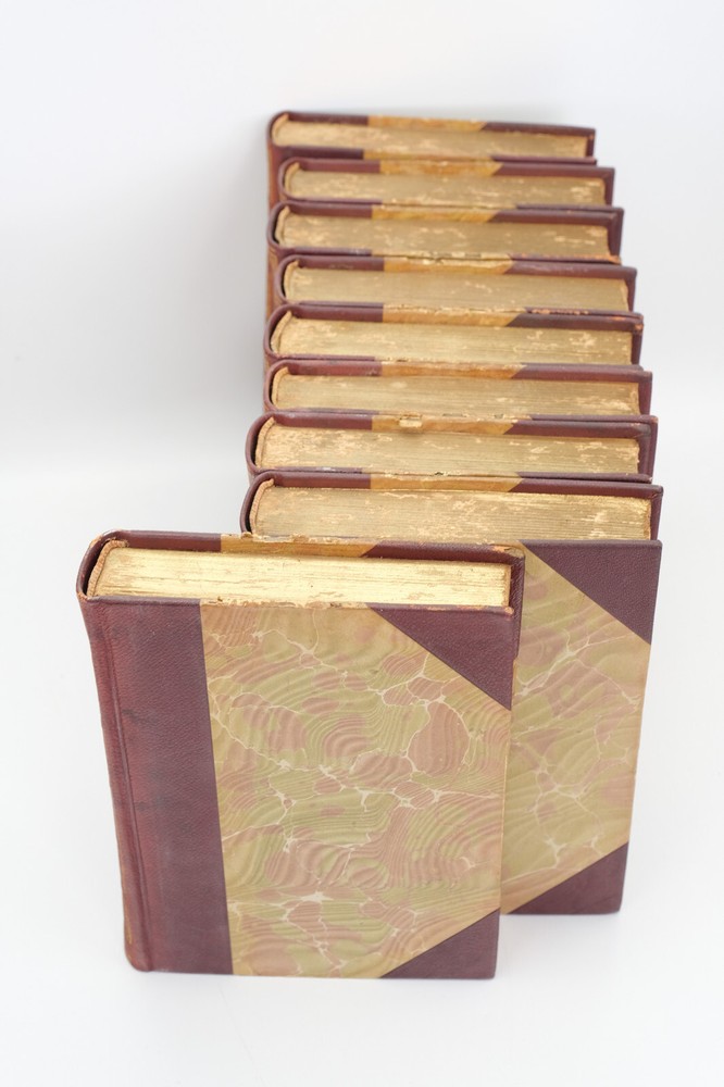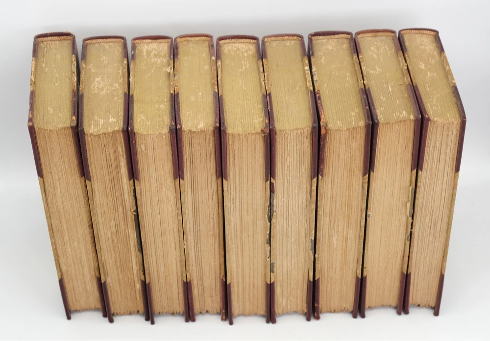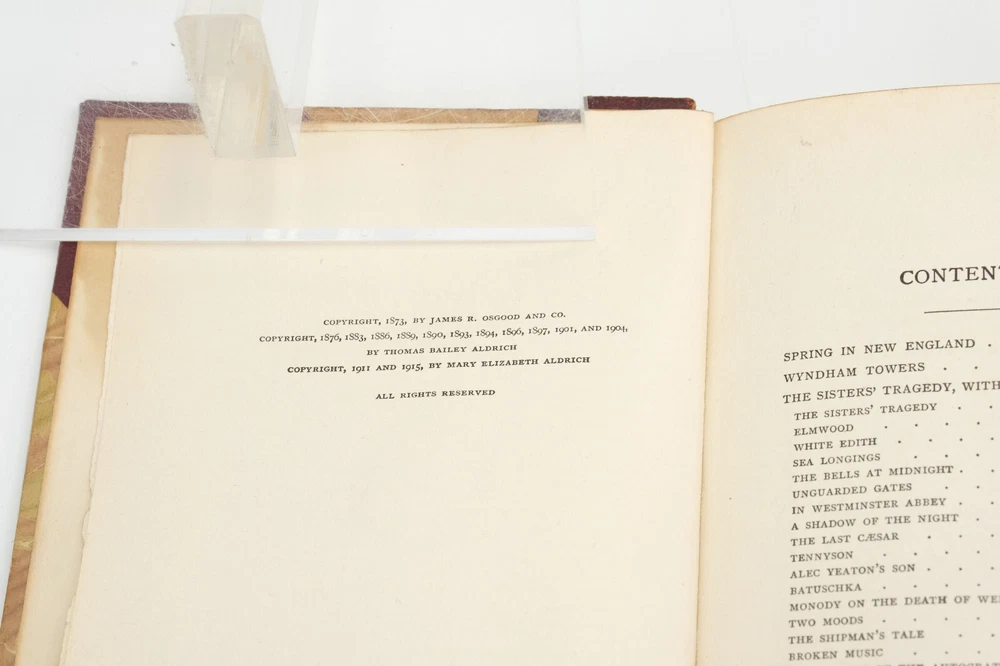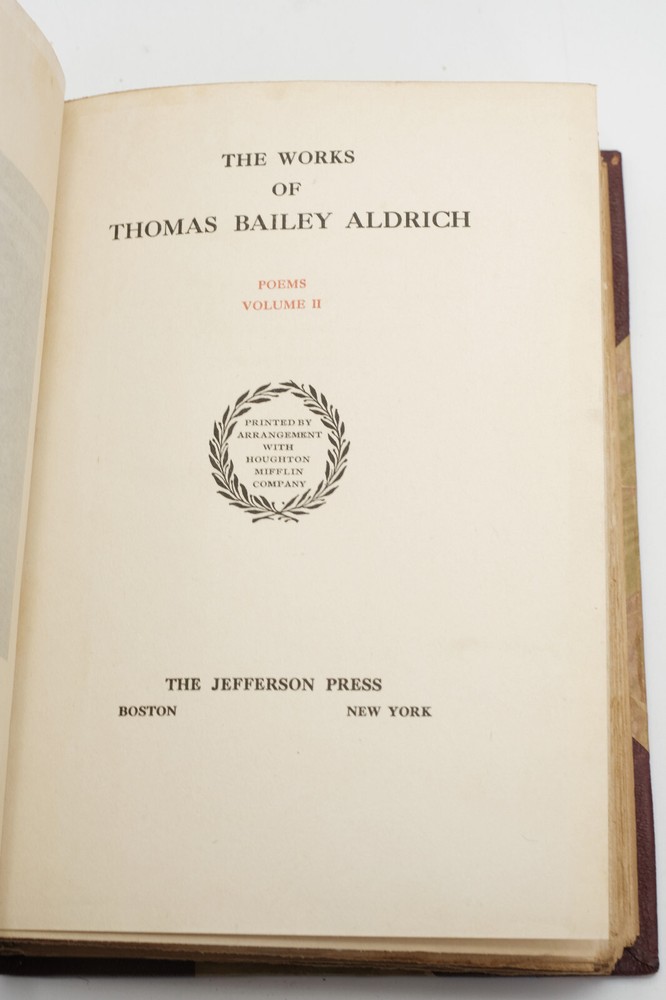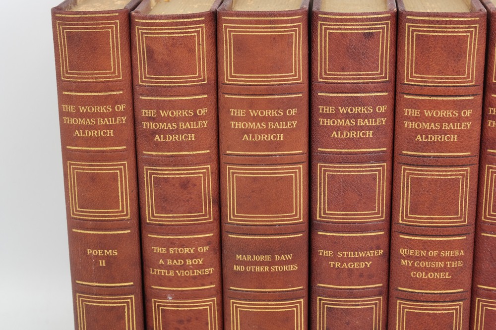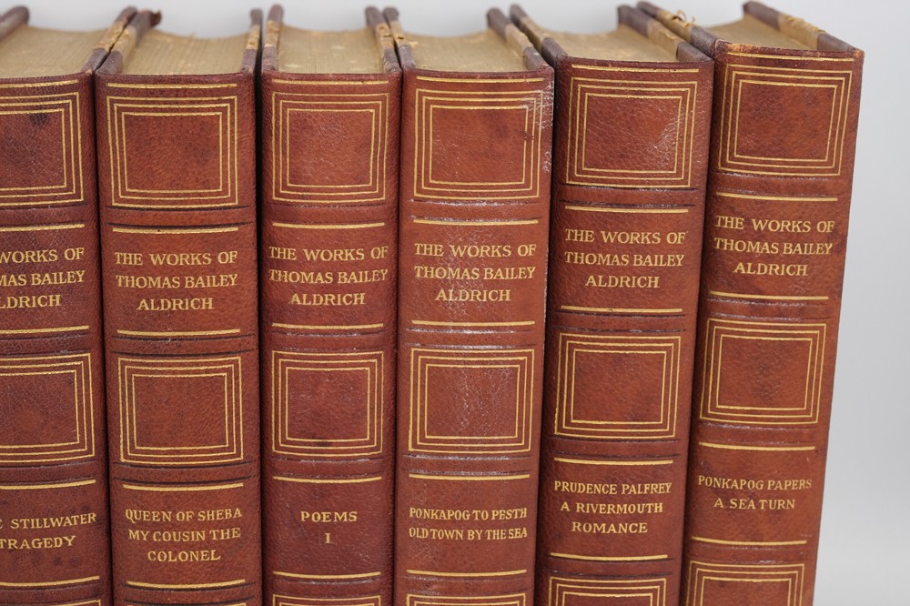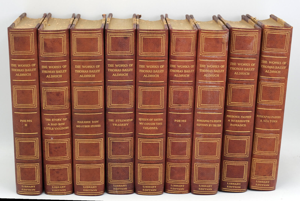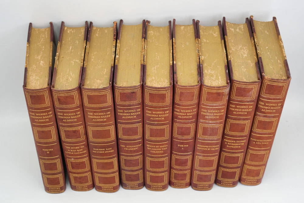 20250323X6555 The Scarce and Coveted 1915 Printing "The Works of Thomas Bailey Aldrich" 9 Volume Book Set in Good ++ Condition Quarter and a Half L eather Bound Hardcovers measuring approximately 8"h x 6"w x 1 1/2"w with modest signs of handling