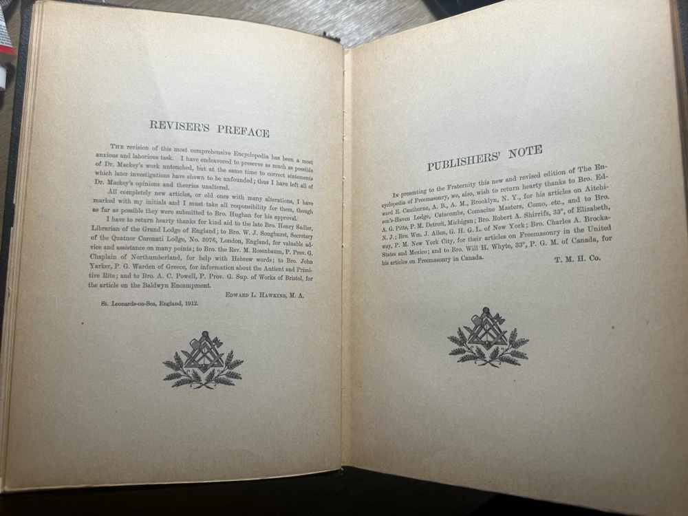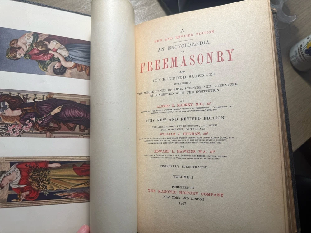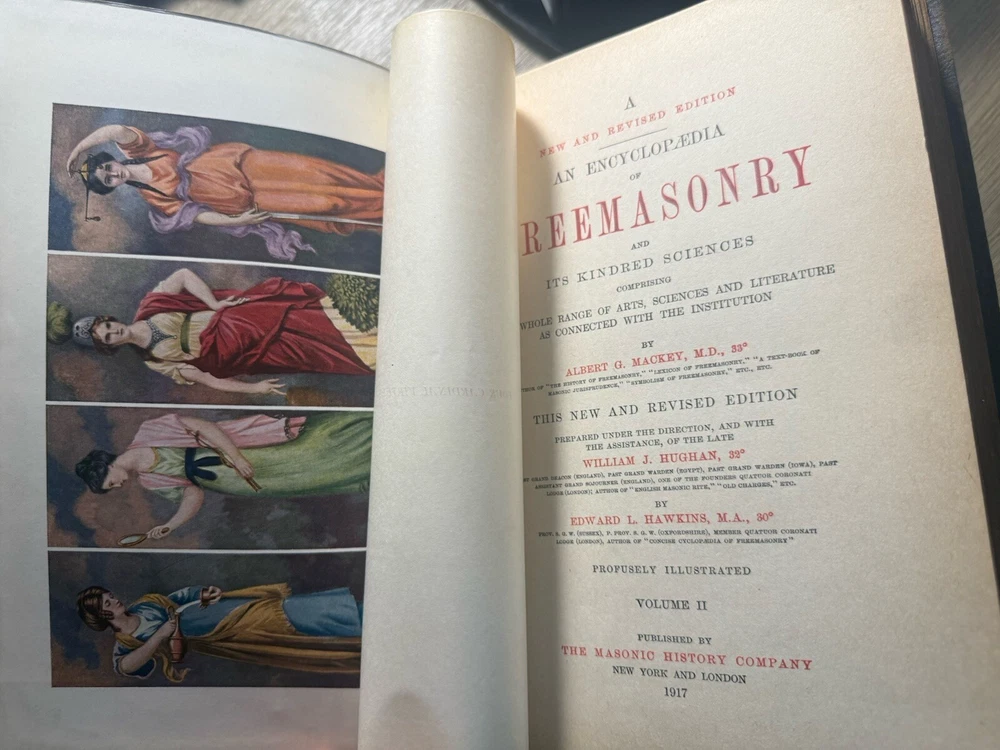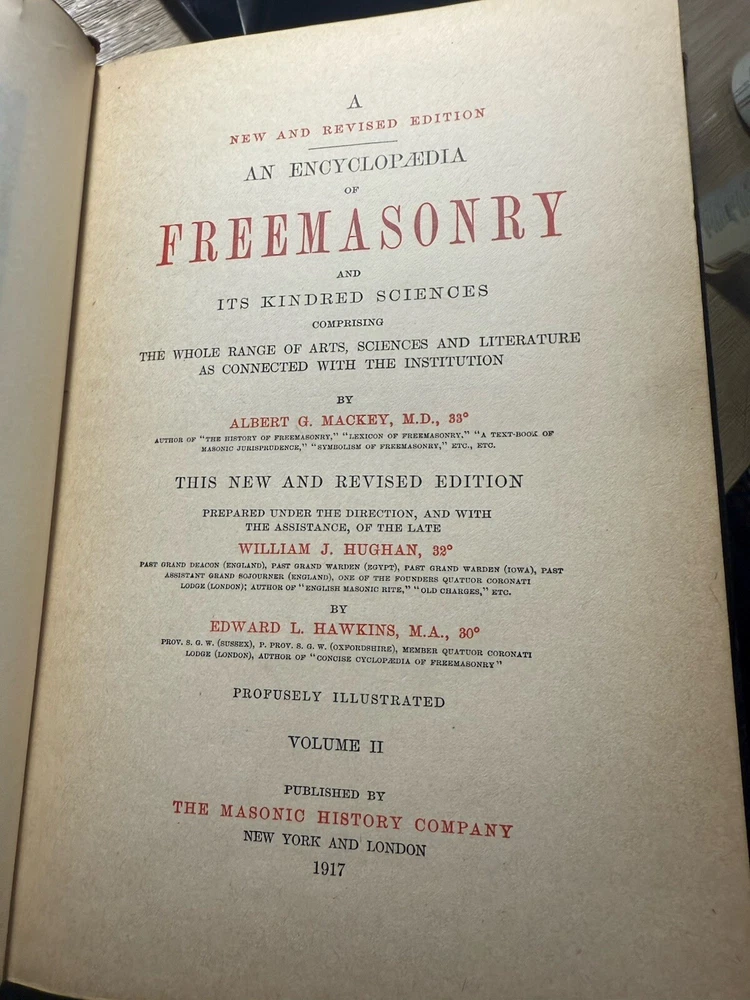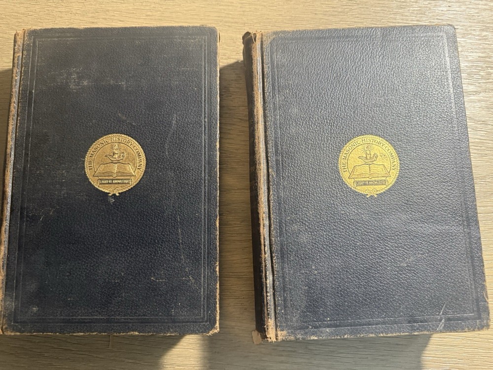 This is a sturdy, visually impressive 1917 leatherbound two-volume set of The New and Revised Edition of the Encyclopedia of Freemasonry by Albert G. Mackey and Charles T. McClenachan, revised and expanded by Edward L. Hawkins and William J. Hughan. Both volumes are structurally strong with no shake and retain their original all edges gilt. Volume I shows reinforced endpapers front and rear—neatly executed but causing the free endpaper to be unusually tight to the pastedown. Volume II has a split front endpaper and similar reinforcement to the rear, with evidence of careful, professional stabilization. Leather spines show moderate rubbing and some fraying at the crown and foot, typical for the era but nothing that affects integrity. The boards are still rich in color, and the gilt emblems remain bright and striking. Internally, both volumes are unmarked, with clean pages and crisp printing. A very presentable and solid example of this foundational Masonic reference. This revised edition, published by the Masonic History Company in New York and London, is profusely illustrated throughout. Each volume features a stunning full-color frontispiece protected by tissue guard, as well as numerous in-text diagrams and illustrations—ranging from charts of Kabbalistic cosmology to symbolic engravings and Masonic ritual imagery. The set covers not only the history and philosophy of Freemasonry but also its related sciences, symbols, rituals, jurisprudence, literature, and biographies of notable figures. It is alphabetically arranged (Vol. I A–L, Vol. II M–Z) and includes long-form scholarly entries reflecting both 19th-century thought and early 20th-century scholarship. Albert G. Mackey (1807–1881), a leading American Masonic scholar and physician, originally compiled this work in the 19th century. The 1917 revision builds upon that foundation with expanded content and updated research from Hughan, a notable Masonic historian and archivist from England. These encyclopedias remain a cornerstone in the study of fraternal organizations and esoteric traditions, prized by collectors, researchers, and Masonic lodges alike. A beautiful and substantial set with great historical and aesthetic appeal—difficult to find in this condition with reinforced hinges and clean interiors. If you’re building a Masonic collection, this is an anchor piece. *** Please take a moment to view all photos for the best sense of the item’s condition. If only one photo is shown, rest assured the description reflects it carefully. Your item will be shipped promptly and packaged with care. ***