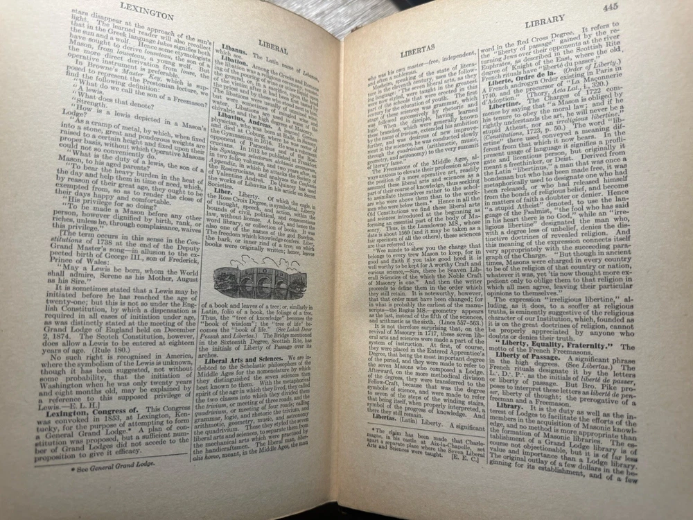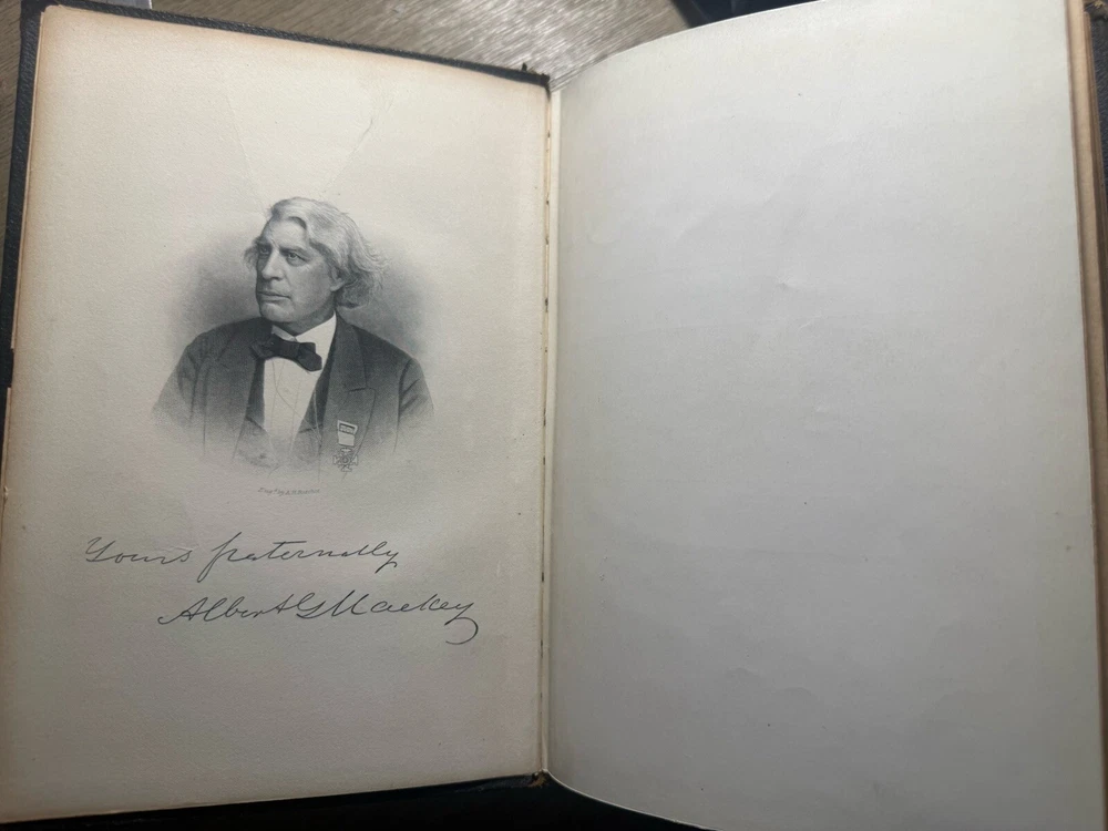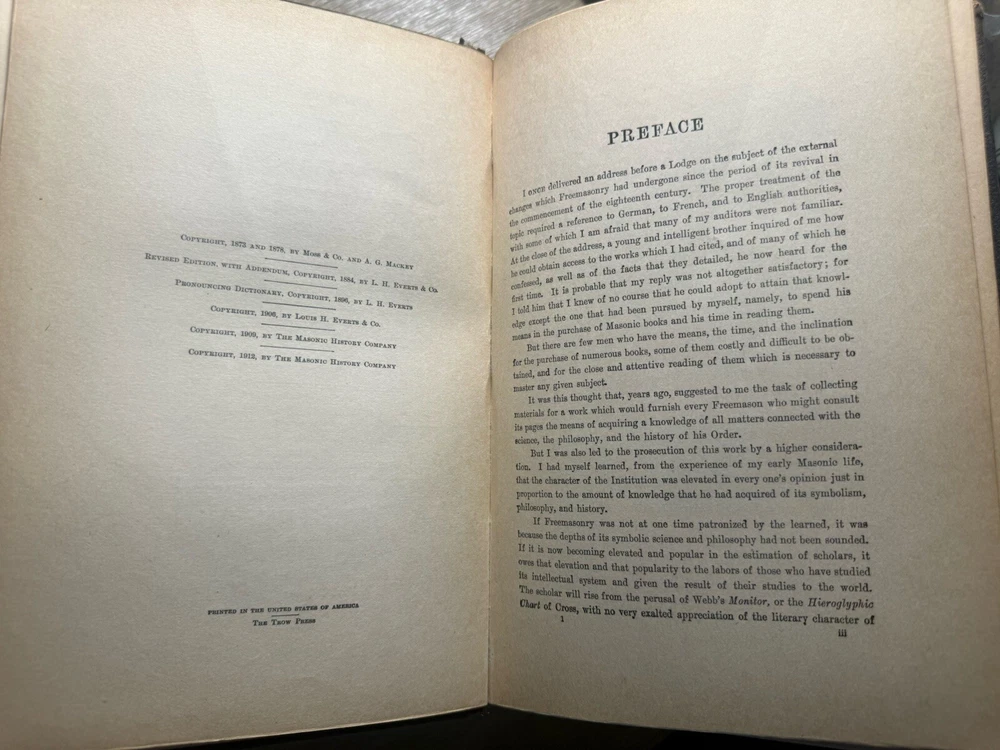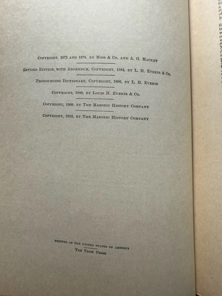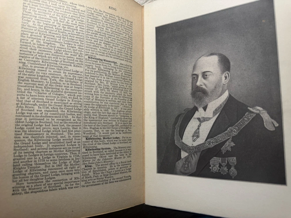 This is a sturdy, visually impressive 1917 leatherbound two-volume set of The New and Revised Edition of the Encyclopedia of Freemasonry by Albert G. Mackey and Charles T. McClenachan, revised and expanded by Edward L. Hawkins and William J. Hughan. Both volumes are structurally strong with no shake and retain their original all edges gilt. Volume I shows reinforced endpapers front and rear—neatly executed but causing the free endpaper to be unusually tight to the pastedown. Volume II has a split front endpaper and similar reinforcement to the rear, with evidence of careful, professional stabilization. Leather spines show moderate rubbing and some fraying at the crown and foot, typical for the era but nothing that affects integrity. The boards are still rich in color, and the gilt emblems remain bright and striking. Internally, both volumes are unmarked, with clean pages and crisp printing. A very presentable and solid example of this foundational Masonic reference. This revised edition, published by the Masonic History Company in New York and London, is profusely illustrated throughout. Each volume features a stunning full-color frontispiece protected by tissue guard, as well as numerous in-text diagrams and illustrations—ranging from charts of Kabbalistic cosmology to symbolic engravings and Masonic ritual imagery. The set covers not only the history and philosophy of Freemasonry but also its related sciences, symbols, rituals, jurisprudence, literature, and biographies of notable figures. It is alphabetically arranged (Vol. I A–L, Vol. II M–Z) and includes long-form scholarly entries reflecting both 19th-century thought and early 20th-century scholarship. Albert G. Mackey (1807–1881), a leading American Masonic scholar and physician, originally compiled this work in the 19th century. The 1917 revision builds upon that foundation with expanded content and updated research from Hughan, a notable Masonic historian and archivist from England. These encyclopedias remain a cornerstone in the study of fraternal organizations and esoteric traditions, prized by collectors, researchers, and Masonic lodges alike. A beautiful and substantial set with great historical and aesthetic appeal—difficult to find in this condition with reinforced hinges and clean interiors. If you’re building a Masonic collection, this is an anchor piece. *** Please take a moment to view all photos for the best sense of the item’s condition. If only one photo is shown, rest assured the description reflects it carefully. Your item will be shipped promptly and packaged with care. ***