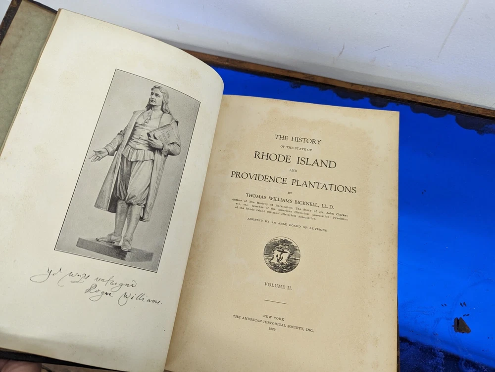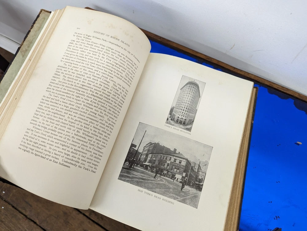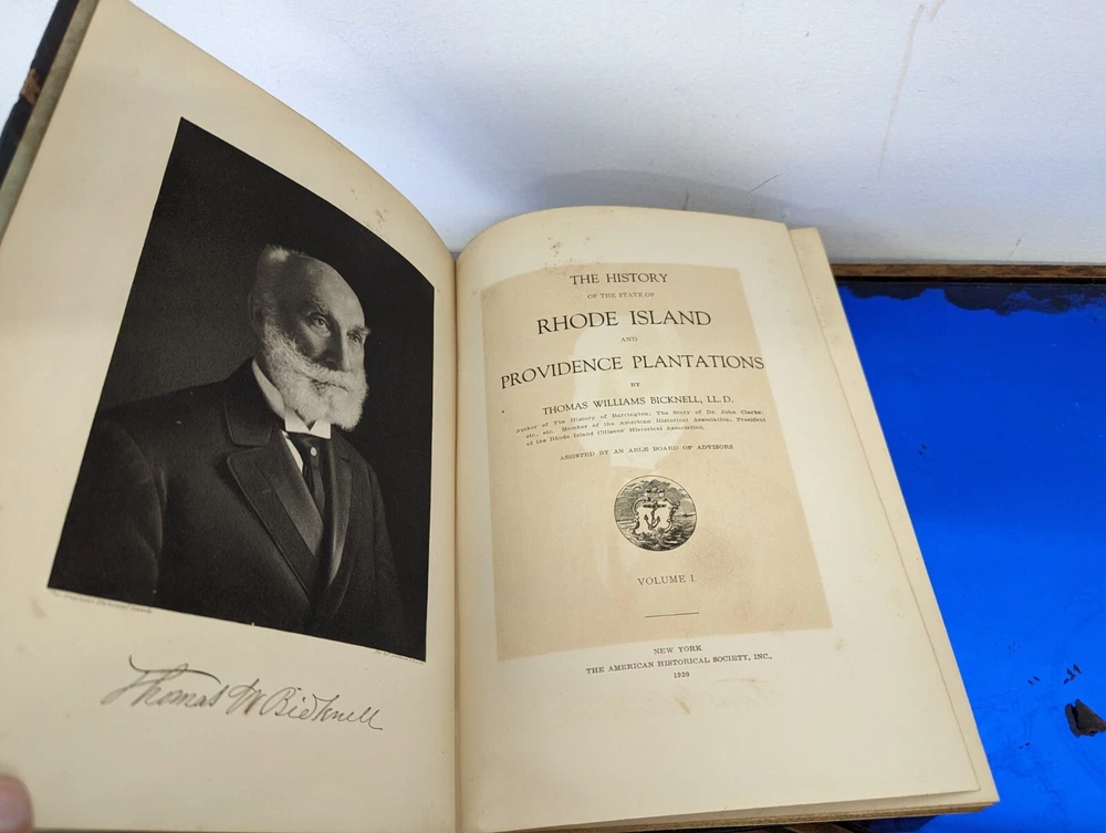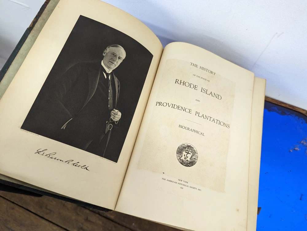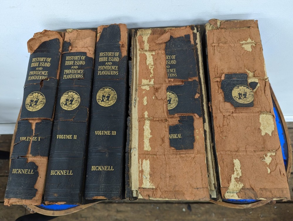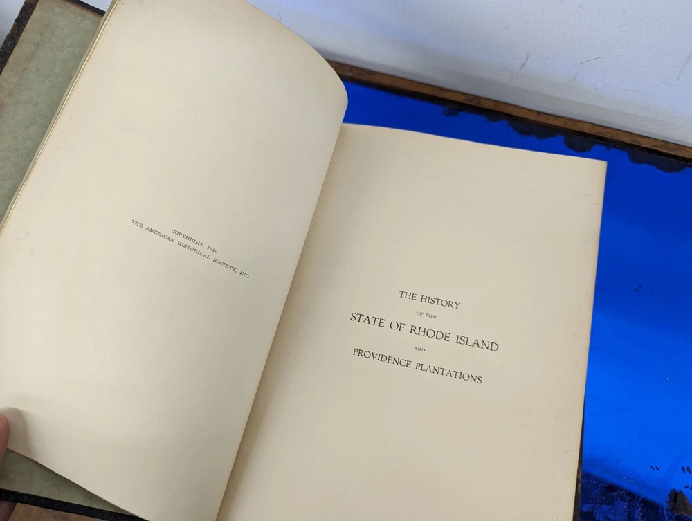 1920 History Of Rhode Island and Providence Plantations- American Historical Society, full 5vol books set- about 2000 pages full of gravure and images. Unfortunately this set is extremely rare and fragile. The bindings are strong on all 5 books although the 2 larger biographical books have some slight separation from use. the leather on the spines are commonly entirely missing-these are well on their way. during photography as can be seen, some separated and fell off, so don't assume much for the spine identifications although I'll include any pieces that currently exist. This set often is priced around $200/book even in fair to poor shape. It's extremely rare to find all 5. these books are pretty musty even for 1920s... it's almost as if they weren't made with materials made to stand the archival timeframe. I'm not getting signs of growth but there is plenty of foxing on select pages, especially across from images. these books are full of gravures and images of the history of little Rhody. much of the images have transferred to their cross pages as well. the pictures taken accentuate the discolorations more than they appear, so it's hard to say whether they will arrive better or worse than expected but I'm trying to give all of the data. would prefer pickup in person as these are so fragile, plus condition can be confirmed better than pictures allow for 2000 pages of antique books. please feel free to ask for any additional info and I'll try to provide.