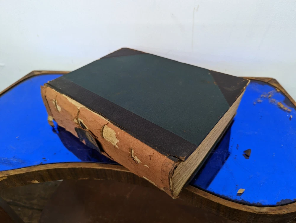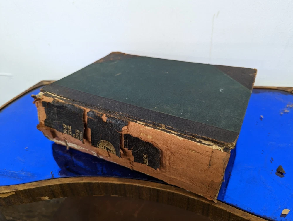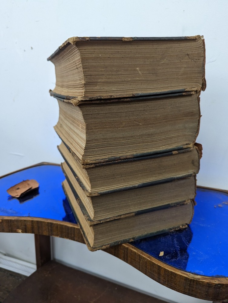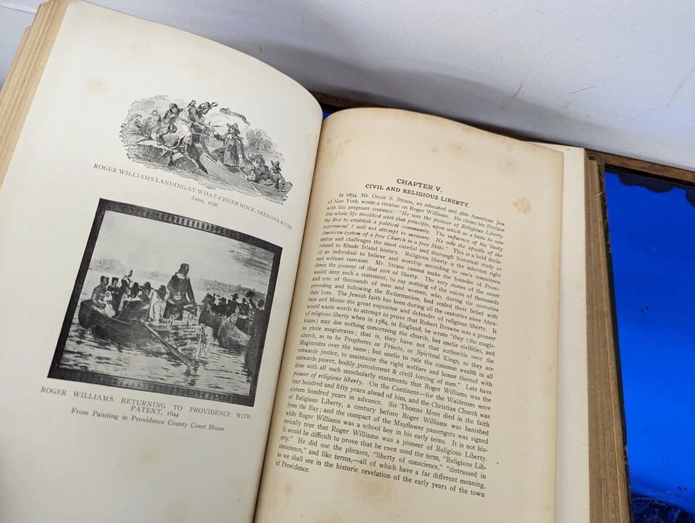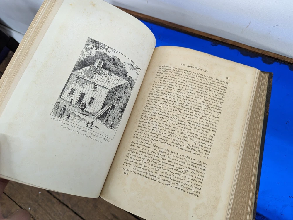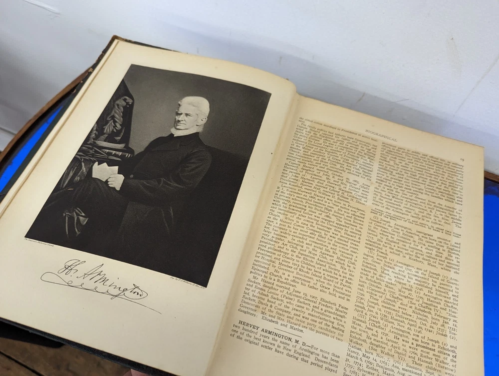 1920 History Of Rhode Island and Providence Plantations- American Historical Society, full 5vol books set- about 2000 pages full of gravure and images. Unfortunately this set is extremely rare and fragile. The bindings are strong on all 5 books although the 2 larger biographical books have some slight separation from use. the leather on the spines are commonly entirely missing-these are well on their way. during photography as can be seen, some separated and fell off, so don't assume much for the spine identifications although I'll include any pieces that currently exist. This set often is priced around $200/book even in fair to poor shape. It's extremely rare to find all 5. these books are pretty musty even for 1920s... it's almost as if they weren't made with materials made to stand the archival timeframe. I'm not getting signs of growth but there is plenty of foxing on select pages, especially across from images. these books are full of gravures and images of the history of little Rhody. much of the images have transferred to their cross pages as well. the pictures taken accentuate the discolorations more than they appear, so it's hard to say whether they will arrive better or worse than expected but I'm trying to give all of the data. would prefer pickup in person as these are so fragile, plus condition can be confirmed better than pictures allow for 2000 pages of antique books. please feel free to ask for any additional info and I'll try to provide.