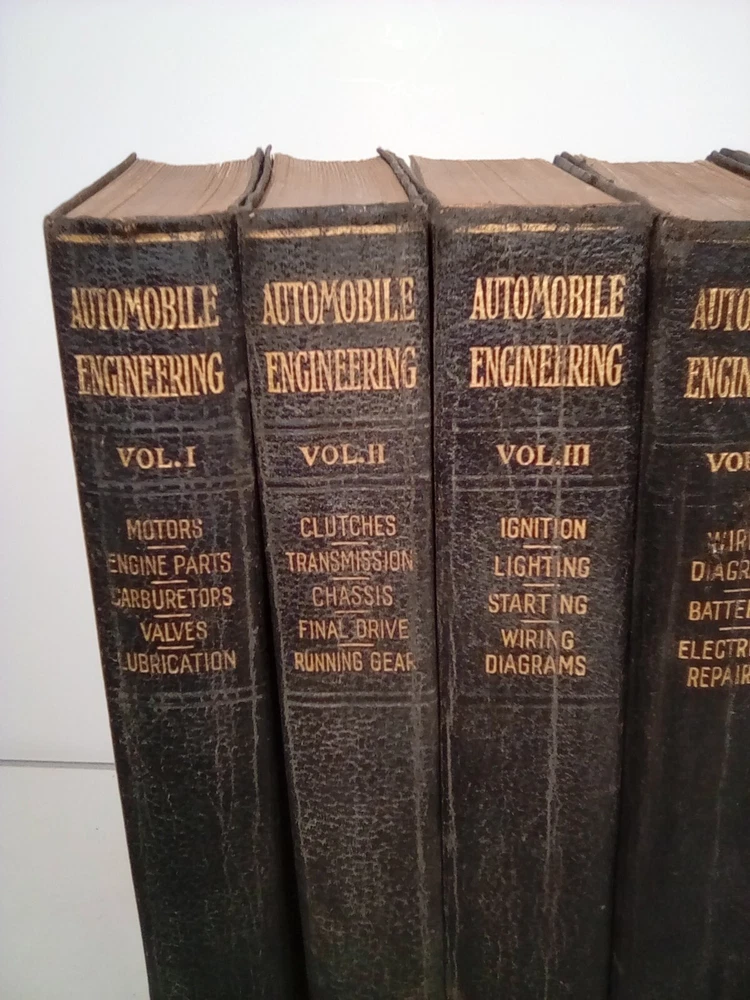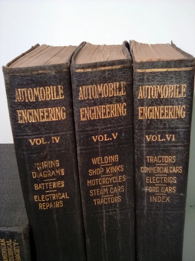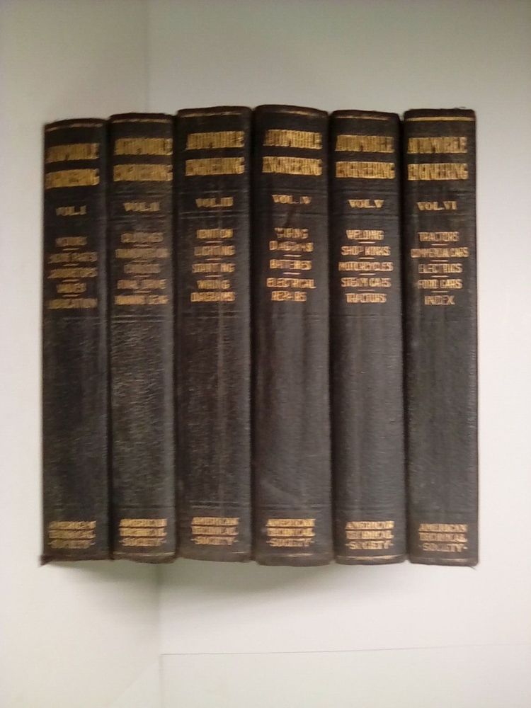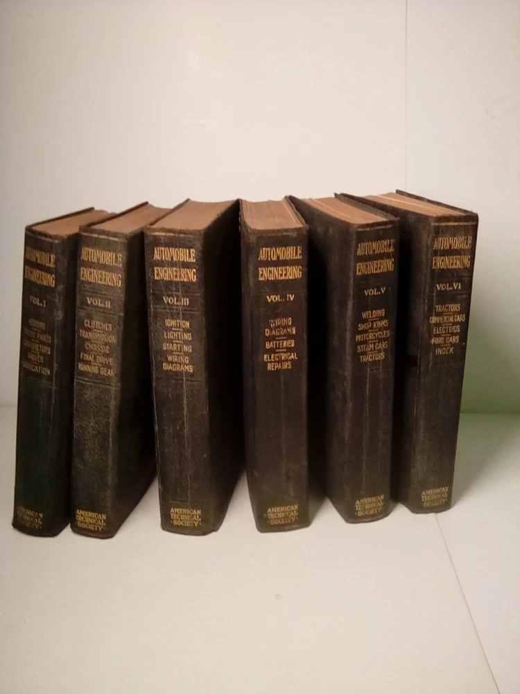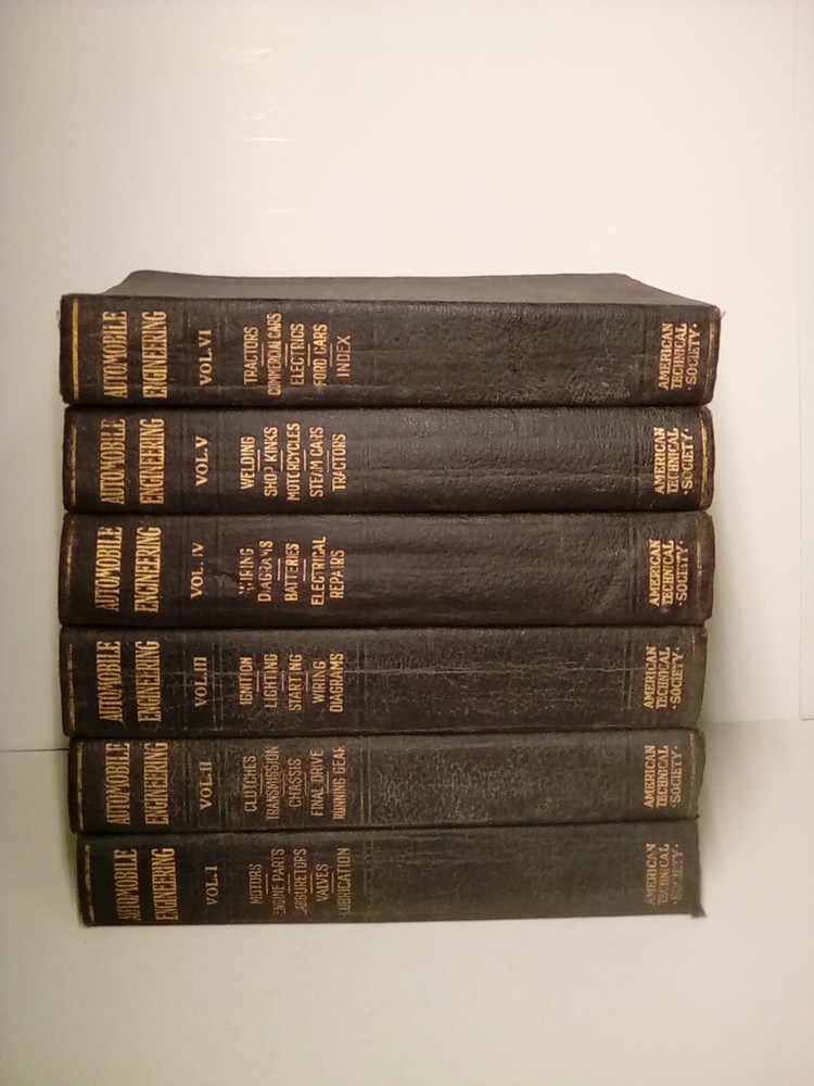 Explore the world of automotive engineering with this 1921 encyclopedia set published by American Technical Society. This six-volume set contains over 300-500 pages each, providing detailed information on the subject area of transportation. The books are illustrated and written in English by American Tech. Society, Chicago, making it an ideal educational resource for adult and further education. The encyclopedia set has a faux leather-bound format and weighs 2 lb. 1 .2 oz. each. It measures 8\".5\" in length, 5 .5\" in width, and 1 1/4\" in height. It covers various topics such as automotive repair and maintenance, automotive general, and more. This item is perfect for collectors and enthusiasts who want to expand their knowledge and expertise on automotive engineering.