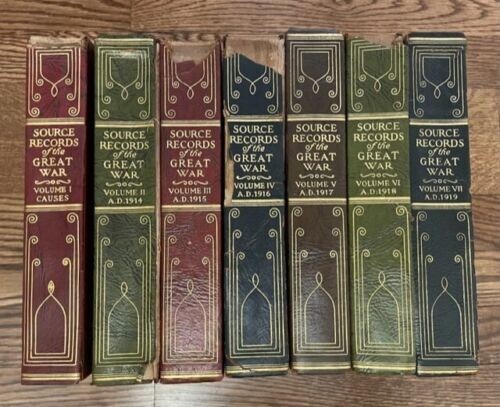 1923 7 Volume Set of Source Records of The Great War - Registered Copy Leather Offered For Sale is a 1923 Seven Leather Volume Set of "Source Records of The Great War" Registered Copy with the American Legion Seal registered to Ernest John Munch published by The National Alumni Editor in Chief was Charles Horne Directing Editor Walter F. Austin clean pages, tight binding, and no writing in books the leather spines have a little tearing at the top of the spine on all volumes except V front cover not attached in Volume II Item is sold AS IS
