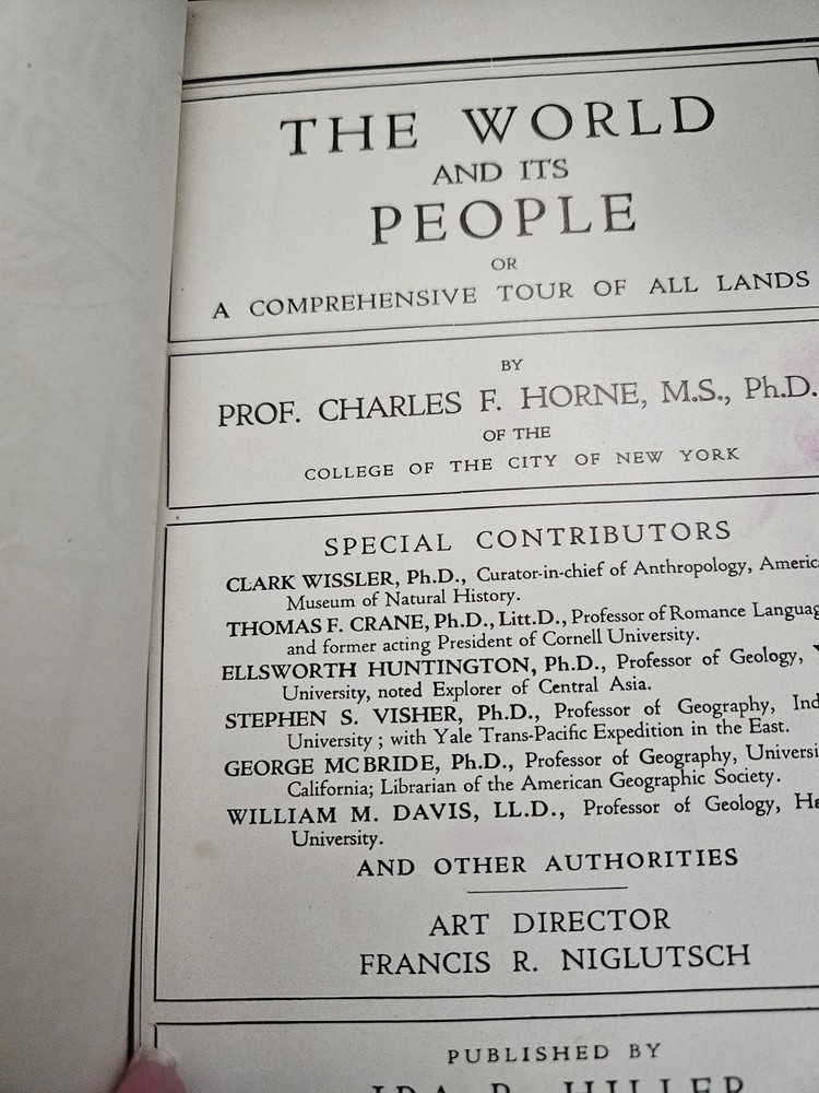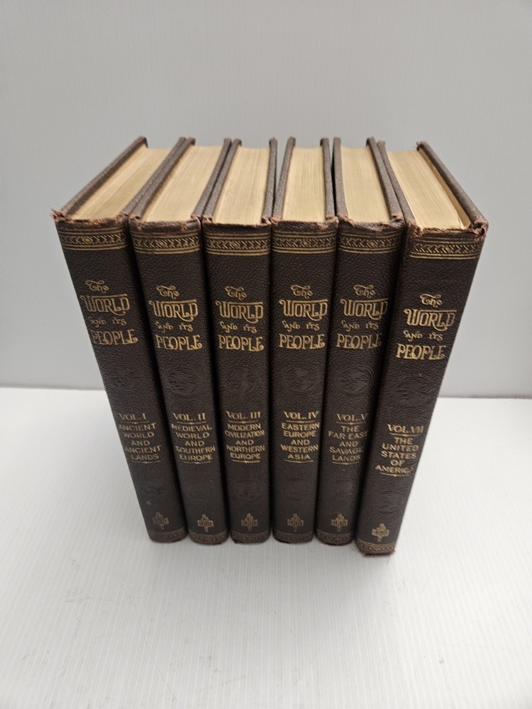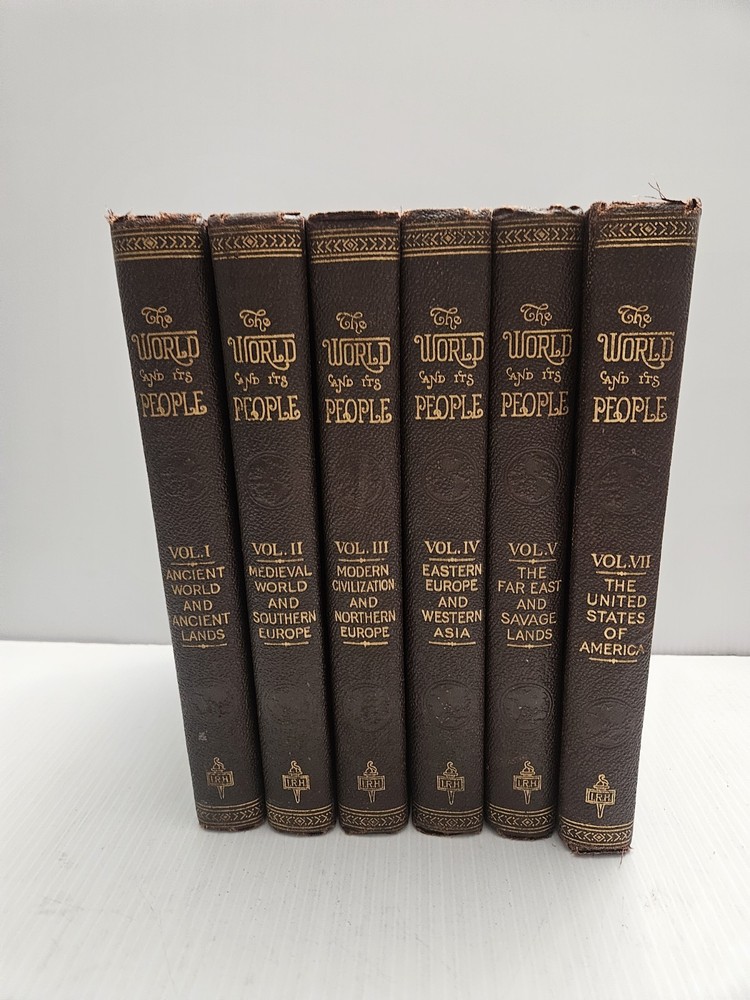PLEASE READ VOL VI IS MISSING FROM THE SET The product is a set of world history book volumes from 1924 titled "The World and Its People." The missing volume VI does not detract from the overall value of the set, which includes beautifully bound leather editions with illustrations and is considered a first edition. Perfect for history enthusiasts and collectors alike, this set provides a comprehensive exploration of world history through engaging narrative and visual storytelling.