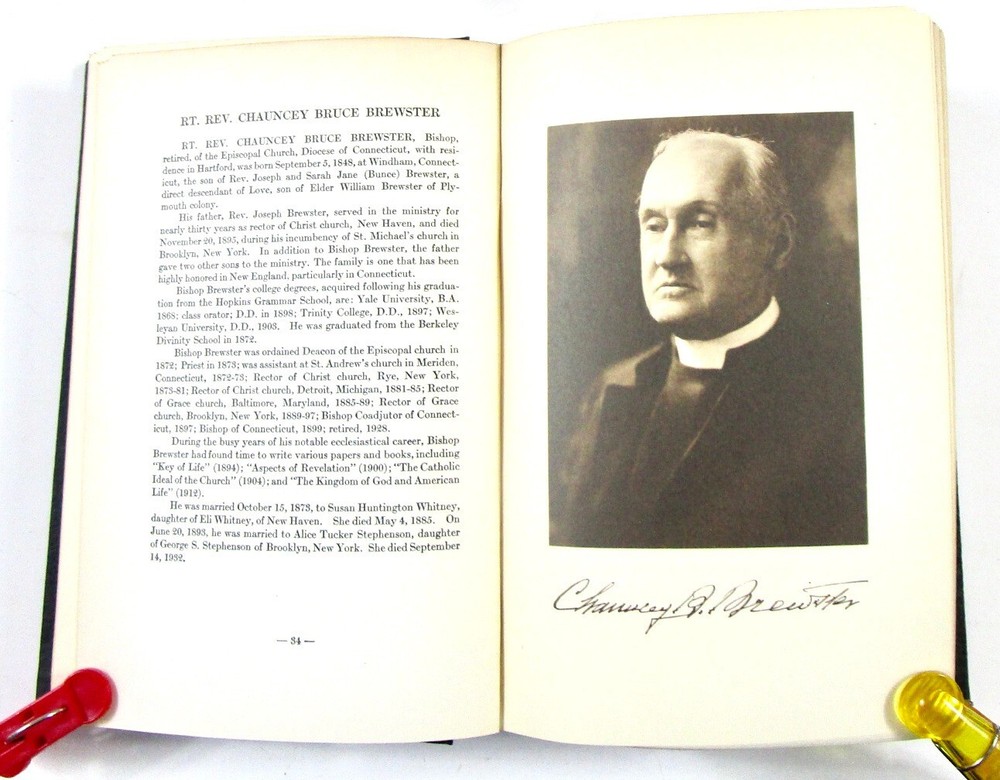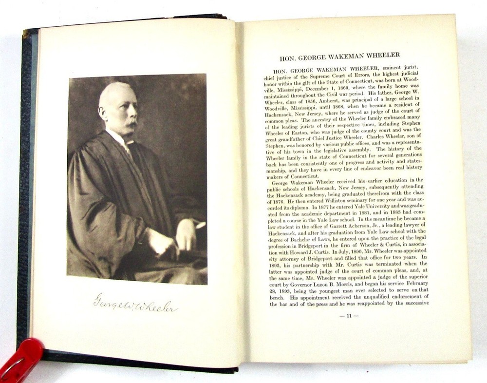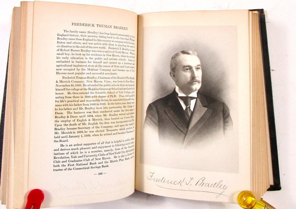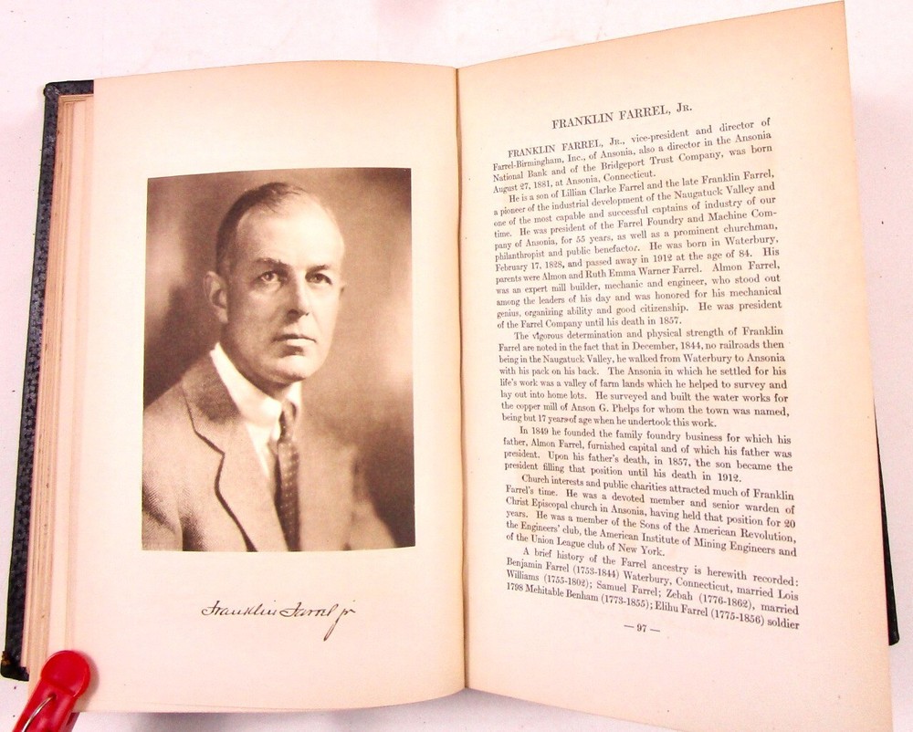 Set Description: E. Robert Stevenson, Editor in Chief of the Waterbury Republican and American, Connecticut History Makers—Containing Sketches and Portraits of Men Who Have Contributed to the Progress of the State in Manufacturing, Finance, Business, Literature, the Professions, Arts, and Other Fields of Activity. Waterbury, Connecticut: American-Republican, Inc., 1929, 1930, 1938, 297, 243, and 222 pages. Each volume is a first edition. Numerous portraits are not included in the pagination. Gilt titles on textured leather boards. All volumes are tightly bound and have clean pages, Some chipping to leather covers of volumes II and III. A nice set.