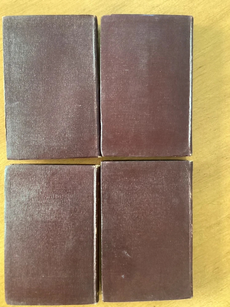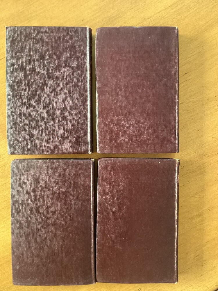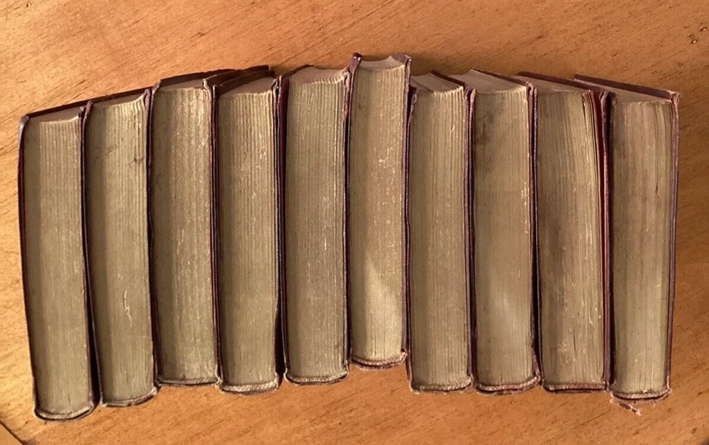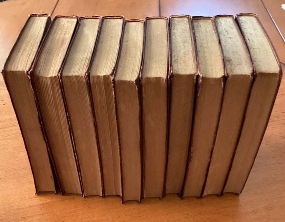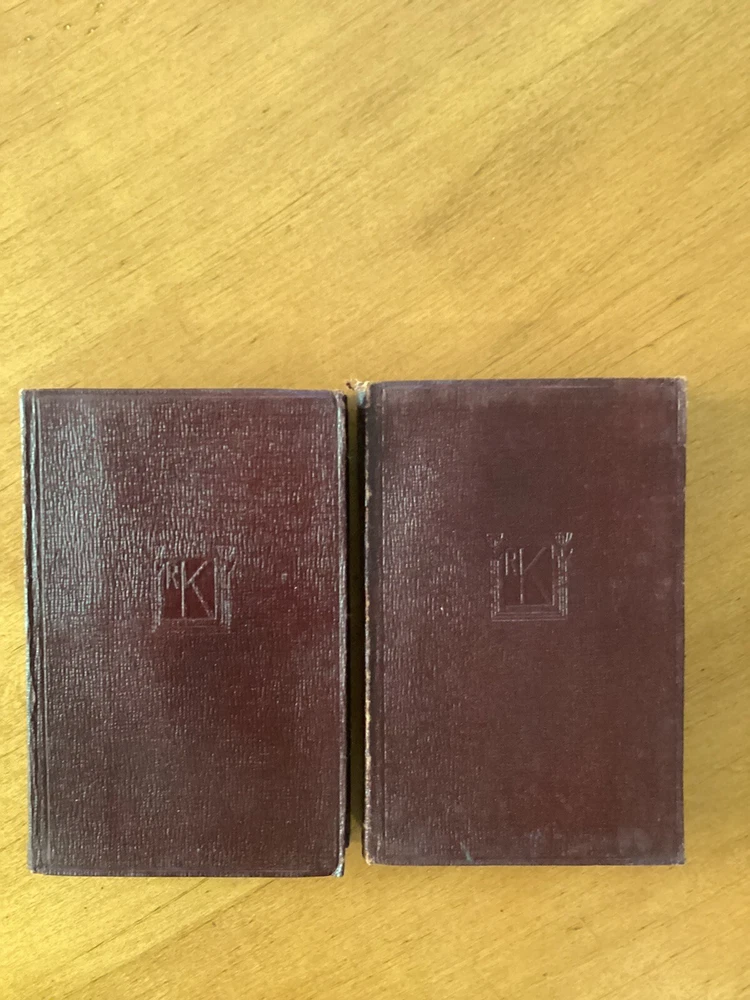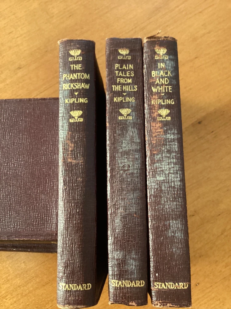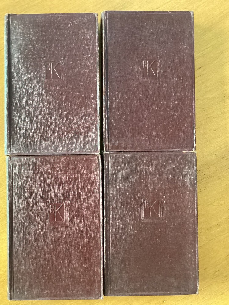 Ten Little red books of Rudyard Kiplings ( In Black and White; Plain Tales From the Hills; The Phantom Rickshaw; The Light That Failed; American Notes; Soldiers Three; Barrack Room Ballads; The Story of the Gadsby’s; Wee Willie Winkle; and The Courting of Dinah Shadd) published by J. H. Sears & Company in New York with decorative gold lettering and decorative stamp of papyrus and letters RK on cover. The top of pages are gold gilt. This is a lovely addition to anyones library.