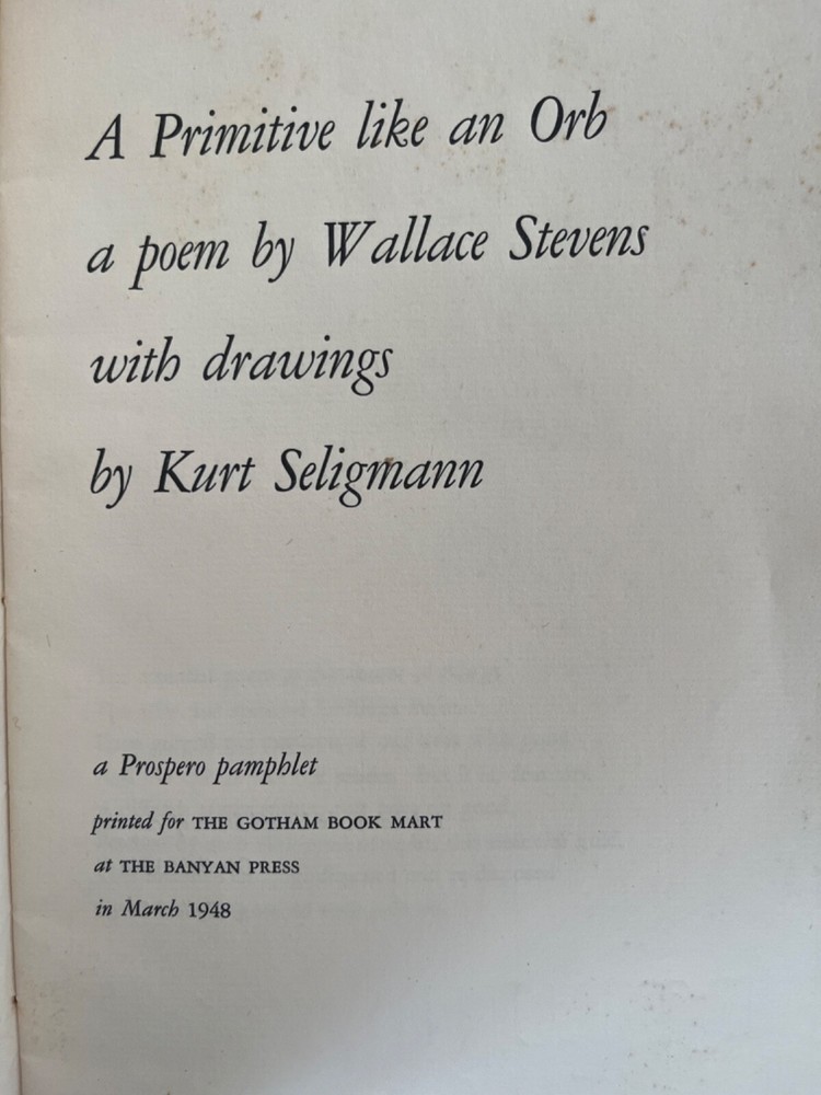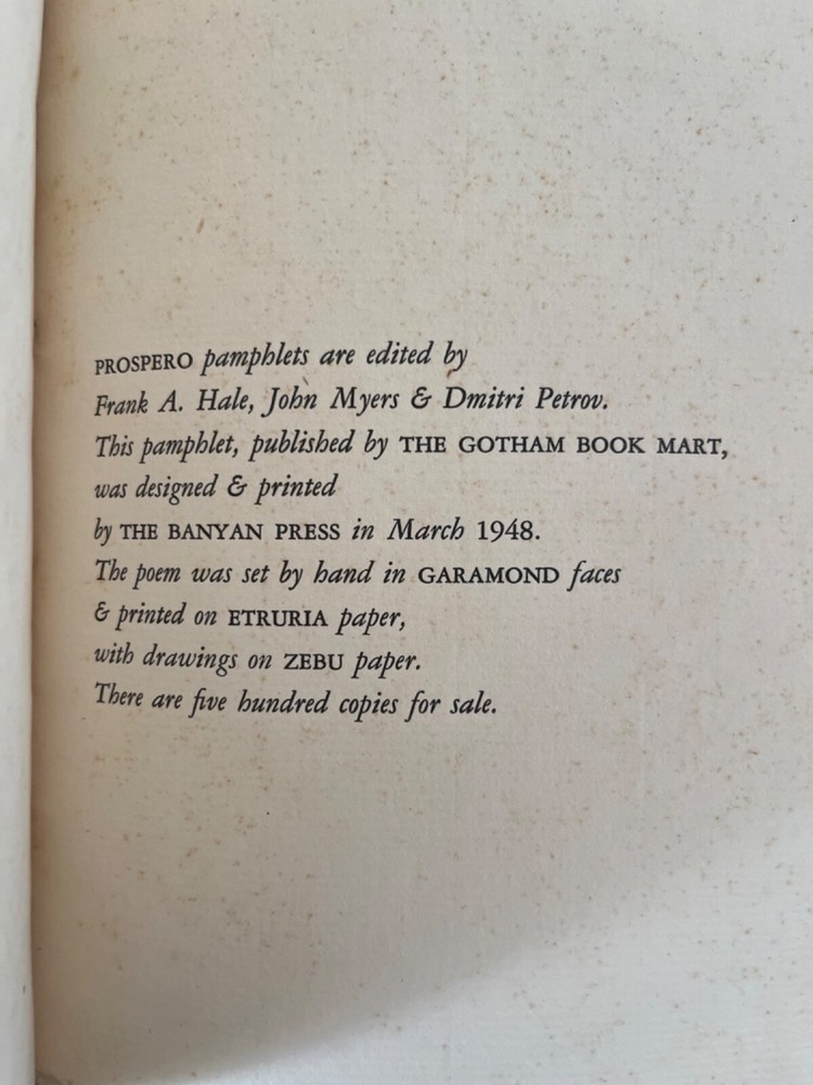Rare, March 1948 limited edition Prospero pamphlet made for the Gotham book mart by Banyan press with illustrations by Kurt Seligmann. Pamphlet is in generally good condition with foxing to the end pages. Limited to an additional 500. Buyer to pay $9.95 insured shipping in US or 1 pounds priority international.