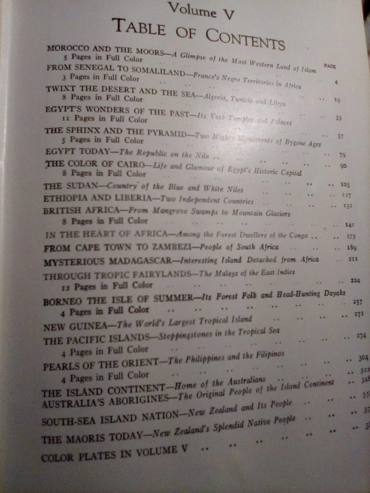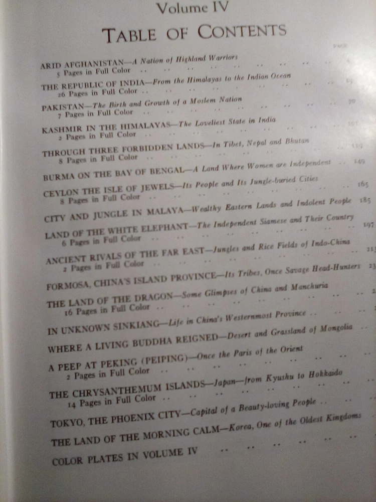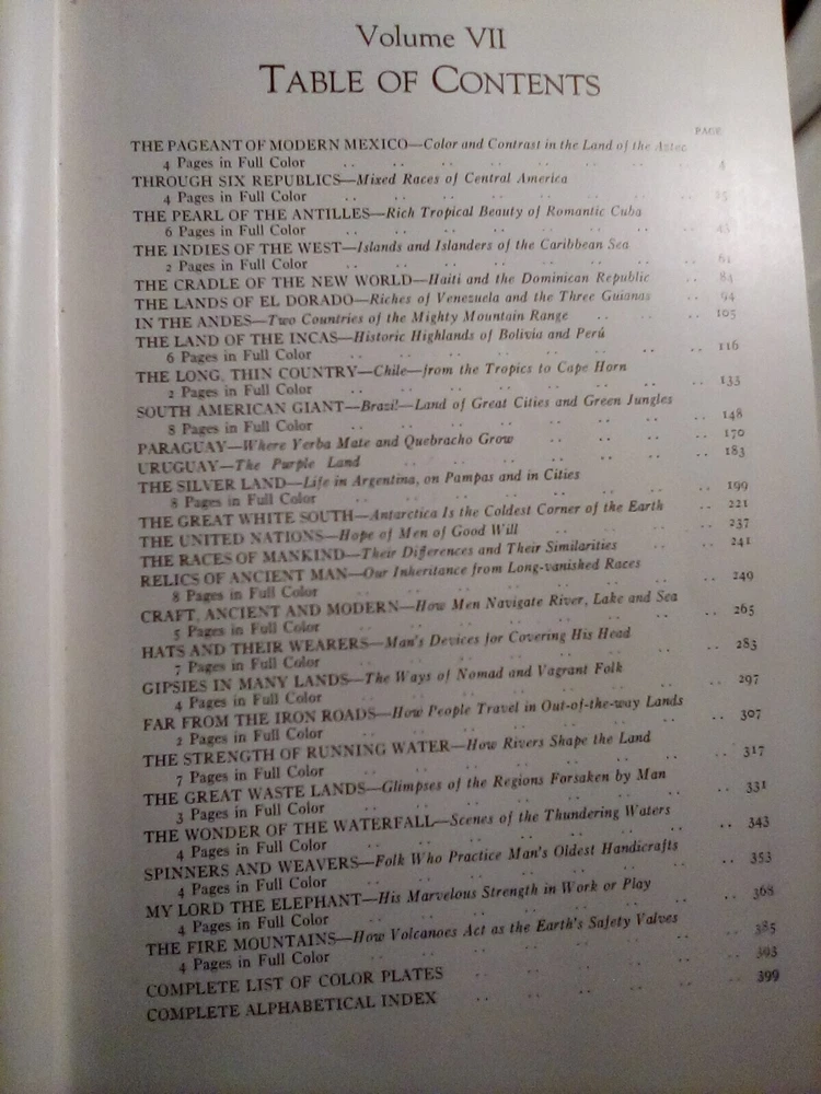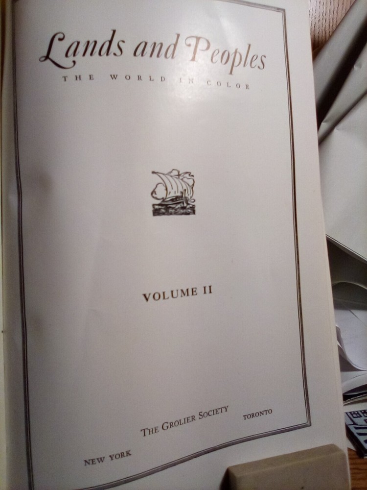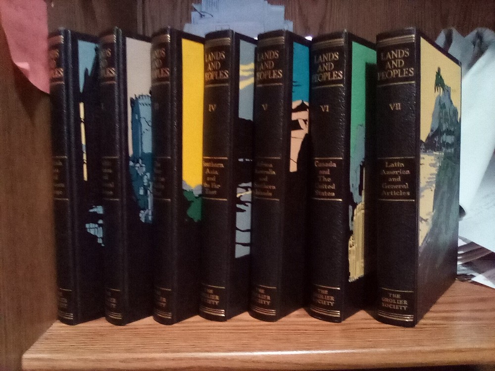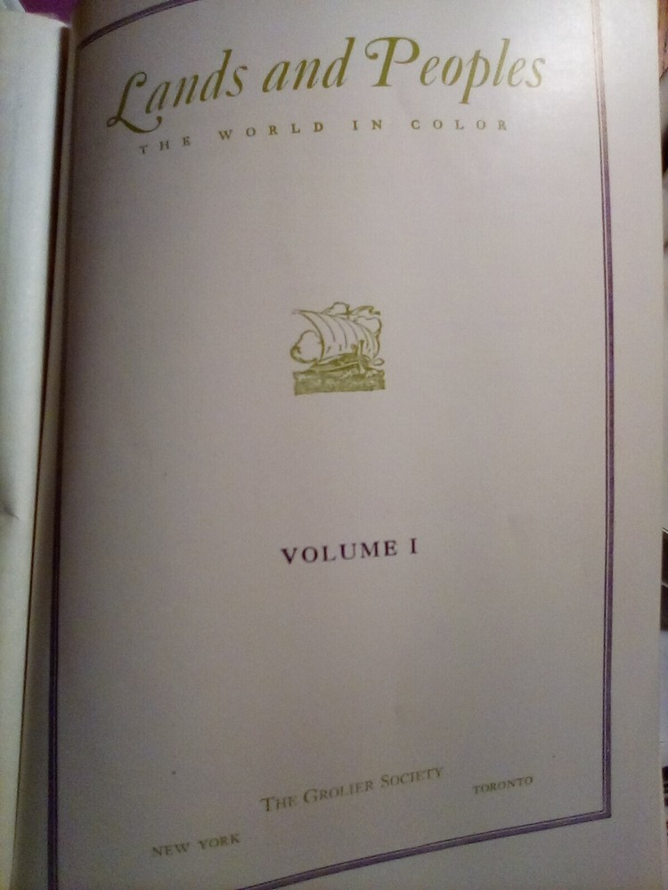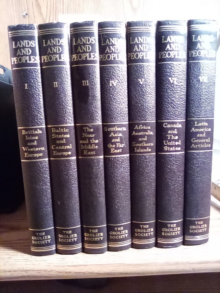 "Lands and Peoples" The World in Color This is a very good, unmarked, complete set of The Grolier Society's most famous publication-that is all seven volumes : 1 - British Isles and Western Europe; 2- Baltic States and Central Europe; 3 - The Near and the Middle East; 4 - Southern Asia and the Far East; 5 - Africa, Australia and Southern Islands; 6 - Canada and the United States; and 7 - Latin America and General Articles. These copies are unmarked, 6.25" X 9.75", illustrated in color and black and white, leather-bound and in very good condition. Very Clean!!