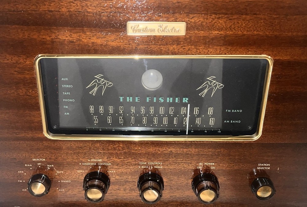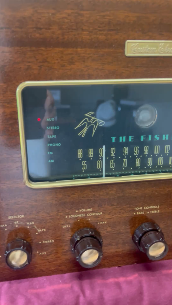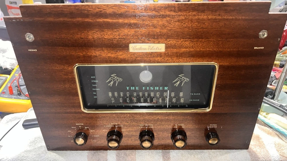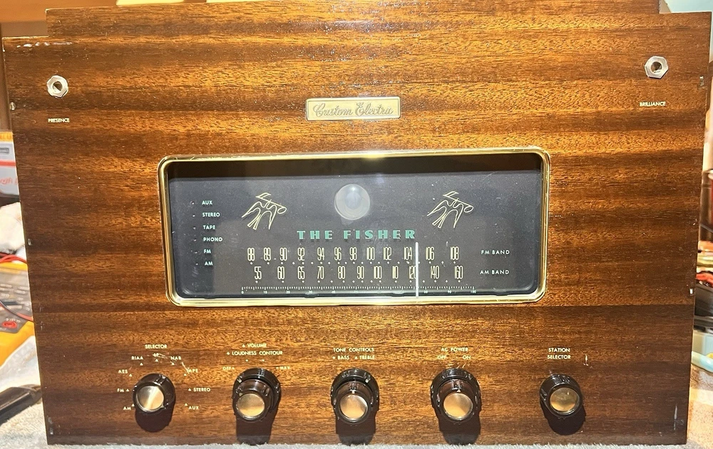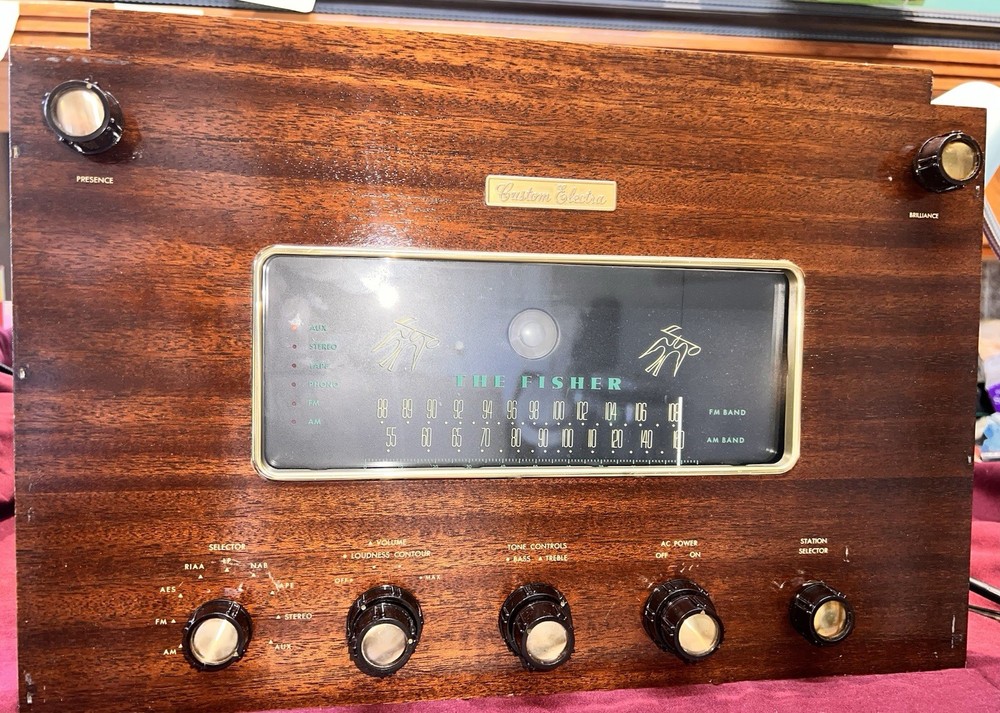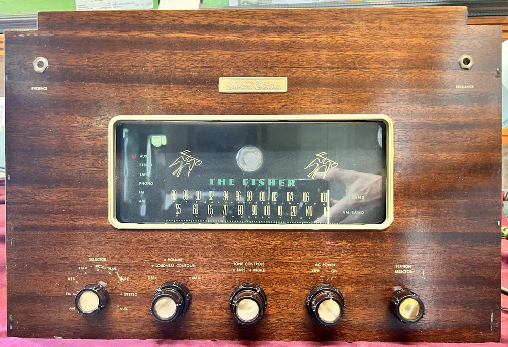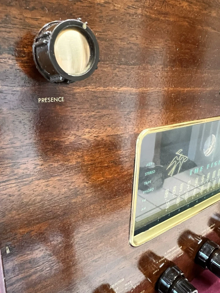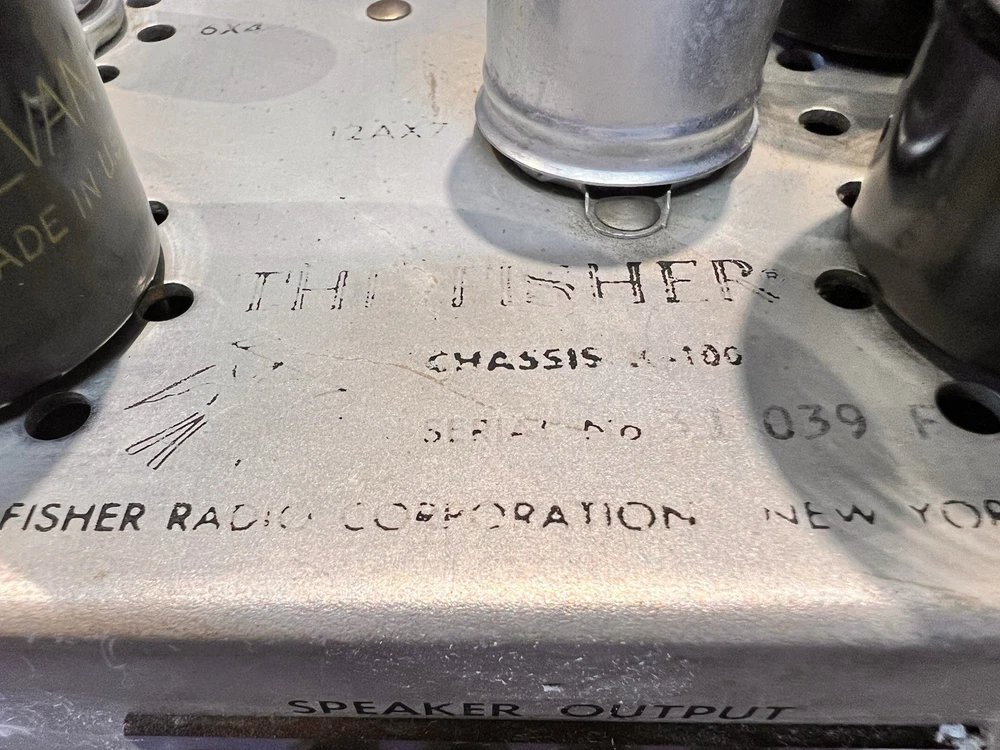 This is an extremely rare Fisher K-100 mono tube receiver amplifier. This chassis was standard issue in the early Fisher Custom Electra consoles so if you are restoring a late 1950s Fisher Custom Electra you must have this chassis to make it complete. It comes with its original near mint mahogany faceplate and outboard Brilliance & Presence attenuators with mounting brackets and knobs. The K-100 is the same exact amplifier as the famous Fisher 500 but made to fit the Custom Electra console with a different faceplate and uses the tuning eye tube instead of tuning meters for radio. My plan was to build a beautiful mahogany case to match the faceplate and make this into a very unique and awesome sounding mono rig but I just have not finished the project so I thought I would at least offer this up to someone who desperately needs it to complete their Custom Electra Console project or someone who would love to take my vision the last mile and build a nice case for it. I did get as far as meticulously servicing the amplifier with new capacitors and replaced any resistors that were out of specs while I was at it. This rig works flawlessly and sounds fantastic. I did not get to servicing the tuner. The left half of the FM band picks up stations but I cannot get any FM stations on the right half of the scale past about 98. I'm sure this is a simple repair but I'll admit I'm not an expert on tuner repairs so I have not dig into that issue yet. The radio tubes are the original Fisher branded tubes with the exception of the 6U8 tube which is a new old stock Amperex. For the power tubes I installed a beautiful matched pair of Mullard/Amperex Bugle Boy EL37s with matched codes and test at new old stock levels. For the (3) 12AX7 tubes I installed rugged original USA Philips mil spec 12AX7WA tubes. This amplifier is completely plug and play ready with excellent sounding phono and auxiliary stages but the tuner section will need to be serviced in order for this to be 100%.
