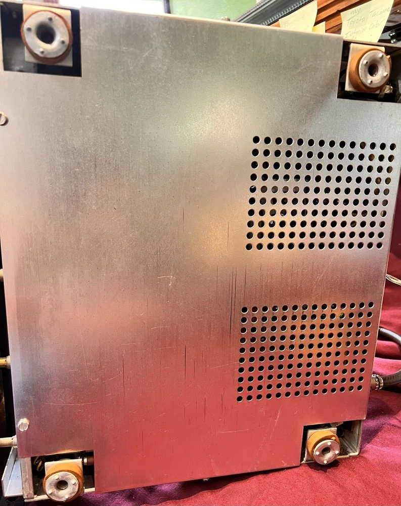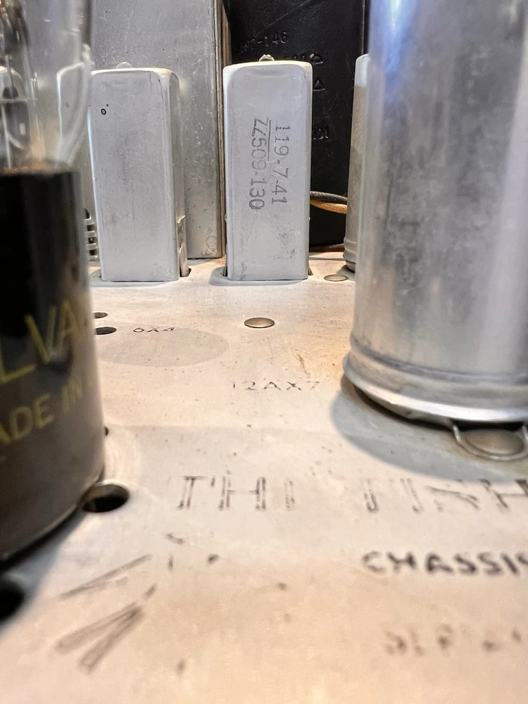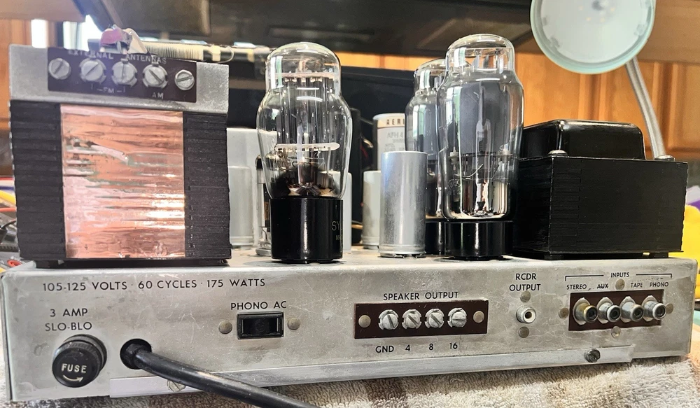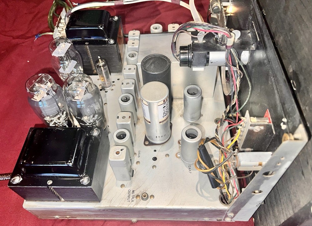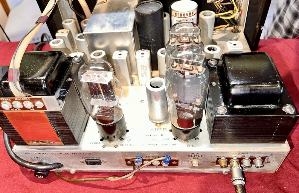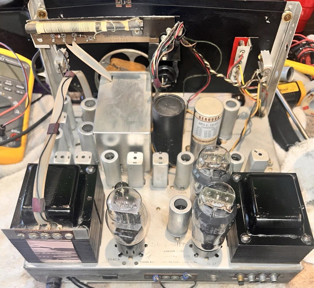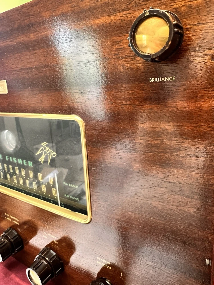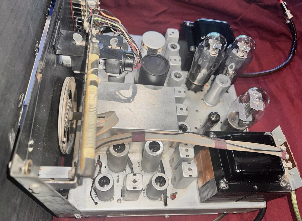 This is an extremely rare Fisher K-100 mono tube receiver amplifier. This chassis was standard issue in the early Fisher Custom Electra consoles so if you are restoring a late 1950s Fisher Custom Electra you must have this chassis to make it complete. It comes with its original near mint mahogany faceplate and outboard Brilliance & Presence attenuators with mounting brackets and knobs. The K-100 is the same exact amplifier as the famous Fisher 500 but made to fit the Custom Electra console with a different faceplate and uses the tuning eye tube instead of tuning meters for radio. My plan was to build a beautiful mahogany case to match the faceplate and make this into a very unique and awesome sounding mono rig but I just have not finished the project so I thought I would at least offer this up to someone who desperately needs it to complete their Custom Electra Console project or someone who would love to take my vision the last mile and build a nice case for it. I did get as far as meticulously servicing the amplifier with new capacitors and replaced any resistors that were out of specs while I was at it. This rig works flawlessly and sounds fantastic. I did not get to servicing the tuner. The left half of the FM band picks up stations but I cannot get any FM stations on the right half of the scale past about 98. I'm sure this is a simple repair but I'll admit I'm not an expert on tuner repairs so I have not dig into that issue yet. The radio tubes are the original Fisher branded tubes with the exception of the 6U8 tube which is a new old stock Amperex. For the power tubes I installed a beautiful matched pair of Mullard/Amperex Bugle Boy EL37s with matched codes and test at new old stock levels. For the (3) 12AX7 tubes I installed rugged original USA Philips mil spec 12AX7WA tubes. This amplifier is completely plug and play ready with excellent sounding phono and auxiliary stages but the tuner section will need to be serviced in order for this to be 100%.