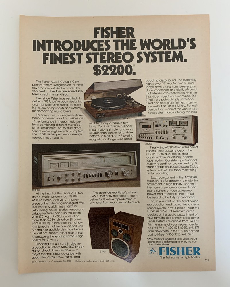 1978 Fisher ACS1590 Audio Component Stereo System Print Ad speakers, receiver. Condition is Used. Shipped with USPS First Class Package.