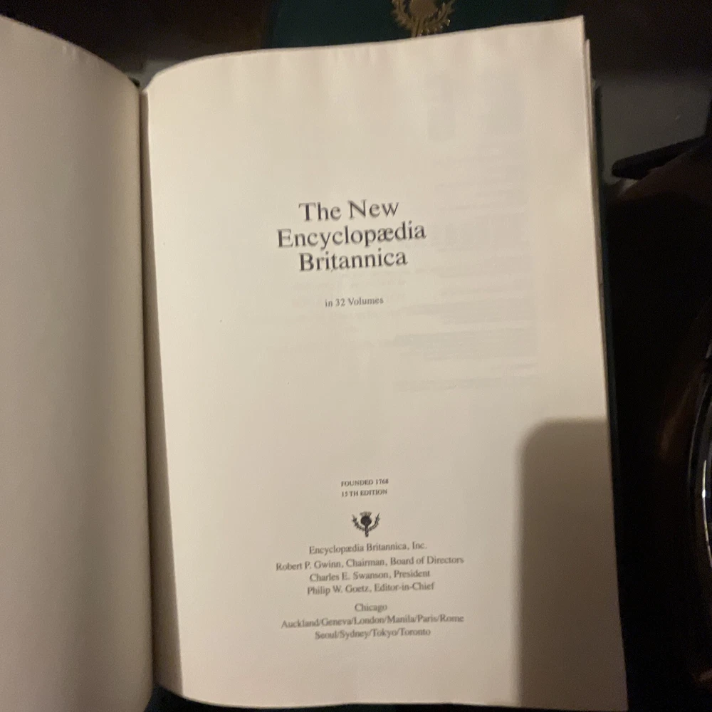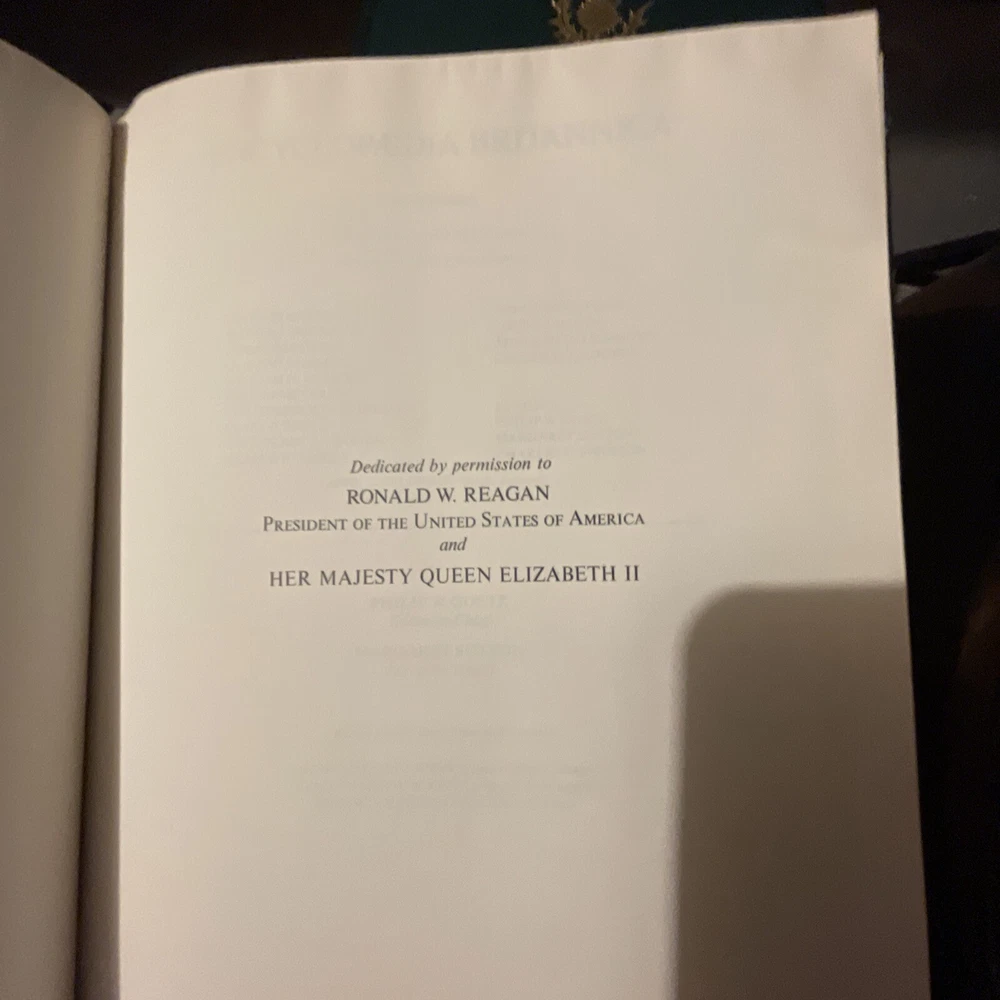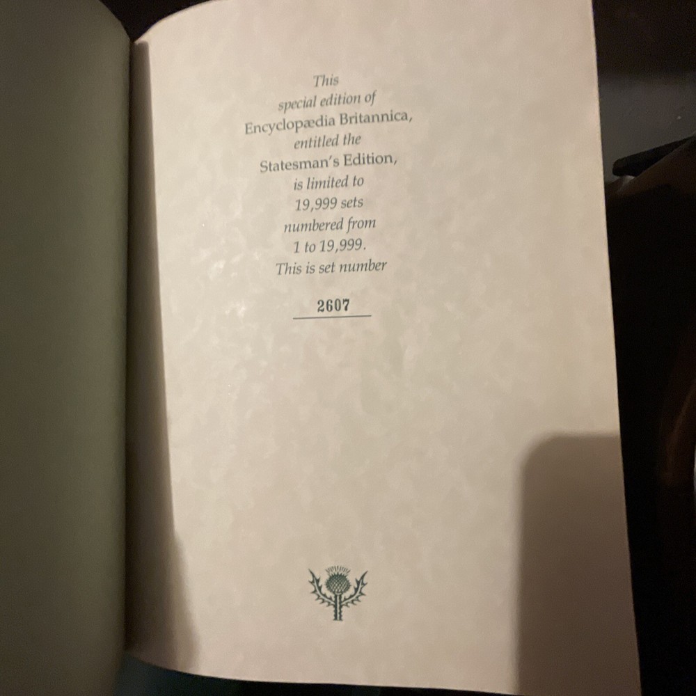1985 Encyclopedia Britannica 15th Edition Green Leather Bound Decorators Set. Limited edition: this is set number 2607, total limited set number from 1-19,999. 1985 Encyclopedia Britannica 15th Edition Green Faux Leather Bound Decorators / Collectors Set. Statesman’s Limited Edition 2607 /19,999 dedicated to President Ronald Reagan and Her Majesty Queen Elizabeth II, Gold embossed cover with Scottish thistle, gold top edge pages. Complete 32 volumes set including two index books and one guide book(the 3 books on the top of main photo. the very top one is guide book, in its spine, there are printing words--guide to Britannica), In excellent condition with minor imperfections. Most volumes are in near new condition. Each volume measures approximately 11” x 8.75” x1.7”. Ships with via USPS media mail with 24hours.