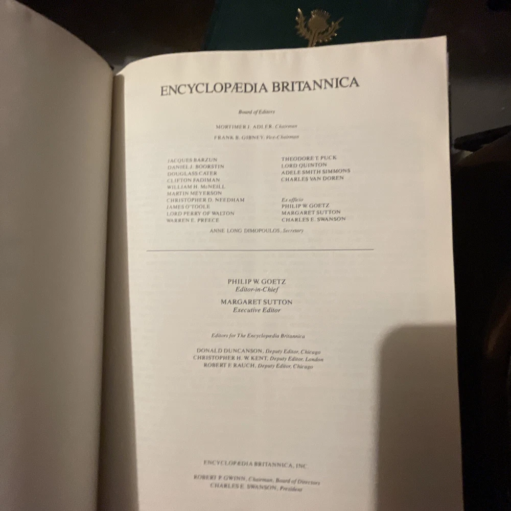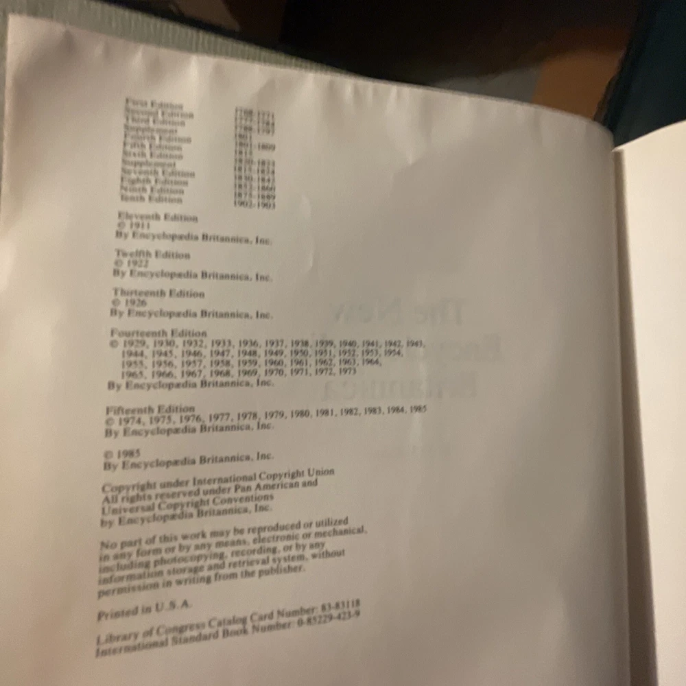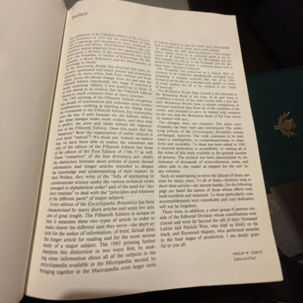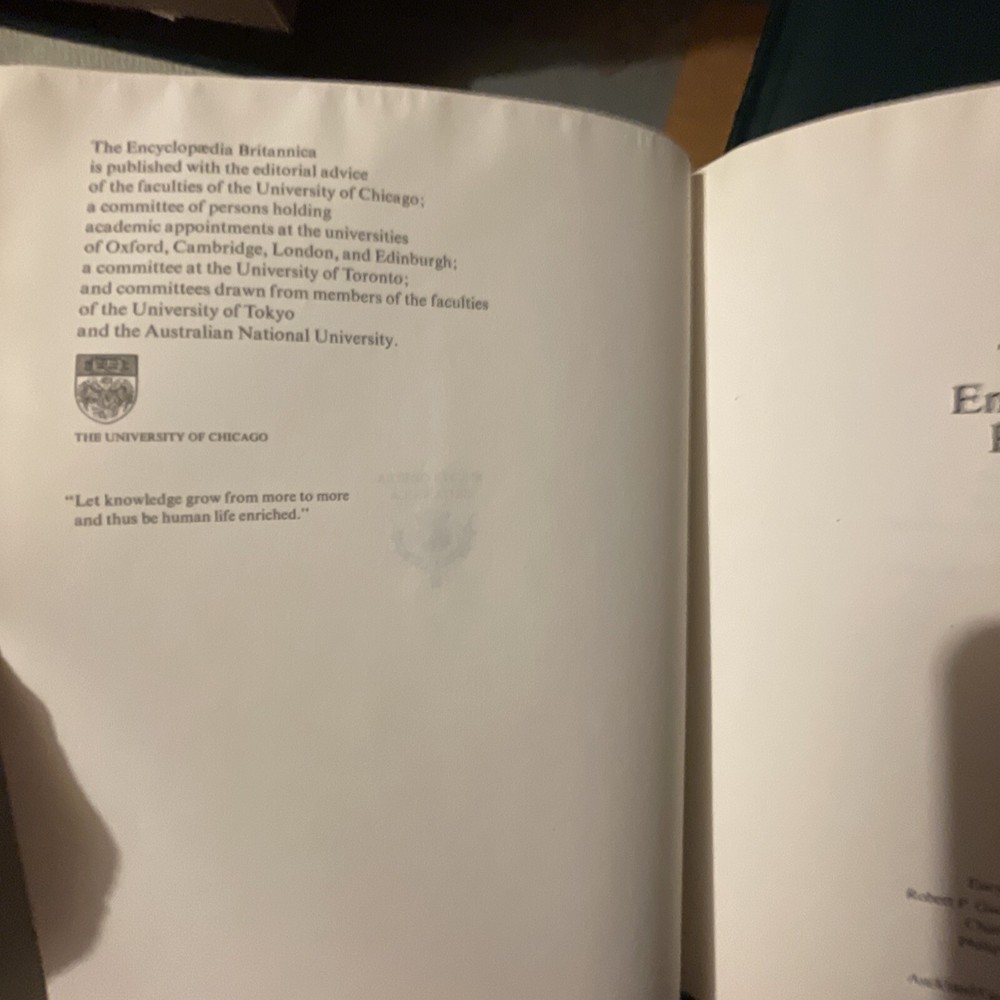 1985 Encyclopedia Britannica 15th Edition Green Leather Bound Decorators Set. Limited edition: this is set number 2607, total limited set number from 1-19,999. 1985 Encyclopedia Britannica 15th Edition Green Faux Leather Bound Decorators / Collectors Set. Statesman’s Limited Edition 2607 /19,999 dedicated to President Ronald Reagan and Her Majesty Queen Elizabeth II, Gold embossed cover with Scottish thistle, gold top edge pages. Complete 32 volumes set including two index books and one guide book(the 3 books on the top of main photo. the very top one is guide book, in its spine, there are printing words--guide to Britannica), In excellent condition with minor imperfections. Most volumes are in near new condition. Each volume measures approximately 11” x 8.75” x1.7”. Ships with via USPS media mail with 24hours.