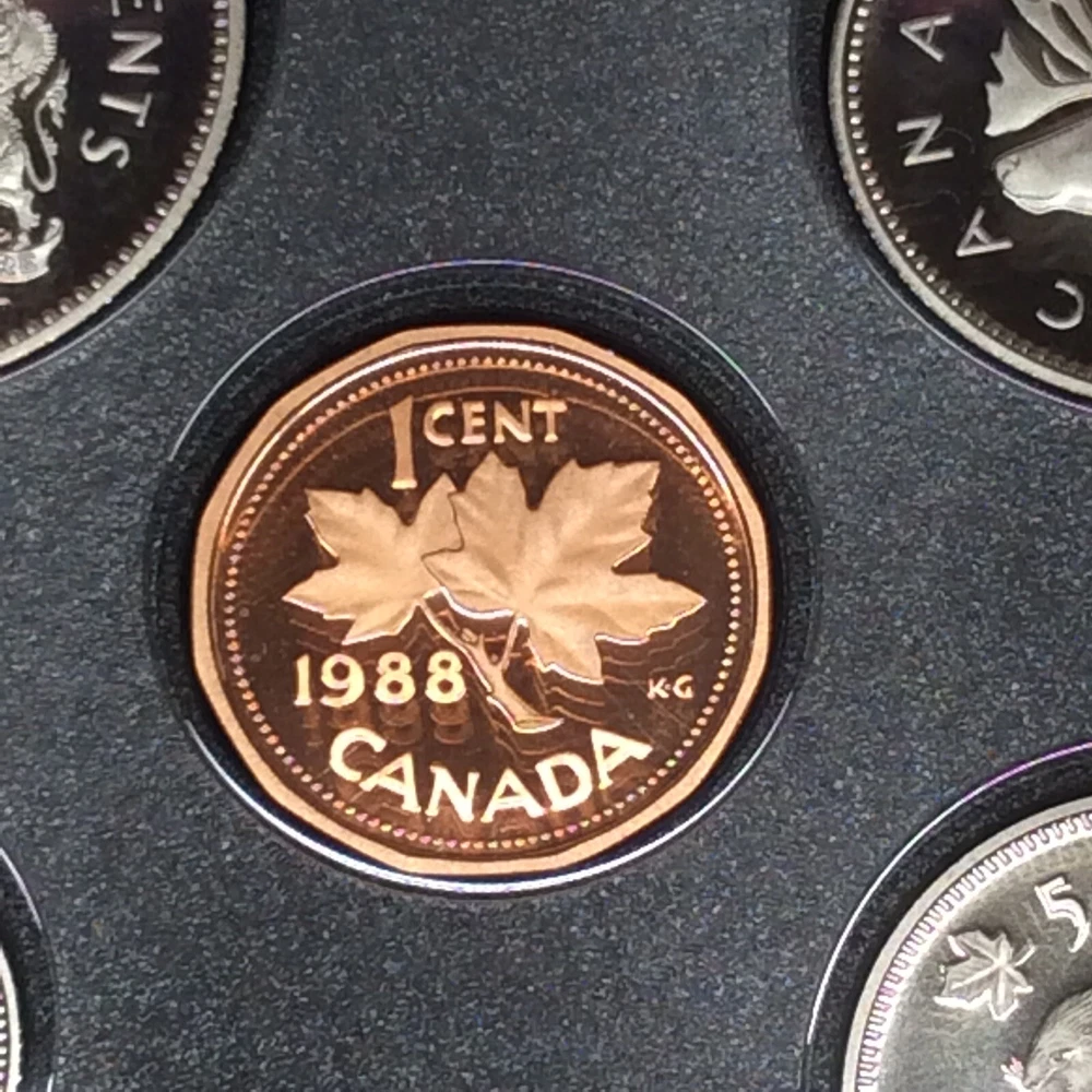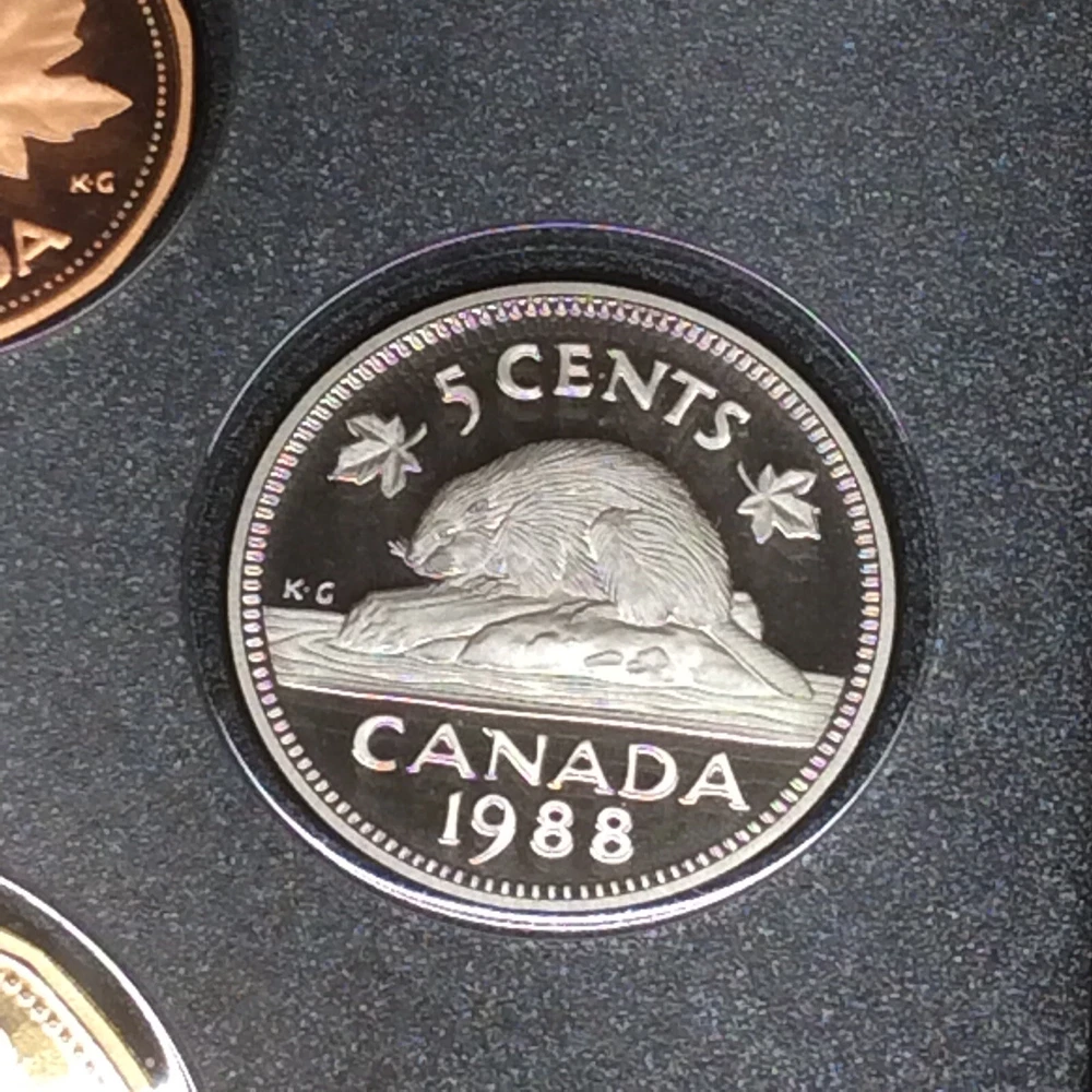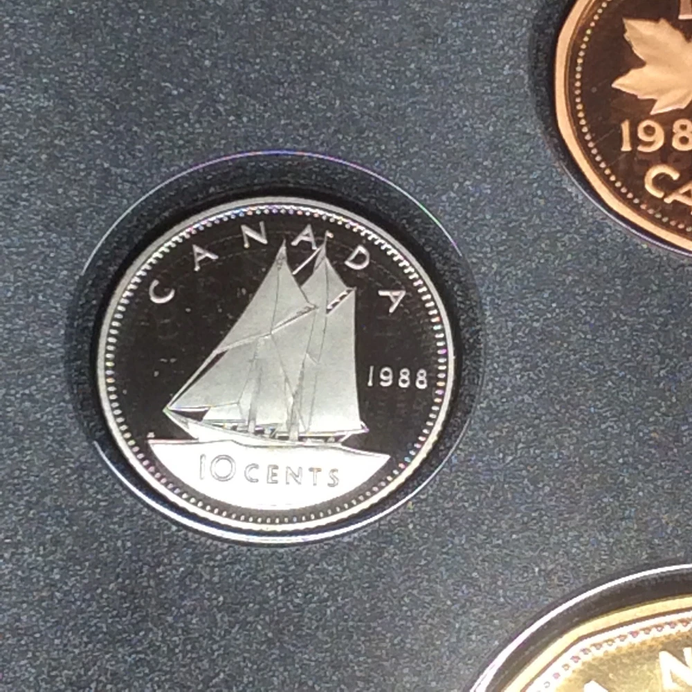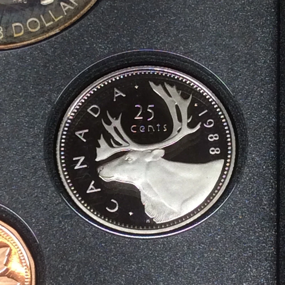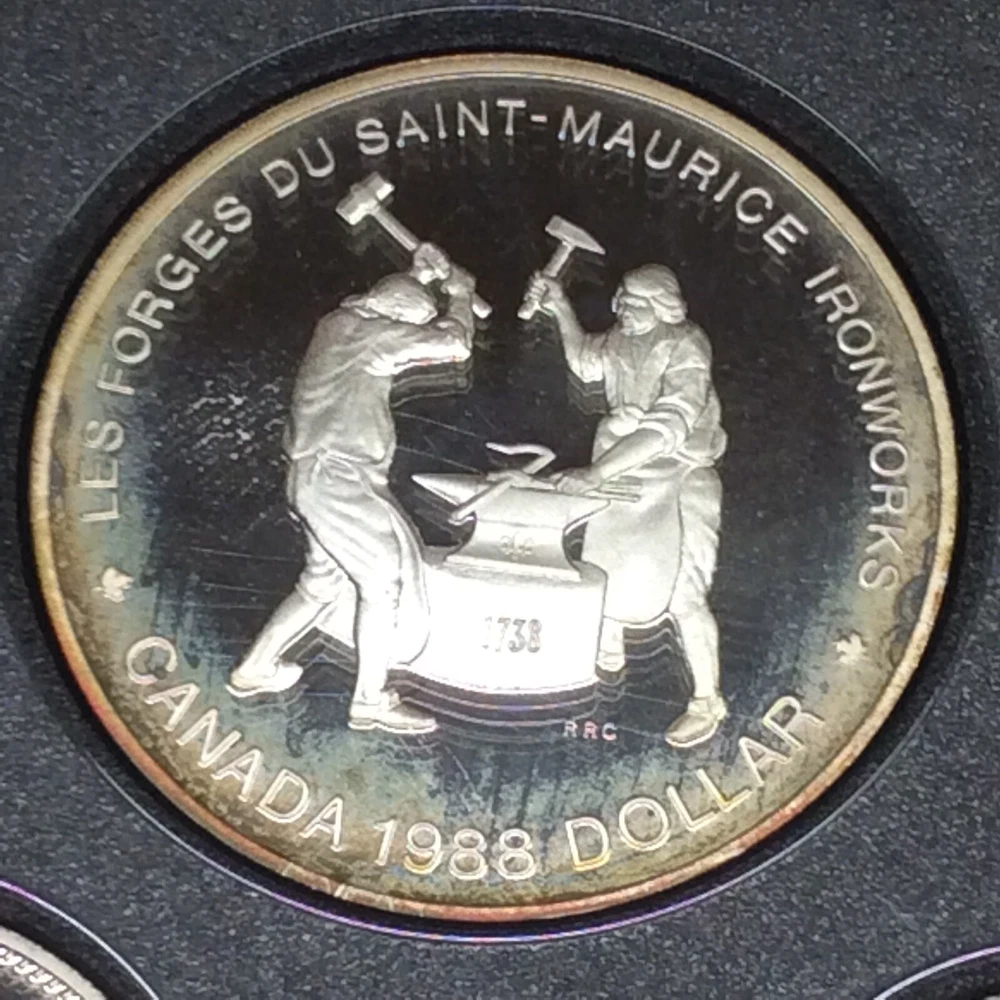 1988 RCM Canadien Mint Proof Set Double Dollar Leather Bound. Genuine Bonded Leather-Bound Case with RCM- Royal Canadien Mint Maple Leaf Logo and Banner This Canadian Double Dollar Set includes uncirculated Proof examples of each of the 1988 circulating coins, including the dollar, half-dollar, quarter, nickel, dime and cent along with a Les Forges Du Saint-Maurice Ironworks Silver Dollar. - Set contains .375 oz of Silver. - Comes in the original mint packaging, does not include outer box or COA. - Silver Dollar exhibits edge toning. - Obverse: A bust of Queen Elizabeth II and the date. - Reverse: Varies by denomination and the date. - Sovereign coins backed by the Canadian government. General Statement: Grading is subjective. Please use photographic images to determine condition of any raw coins, graded coins and/or accessories yourself. It is incumbent to perform your due diligence during an evaluation. If further questions exist, please contact through Ebay messages before making a purchase commitment. Thank You!