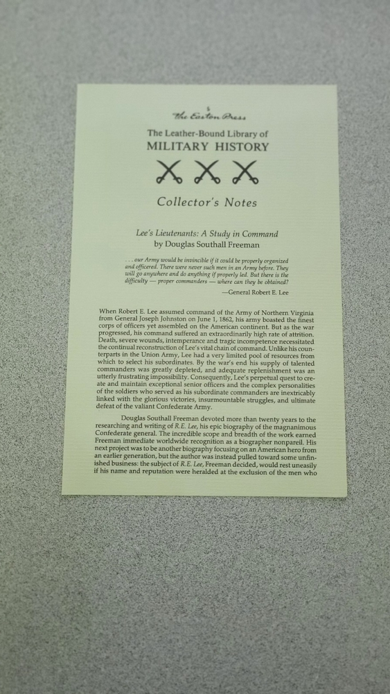 This is a three-volume set of leather-bound books written by Douglas Southall Freeman and published by Easton Press in 1991. The set is titled "Lee's Lieutenants" and is about children's topics. The books are in English and have a binding of leather.