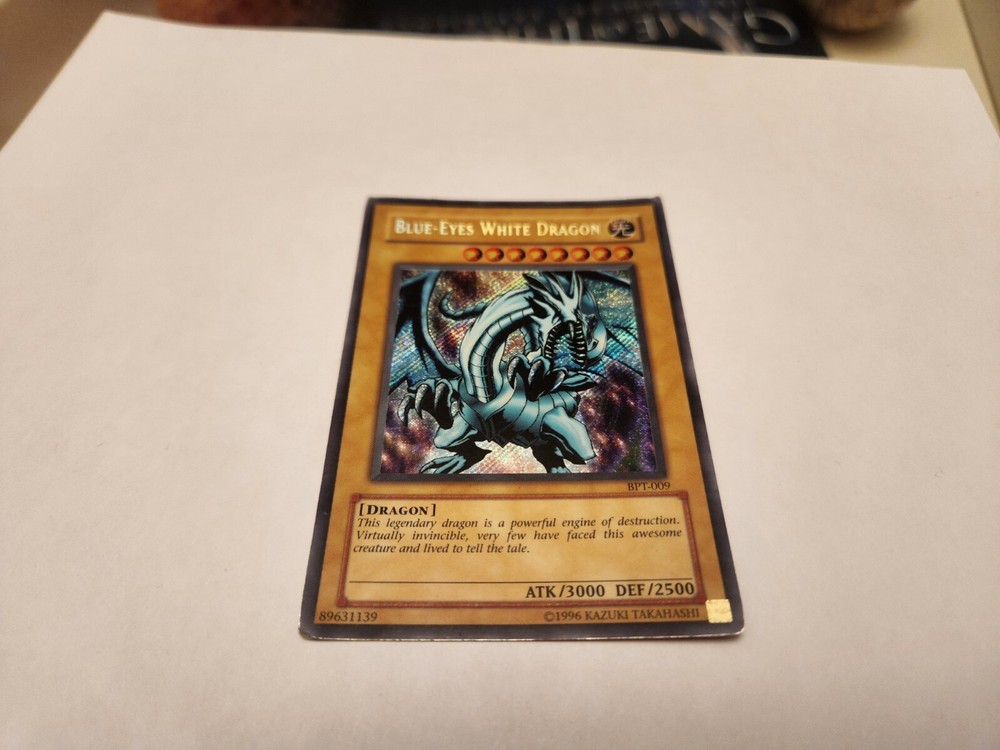 1st edition English Blue Eyes White Dragon holo card 1996. BPT-009 card in moderately played condition. Will ship the card in a protective sleeve.