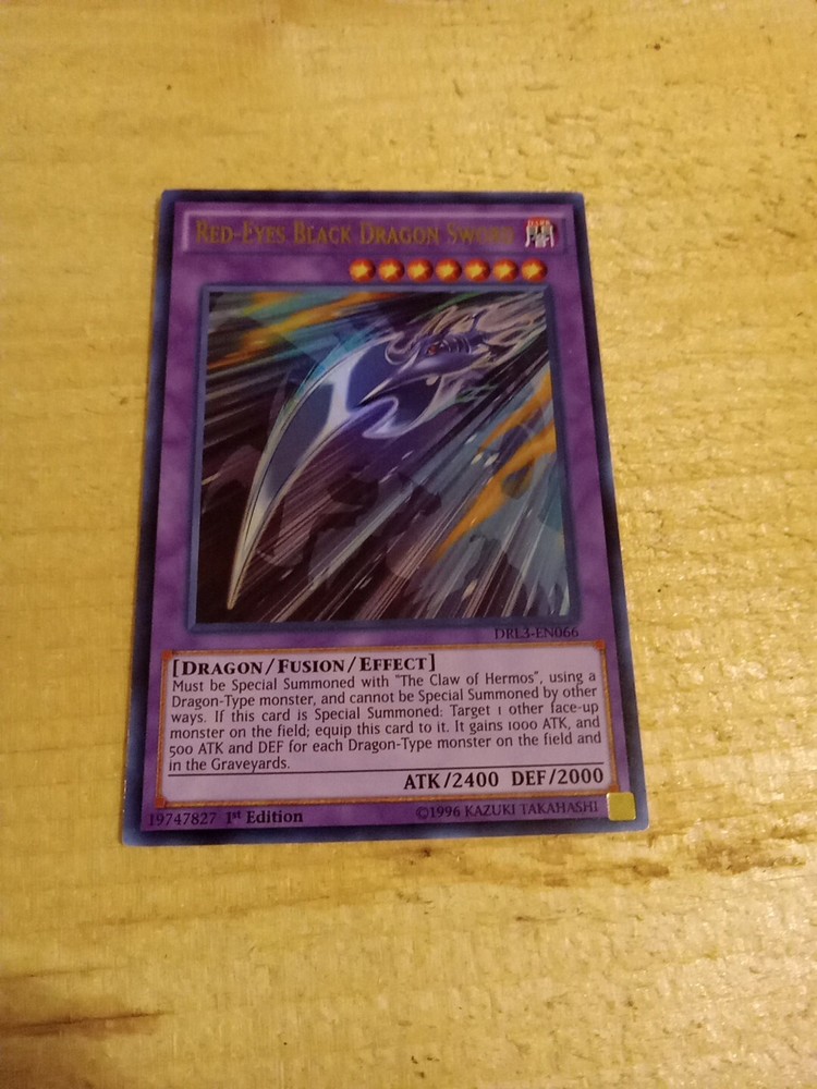 This is a rare and highly sought-after 1996 Red-Eyes Black Dragon Sword card from the Yu-Gi-Oh! TCG game. The card features a stunning foil finish and is in its original 1st Edition form, making it a valuable addition to any collector's set. The card is in English language and has not been autographed. It is a vintage card, manufactured in 1996, and is part of the DRL3-EN066 series. Don't miss out on the opportunity to own this incredible piece of Yu-Gi-Oh! history!