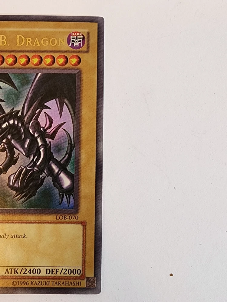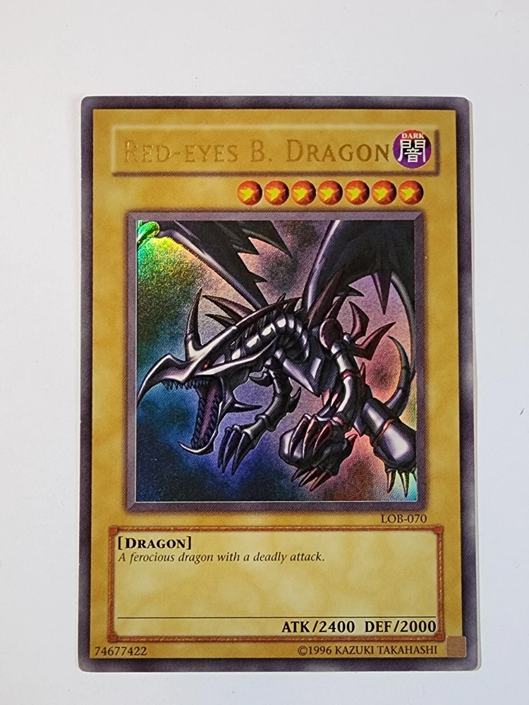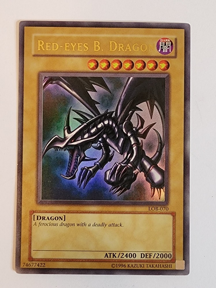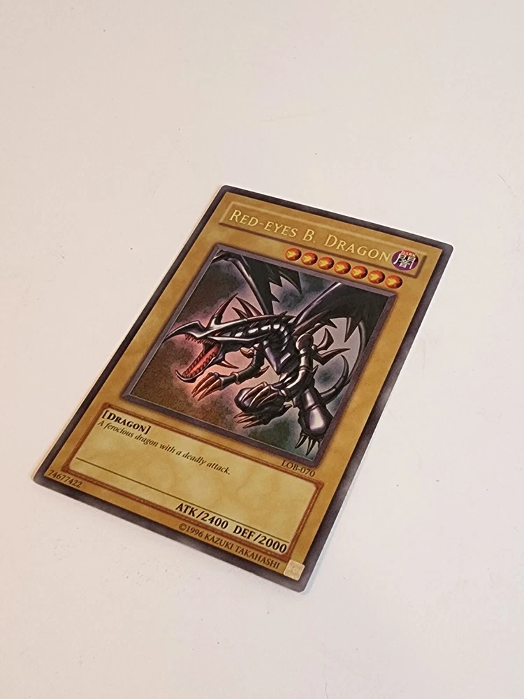 This Red-Eyes B. Dragon card from the Yu-Gi-Oh! TCG game is an ultra rare card with an attack power of 2400 and defense/toughness of 2000. It belongs to the creature/monster type of dragon and is colored dark. This card is in English language and has a card number of LOB-070. It is a normal card type and manufactured by Konami. The card features an unlimited edition and is ideal for collectors of CCG individual cards and collectible card games. This card is a must-have for fans of the game and collectors alike. Used Condition. Normal wear and tear.