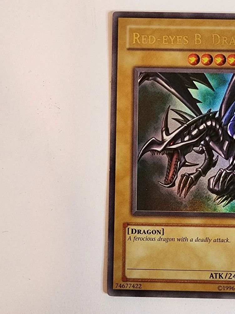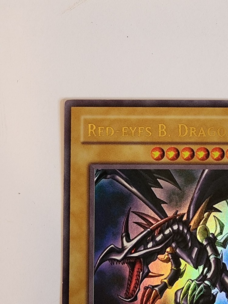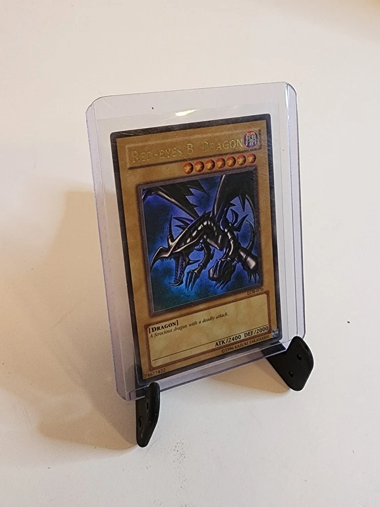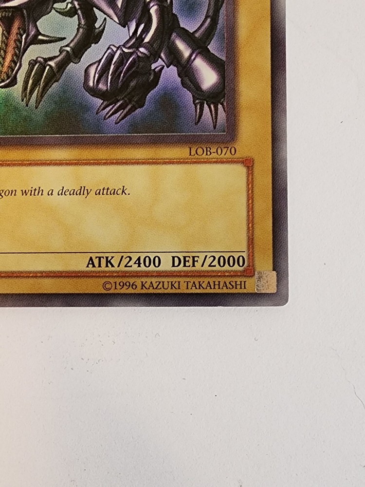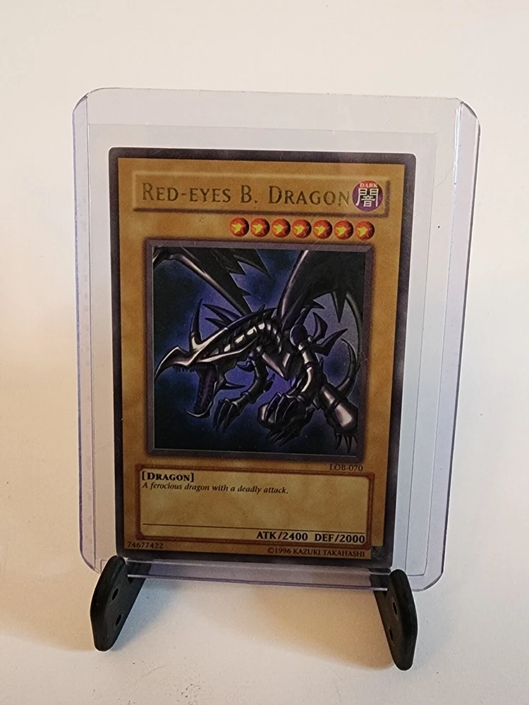 This Red-Eyes B. Dragon card from the Yu-Gi-Oh! TCG game is an ultra rare card with an attack power of 2400 and defense/toughness of 2000. It belongs to the creature/monster type of dragon and is colored dark. This card is in English language and has a card number of LOB-070. It is a normal card type and manufactured by Konami. The card features an unlimited edition and is ideal for collectors of CCG individual cards and collectible card games. This card is a must-have for fans of the game and collectors alike. Used Condition. Normal wear and tear.