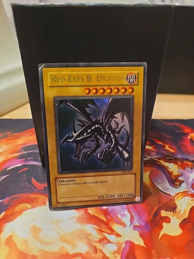 This is a 1996 Yu-Gi-Oh trading card featuring the iconic Red-Eyes Black Dragon character in holo finish. The card is in English language with card number SDJ-001 and belongs to the Creature/Monster Type of Dragon. It is manufactured by Konami and is part of the Yu-Gi-Oh! TCG game. It is made of card stock material and is not graded.