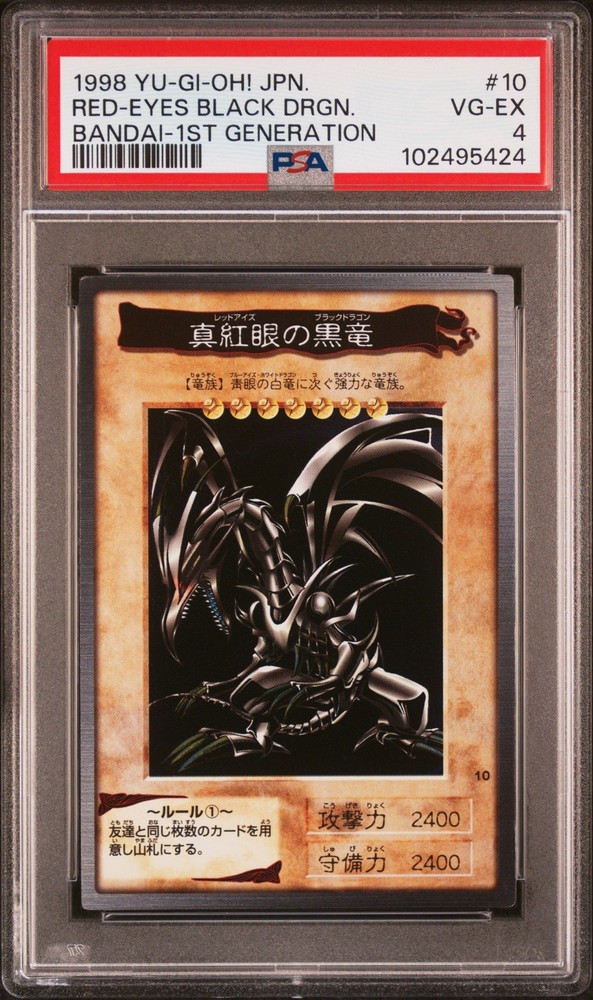 1998 YU-GI-OH! JAPANESE BANDAI-1ST GENERATION #10 RED-EYES BLACK DRAGON PSA 4 1998 YU-GI-OH! JAPANESE BANDAI-1ST GENERATION #10 RED-EYES BLACK DRAGON PSA 4 Purchase Info Thank you for your interest in this item consigned with PSA! By purchasing or making an offer on this item, you acknowledge and agree to the following terms: All sales are final. Returns not accepted. Payment must be made upon purchase of the item. All items are sold "as is" and without warranty of Collectors Universe, Inc. (d/b/a PSA), and ANY AND ALL IMPLIED WARRANTIES ARE DISCLAIMED AND EXCLUDED. Sales tax may apply depending on shipping address. PSA does not guarantee that another third-party grading company's authentication or certification of an item as genuine is correct or accurate. Neither a difference of opinion between third-party grading companies about authenticity, nor a company's subsequent reversal of its earlier authentication or certification of an item, will be a basis for rescinding a sale. Any dispute with another third-party grading company relating to the authenticity of an item must be resolved directly with that other company. Collectors' maximum liability in the event of loss or damage to an item during shipping will be the lesser of (a) the price paid for the item and (b) the change in fair market value of the item. You release Collectors from all other liability including for any claims of punitive damages, emotional distress, consequential damages, lost profits, or lost interest, except as prohibited by law. Shipping Purchased Items will be shipped directly from PSA Vault. You stay hands-free. PSA Vault When you purchase this item, you can save on sales tax and selling fees by keeping it in the PSA Vault, official Vault of eBay. Items already in PSA Vault and will be sent to PSA Vault will have no shipping charge Storage of any items with the PSA Vault will be subject to the PSA Vault Terms of Service. Consignment PSA has competitive rates on the world's largest collectibles marketplace with the option to list from the PSA Vault or immediately after PSA authentication and grading. Sale Price Under $100 $100 - $499 $500 - $999 $1,000 - $2,499 $2,500 - $4,999 $5,000+ Seller Fee 16% 14% 13% 10% 9% 7% Sellers pay a single fee as reflected above; no additional eBay fees are incurred. There is a $5 minimum fee on sold items.