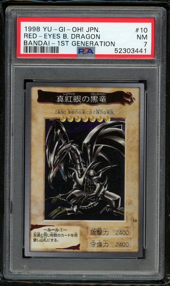 Hi, up for sale is a freshly slabbed, 1998 YU-GI-OH! JAPANESE BANDAI-1ST GENERATION 10 RED-EYES BLACK DRAGON -Ultra Rare. The card has been professionally graded by PSA Near Mint 7! This is an extremely rare card in this grade, as there are only 299 finer. This is a 87 population! Perfect for any fan of the Anime, TCG, OCG, Original arc of the series, plus, a must for fans of Seto Kaiba, Joey Wheeler and the duel between him and Rex Raptor, in which he won his most iconic card. A true trophy piece from before, the very first set of Yugioh. Also, can fit nicely into any display case. A great way to start your PSA Yu-Gi-Oh!/Red-Eyes Black Dragon Collection or just simply, add to it. Serious Best Offers will be entertained. Plus, if you do use this feature payment is due promptly. I list a 3 day handling time for the item, but usually ship the same day whenever I can. Plus, your item will be shipped in a box and fully protected. To see all of my items listed, simply go into my seller page, and filter by "newly listed or ending soonest". Thanks again. Good luck.