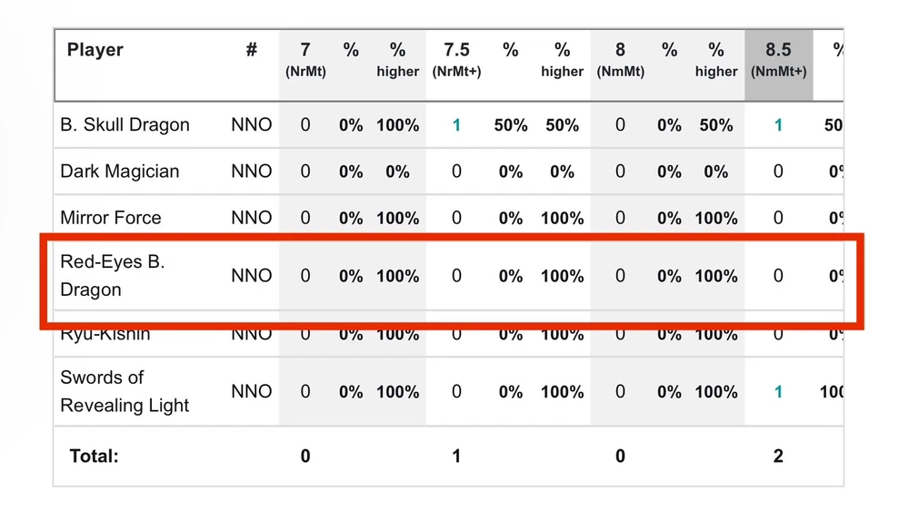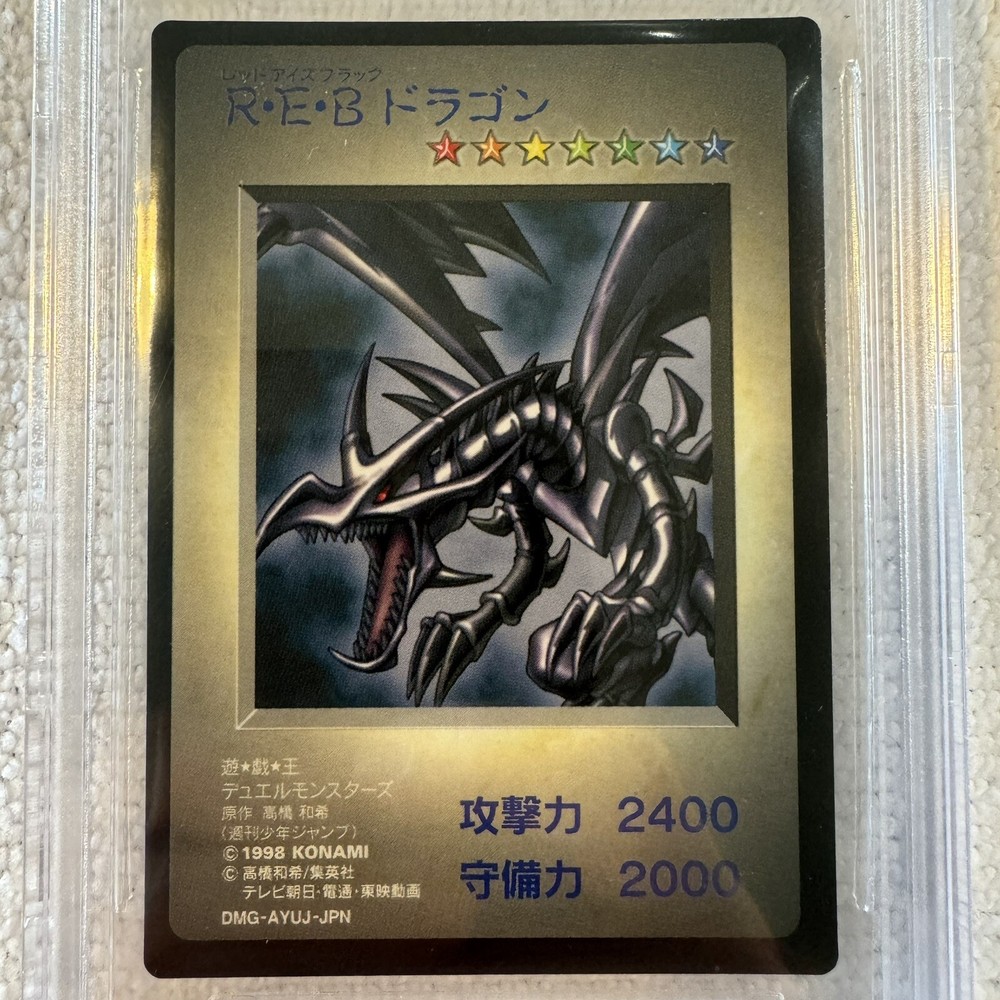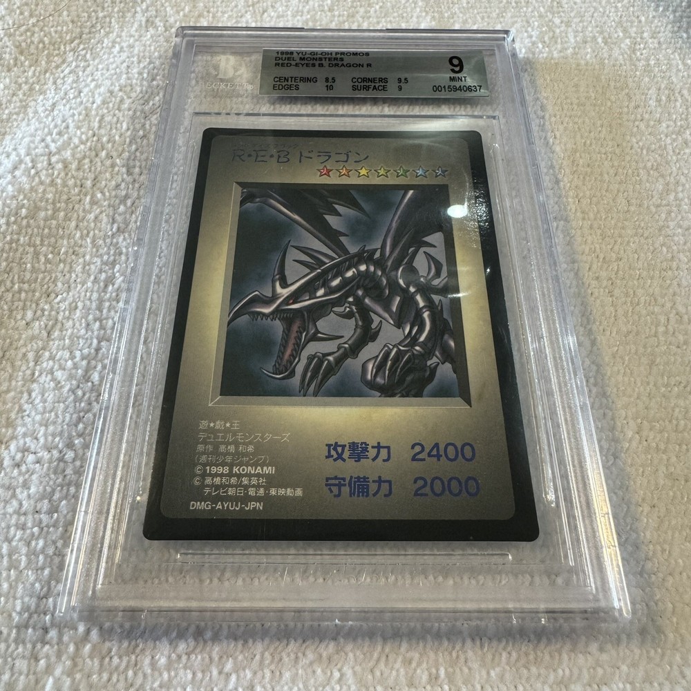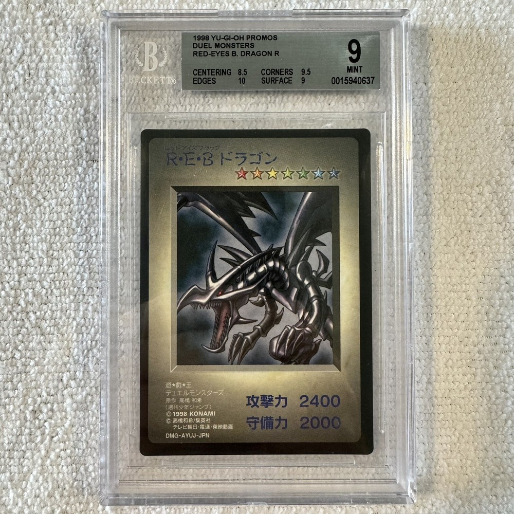 This rare 1998 YuGiOh card features the iconic Red Eyes Black Dragon from the 1998 Duel Monsters I game promo set. This design was Konami’s 1st attempt at making Yugioh cards and was the 1st print of this iconic art. BGS Pop shows only 2 in this grade with only 1 ever graded higher as of 2/15/2024.