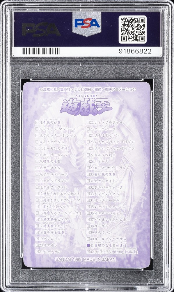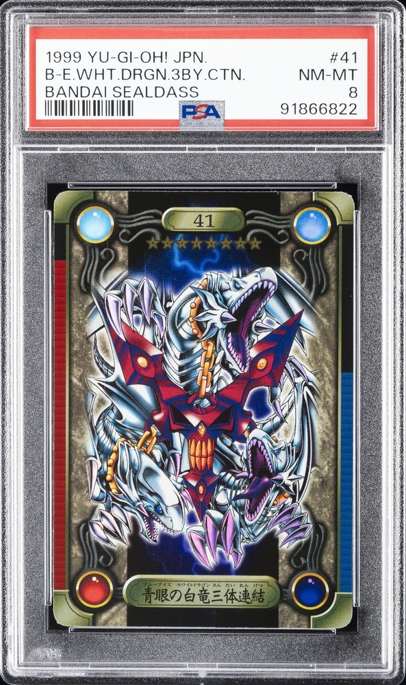 1999 YU-GI-OH! JAPANESE BANDAI SEALDASS #41 BLUE-EYES WHITE DRAGON'S 3-BODY CONNECTION PSA 8 1999 YU-GI-OH! JAPANESE BANDAI SEALDASS #41 BLUE-EYES WHITE DRAGON'S 3-BODY CONNECTION PSA 8 Purchase Info Thank you for your interest in this item consigned with PSA! By purchasing or making an offer on this item, you acknowledge and agree to the following terms: All sales are final. Returns not accepted. Payment must be made upon purchase of the item. All items are sold "as is" and without warranty of Collectors Universe, Inc. (d/b/a PSA), and ANY AND ALL IMPLIED WARRANTIES ARE DISCLAIMED AND EXCLUDED. Sales tax may apply depending on shipping address. PSA does not guarantee that another third-party grading company's authentication or certification of an item as genuine is correct or accurate. Neither a difference of opinion between third-party grading companies about authenticity, nor a company's subsequent reversal of its earlier authentication or certification of an item, will be a basis for rescinding a sale. Any dispute with another third-party grading company relating to the authenticity of an item must be resolved directly with that other company. Collectors' maximum liability in the event of loss or damage to an item during shipping will be the lesser of (a) the price paid for the item and (b) the change in fair market value of the item. You release Collectors from all other liability including for any claims of punitive damages, emotional distress, consequential damages, lost profits, or lost interest, except as prohibited by law. Shipping Purchased Items will be shipped directly from PSA Vault. You stay hands-free. PSA Vault When you purchase this item, you can save on sales tax and selling fees by keeping it in the PSA Vault, official Vault of eBay. Items already in PSA Vault and will be sent to PSA Vault will have no shipping charge Storage of any items with the PSA Vault will be subject to the PSA Vault Terms of Service. Consignment PSA has competitive rates on the world's largest collectibles marketplace with the option to list from the PSA Vault or immediately after PSA authentication and grading. Sale Price Under $100 $100 - $499 $500 - $999 $1,000 - $2,499 $2,500 - $4,999 $5,000+ Seller Fee 16% 14% 13% 10% 9% 7% Sellers pay a single fee as reflected above; no additional eBay fees are incurred. There is a $5 minimum fee on sold items.