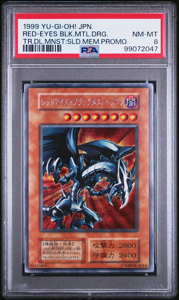 1999 YU-GI-OH! JAPANESE TRUE DUEL MONSTERS: SEALED MEMORIES PROMO RED-EYES BLACK METAL DRAGON PSA 8 1999 YU-GI-OH! JAPANESE TRUE DUEL MONSTERS: SEALED MEMORIES PROMO RED-EYES BLACK METAL DRAGON PSA 8 Purchase Info Thank you for your interest in this item consigned with PSA! By purchasing or making an offer on this item, you acknowledge and agree to the following terms: All sales are final. Returns not accepted. Payment must be made upon purchase of the item. All items are sold "as is" and without warranty of Collectors Universe, Inc. (d/b/a PSA), and ANY AND ALL IMPLIED WARRANTIES ARE DISCLAIMED AND EXCLUDED. Sales tax may apply depending on shipping address. PSA does not guarantee that another third-party grading company's authentication or certification of an item as genuine is correct or accurate. Neither a difference of opinion between third-party grading companies about authenticity, nor a company's subsequent reversal of its earlier authentication or certification of an item, will be a basis for rescinding a sale. Any dispute with another third-party grading company relating to the authenticity of an item must be resolved directly with that other company. Collectors' maximum liability in the event of loss or damage to an item during shipping will be the lesser of (a) the price paid for the item and (b) the change in fair market value of the item. You release Collectors from all other liability including for any claims of punitive damages, emotional distress, consequential damages, lost profits, or lost interest, except as prohibited by law. Shipping Purchased Items will be shipped directly from PSA Vault. You stay hands-free. PSA Vault When you purchase this item, you can save on sales tax and selling fees by keeping it in the PSA Vault, official Vault of eBay. Items already in PSA Vault and will be sent to PSA Vault will have no shipping charge Storage of any items with the PSA Vault will be subject to the PSA Vault Terms of Service. Consignment PSA has competitive rates on the world's largest collectibles marketplace with the option to list from the PSA Vault or immediately after PSA authentication and grading. Sale Price Under $100 $100 - $499 $500 - $999 $1,000 - $2,499 $2,500 - $4,999 $5,000+ Seller Fee 16% 14% 13% 10% 9% 7% Sellers pay a single fee as reflected above; no additional eBay fees are incurred. There is a $5 minimum fee on sold items.