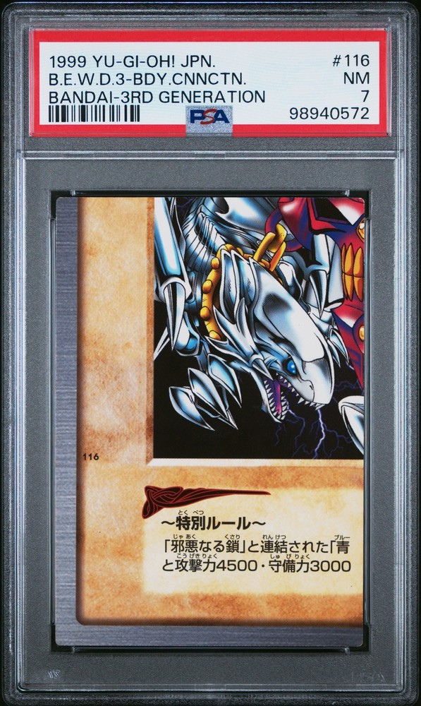 1999 YU-GI-OH! JAPANESE BANDAI-3RD GENERATION #116 BLUE-EYES WHITE DRAGON'S 3-BODY CONNECTION PSA 7 1999 YU-GI-OH! JAPANESE BANDAI-3RD GENERATION #116 BLUE-EYES WHITE DRAGON'S 3-BODY CONNECTION PSA 7 Purchase Info Thank you for your interest in this item consigned with PSA! By purchasing or making an offer on this item, you acknowledge and agree to the following terms: All sales are final. Returns not accepted. Payment must be made upon purchase of the item. All items are sold "as is" and without warranty of Collectors Universe, Inc. (d/b/a PSA), and ANY AND ALL IMPLIED WARRANTIES ARE DISCLAIMED AND EXCLUDED. Sales tax may apply depending on shipping address. PSA does not guarantee that another third-party grading company's authentication or certification of an item as genuine is correct or accurate. Neither a difference of opinion between third-party grading companies about authenticity, nor a company's subsequent reversal of its earlier authentication or certification of an item, will be a basis for rescinding a sale. Any dispute with another third-party grading company relating to the authenticity of an item must be resolved directly with that other company. Collectors' maximum liability in the event of loss or damage to an item during shipping will be the lesser of (a) the price paid for the item and (b) the change in fair market value of the item. You release Collectors from all other liability including for any claims of punitive damages, emotional distress, consequential damages, lost profits, or lost interest, except as prohibited by law. Shipping Purchased Items will be shipped directly from PSA Vault. You stay hands-free. PSA Vault When you purchase this item, you can save on sales tax and selling fees by keeping it in the PSA Vault, official Vault of eBay. Items already in PSA Vault and will be sent to PSA Vault will have no shipping charge Storage of any items with the PSA Vault will be subject to the PSA Vault Terms of Service. Consignment PSA has competitive rates on the world's largest collectibles marketplace with the option to list from the PSA Vault or immediately after PSA authentication and grading. Sale Price Under $100 $100 - $499 $500 - $999 $1,000 - $2,499 $2,500 - $4,999 $5,000+ Seller Fee 16% 14% 13% 10% 9% 7% Sellers pay a single fee as reflected above; no additional eBay fees are incurred. There is a $5 minimum fee on sold items.