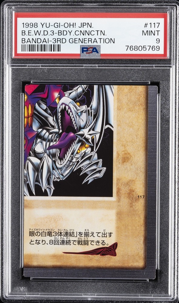 1999 YU-GI-OH! JAPANESE BANDAI-3RD GENERATION #117 BLUE-EYES WHITE DRAGON'S 3-BODY CONNECTION PSA 9 1999 YU-GI-OH! JAPANESE BANDAI-3RD GENERATION #117 BLUE-EYES WHITE DRAGON'S 3-BODY CONNECTION PSA 9 Purchase Info Thank you for your interest in bidding on this item consigned with PSA! By bidding on this item, you acknowledge and agree to the following terms: All sales are final. Returns not accepted. Payment must be made within 7 days of auction close. All items are sold "as is" and without warranty of Collectors Universe, Inc. (d/b/a PSA), and ANY AND ALL IMPLIED WARRANTIES ARE DISCLAIMED AND EXCLUDED. Sales tax may apply depending on shipping address. PSA does not guarantee that another third-party grading company's authentication or certification of an item as genuine is correct or accurate. Neither a difference of opinion between third-party grading companies about authenticity, nor a company's subsequent reversal of its earlier authentication or certification of an item, will be a basis for rescinding a sale. Any dispute with another third-party grading company relating to the authenticity of an item must be resolved directly with that other company. Collectors' maximum liability in the event of loss or damage to an item during shipping will be the lesser of (a) the price paid for the item and (b) the change in fair market value of the item. You release Collectors from all other liability including for any claims of punitive damages, emotional distress, consequential damages, lost profits, or lost interest, except as prohibited by law. Shipping Purchased Items will be shipped directly from PSA Vault. You stay hands-free. PSA Vault When you purchase this item, you can save on sales tax and selling fees by keeping it in the PSA Vault, official Vault of eBay. Items already in PSA Vault and will be sent to PSA Vault will have no shipping charge Storage of any items with the PSA Vault will be subject to the PSA Vault Terms of Service. Consignment PSA has competitive auction rates on the world's largest collectibles marketplace with the option to list from the PSA Vault or immediately after PSA authentication and grading. Sale Price Under $100 $100 - $499 $500 - $999 $1,000 - $2,499 $2,500 - $4,999 $5,000+ Seller Fee 13% + $3 flat 13% 12% 10% 9% 7% Sellers pay a single fee as reflected above; no additional eBay fees are incurred.