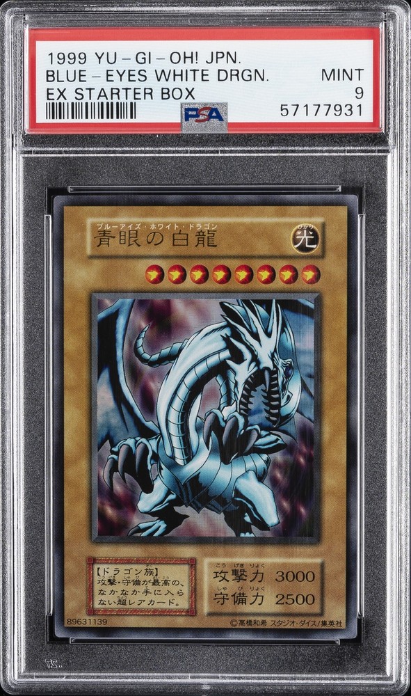 1999 YU-GI-OH! JAPANESE EX STARTER BOX BLUE-EYES WHITE DRAGON PSA 9 1999 YU-GI-OH! JAPANESE EX STARTER BOX BLUE-EYES WHITE DRAGON PSA 9 Purchase Info Thank you for your interest in this item consigned with PSA! By purchasing or making an offer on this item, you acknowledge and agree to the following terms: All sales are final. Returns not accepted. Payment must be made upon purchase of the item. All items are sold "as is" and without warranty of Collectors Universe, Inc. (d/b/a PSA), and ANY AND ALL IMPLIED WARRANTIES ARE DISCLAIMED AND EXCLUDED. Sales tax may apply depending on shipping address. PSA does not guarantee that another third-party grading company's authentication or certification of an item as genuine is correct or accurate. Neither a difference of opinion between third-party grading companies about authenticity, nor a company's subsequent reversal of its earlier authentication or certification of an item, will be a basis for rescinding a sale. Any dispute with another third-party grading company relating to the authenticity of an item must be resolved directly with that other company. Collectors' maximum liability in the event of loss or damage to an item during shipping will be the lesser of (a) the price paid for the item and (b) the change in fair market value of the item. You release Collectors from all other liability including for any claims of punitive damages, emotional distress, consequential damages, lost profits, or lost interest, except as prohibited by law. Shipping Purchased Items will be shipped directly from PSA Vault. You stay hands-free. PSA Vault When you purchase this item, you can save on sales tax and selling fees by keeping it in the PSA Vault, official Vault of eBay. Items already in PSA Vault and will be sent to PSA Vault will have no shipping charge Storage of any items with the PSA Vault will be subject to the PSA Vault Terms of Service. Consignment PSA has competitive rates on the world's largest collectibles marketplace with the option to list from the PSA Vault or immediately after PSA authentication and grading. Sale Price Under $100 $100 - $499 $500 - $999 $1,000 - $2,499 $2,500 - $4,999 $5,000+ Seller Fee 13% + $3 flat 13% 12% 10% 9% 7% Sellers pay a single fee as reflected above; no additional eBay fees are incurred.
