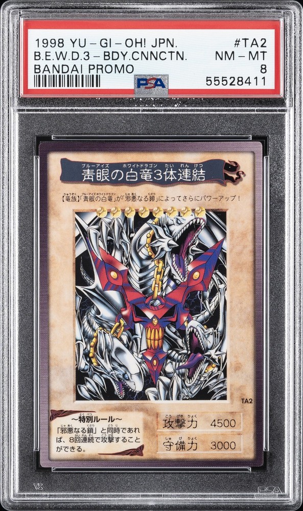 1999 YU-GI-OH! JAPANESE BANDAI PROMO #TA2 BLUE-EYES WHITE DRAGON'S 3-BODY CONNECTION PSA 8 1999 YU-GI-OH! JAPANESE BANDAI PROMO #TA2 BLUE-EYES WHITE DRAGON'S 3-BODY CONNECTION PSA 8 Purchase Info Thank you for your interest in this item consigned with PSA! By purchasing or making an offer on this item, you acknowledge and agree to the following terms: All sales are final. Returns not accepted. Payment must be made upon purchase of the item. All items are sold "as is" and without warranty of Collectors Universe, Inc. (d/b/a PSA), and ANY AND ALL IMPLIED WARRANTIES ARE DISCLAIMED AND EXCLUDED. Sales tax may apply depending on shipping address. PSA does not guarantee that another third-party grading company's authentication or certification of an item as genuine is correct or accurate. Neither a difference of opinion between third-party grading companies about authenticity, nor a company's subsequent reversal of its earlier authentication or certification of an item, will be a basis for rescinding a sale. Any dispute with another third-party grading company relating to the authenticity of an item must be resolved directly with that other company. Collectors' maximum liability in the event of loss or damage to an item during shipping will be the lesser of (a) the price paid for the item and (b) the change in fair market value of the item. You release Collectors from all other liability including for any claims of punitive damages, emotional distress, consequential damages, lost profits, or lost interest, except as prohibited by law. Shipping Purchased Items will be shipped directly from PSA Vault. You stay hands-free. PSA Vault When you purchase this item, you can save on sales tax and selling fees by keeping it in the PSA Vault, official Vault of eBay. Items already in PSA Vault and will be sent to PSA Vault will have no shipping charge Storage of any items with the PSA Vault will be subject to the PSA Vault Terms of Service. Consignment PSA has competitive rates on the world's largest collectibles marketplace with the option to list from the PSA Vault or immediately after PSA authentication and grading. Sale Price Under $100 $100 - $499 $500 - $999 $1,000 - $2,499 $2,500 - $4,999 $5,000+ Seller Fee 16% 14% 13% 10% 9% 7% Sellers pay a single fee as reflected above; no additional eBay fees are incurred. There is a $5 minimum fee on sold items.