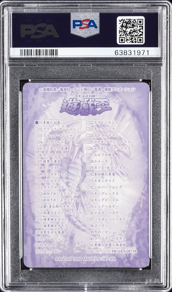 1999 YU-GI-OH! JAPANESE BANDAI SEALDASS #01 BLUE-EYES WHITE DRAGON PSA 9 1999 YU-GI-OH! JAPANESE BANDAI SEALDASS #01 BLUE-EYES WHITE DRAGON PSA 9 Purchase Info Thank you for your interest in this item consigned with PSA! By purchasing or making an offer on this item, you acknowledge and agree to the following terms: All sales are final. Returns not accepted. Payment must be made upon purchase of the item. All items are sold "as is" and without warranty of Collectors Universe, Inc. (d/b/a PSA), and ANY AND ALL IMPLIED WARRANTIES ARE DISCLAIMED AND EXCLUDED. Sales tax may apply depending on shipping address. PSA does not guarantee that another third-party grading company's authentication or certification of an item as genuine is correct or accurate. Neither a difference of opinion between third-party grading companies about authenticity, nor a company's subsequent reversal of its earlier authentication or certification of an item, will be a basis for rescinding a sale. Any dispute with another third-party grading company relating to the authenticity of an item must be resolved directly with that other company. Collectors' maximum liability in the event of loss or damage to an item during shipping will be the lesser of (a) the price paid for the item and (b) the change in fair market value of the item. You release Collectors from all other liability including for any claims of punitive damages, emotional distress, consequential damages, lost profits, or lost interest, except as prohibited by law. Shipping Purchased Items will be shipped directly from PSA Vault. You stay hands-free. PSA Vault When you purchase this item, you can save on sales tax and selling fees by keeping it in the PSA Vault, official Vault of eBay. Items already in PSA Vault and will be sent to PSA Vault will have no shipping charge Storage of any items with the PSA Vault will be subject to the PSA Vault Terms of Service. Consignment PSA has competitive rates on the world's largest collectibles marketplace with the option to list from the PSA Vault or immediately after PSA authentication and grading. Sale Price Under $100 $100 - $499 $500 - $999 $1,000 - $2,499 $2,500 - $4,999 $5,000+ Seller Fee 16% 14% 13% 10% 9% 7% Sellers pay a single fee as reflected above; no additional eBay fees are incurred. There is a $5 minimum fee on sold items.