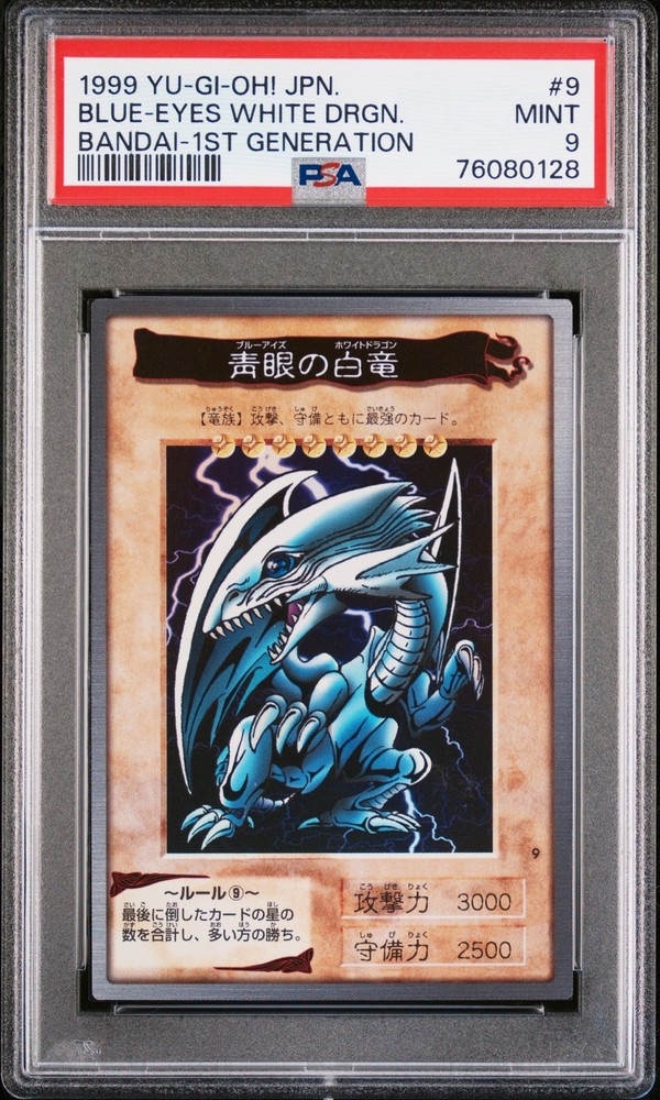 1999 YU-GI-OH! JAPANESE BANDAI-1ST GENERATION #9 BLUE-EYES WHITE DRAGON PSA 9 1999 YU-GI-OH! JAPANESE BANDAI-1ST GENERATION #9 BLUE-EYES WHITE DRAGON PSA 9 Purchase Info Thank you for your interest in this item consigned with PSA! By purchasing or making an offer on this item, you acknowledge and agree to the following terms: All sales are final. Returns not accepted. Payment must be made upon purchase of the item. All items are sold "as is" and without warranty of Collectors Universe, Inc. (d/b/a PSA), and ANY AND ALL IMPLIED WARRANTIES ARE DISCLAIMED AND EXCLUDED. Sales tax may apply depending on shipping address. PSA does not guarantee that another third-party grading company's authentication or certification of an item as genuine is correct or accurate. Neither a difference of opinion between third-party grading companies about authenticity, nor a company's subsequent reversal of its earlier authentication or certification of an item, will be a basis for rescinding a sale. Any dispute with another third-party grading company relating to the authenticity of an item must be resolved directly with that other company. Collectors' maximum liability in the event of loss or damage to an item during shipping will be the lesser of (a) the price paid for the item and (b) the change in fair market value of the item. You release Collectors from all other liability including for any claims of punitive damages, emotional distress, consequential damages, lost profits, or lost interest, except as prohibited by law. Shipping Purchased Items will be shipped directly from PSA Vault. You stay hands-free. PSA Vault When you purchase this item, you can save on sales tax and selling fees by keeping it in the PSA Vault, official Vault of eBay. Items already in PSA Vault and will be sent to PSA Vault will have no shipping charge Storage of any items with the PSA Vault will be subject to the PSA Vault Terms of Service. Consignment PSA has competitive rates on the world's largest collectibles marketplace with the option to list from the PSA Vault or immediately after PSA authentication and grading. Sale Price Under $100 $100 - $499 $500 - $999 $1,000 - $2,499 $2,500 - $4,999 $5,000+ Seller Fee 16% 14% 13% 10% 9% 7% Sellers pay a single fee as reflected above; no additional eBay fees are incurred. There is a $5 minimum fee on sold items.