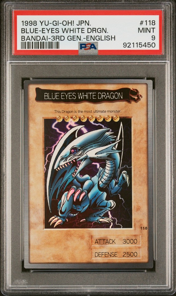 1999 YU-GI-OH! JAPANESE BANDAI-3RD GENERATION ENGLISH #118 BLUE-EYES WHITE DRAGON PSA 9 1999 YU-GI-OH! JAPANESE BANDAI-3RD GENERATION ENGLISH #118 BLUE-EYES WHITE DRAGON PSA 9 Purchase Info Thank you for your interest in this item consigned with PSA! By purchasing or making an offer on this item, you acknowledge and agree to the following terms: All sales are final. Returns not accepted. Payment must be made upon purchase of the item. All items are sold "as is" and without warranty of Collectors Universe, Inc. (d/b/a PSA), and ANY AND ALL IMPLIED WARRANTIES ARE DISCLAIMED AND EXCLUDED. Sales tax may apply depending on shipping address. PSA does not guarantee that another third-party grading company's authentication or certification of an item as genuine is correct or accurate. Neither a difference of opinion between third-party grading companies about authenticity, nor a company's subsequent reversal of its earlier authentication or certification of an item, will be a basis for rescinding a sale. Any dispute with another third-party grading company relating to the authenticity of an item must be resolved directly with that other company. Collectors' maximum liability in the event of loss or damage to an item during shipping will be the lesser of (a) the price paid for the item and (b) the change in fair market value of the item. You release Collectors from all other liability including for any claims of punitive damages, emotional distress, consequential damages, lost profits, or lost interest, except as prohibited by law. Shipping Purchased Items will be shipped directly from PSA Vault. You stay hands-free. PSA Vault When you purchase this item, you can save on sales tax and selling fees by keeping it in the PSA Vault, official Vault of eBay. Items already in PSA Vault and will be sent to PSA Vault will have no shipping charge Storage of any items with the PSA Vault will be subject to the PSA Vault Terms of Service. Consignment PSA has competitive rates on the world's largest collectibles marketplace with the option to list from the PSA Vault or immediately after PSA authentication and grading. Sale Price Under $100 $100 - $499 $500 - $999 $1,000 - $2,499 $2,500 - $4,999 $5,000+ Seller Fee 16% 14% 13% 10% 9% 7% Sellers pay a single fee as reflected above; no additional eBay fees are incurred. There is a $5 minimum fee on sold items.