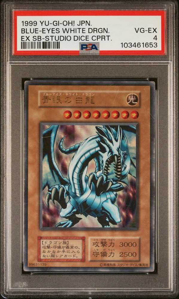 1999 YU-GI-OH! JAPANESE EX STARTER BOX STUDIO DICE COPYRIGHT BLUE-EYES WHITE DRAGON PSA 4 1999 YU-GI-OH! JAPANESE EX STARTER BOX STUDIO DICE COPYRIGHT BLUE-EYES WHITE DRAGON PSA 4 Purchase Info Thank you for your interest in this item consigned with PSA! By purchasing or making an offer on this item, you acknowledge and agree to the following terms: All sales are final. Returns not accepted. Payment must be made upon purchase of the item. All items are sold "as is" and without warranty of Collectors Universe, Inc. (d/b/a PSA), and ANY AND ALL IMPLIED WARRANTIES ARE DISCLAIMED AND EXCLUDED. Sales tax may apply depending on shipping address. PSA does not guarantee that another third-party grading company's authentication or certification of an item as genuine is correct or accurate. Neither a difference of opinion between third-party grading companies about authenticity, nor a company's subsequent reversal of its earlier authentication or certification of an item, will be a basis for rescinding a sale. Any dispute with another third-party grading company relating to the authenticity of an item must be resolved directly with that other company. Collectors' maximum liability in the event of loss or damage to an item during shipping will be the lesser of (a) the price paid for the item and (b) the change in fair market value of the item. You release Collectors from all other liability including for any claims of punitive damages, emotional distress, consequential damages, lost profits, or lost interest, except as prohibited by law. Shipping Purchased Items will be shipped directly from PSA Vault. You stay hands-free. PSA Vault When you purchase this item, you can save on sales tax and selling fees by keeping it in the PSA Vault, official Vault of eBay. Items already in PSA Vault and will be sent to PSA Vault will have no shipping charge Storage of any items with the PSA Vault will be subject to the PSA Vault Terms of Service. Consignment PSA has competitive rates on the world's largest collectibles marketplace with the option to list from the PSA Vault or immediately after PSA authentication and grading. Sale Price Under $100 $100 - $499 $500 - $999 $1,000 - $2,499 $2,500 - $4,999 $5,000+ Seller Fee 16% 14% 13% 10% 9% 7% Sellers pay a single fee as reflected above; no additional eBay fees are incurred. There is a $5 minimum fee on sold items.